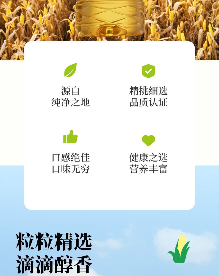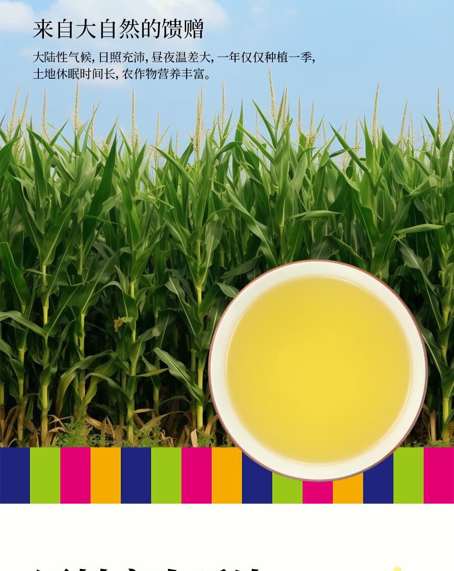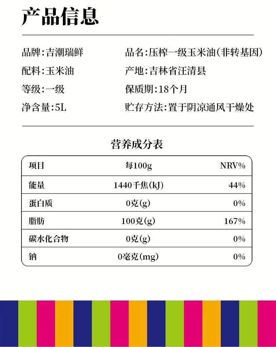 吉潮瑞鲜压榨一级玉米油(非转基)5L 配料:玉米油 等级:一级 净含量:5L 产地:吉林省汪清县 保质期:18个月 贮存方法:置于阴凉通风干燥处