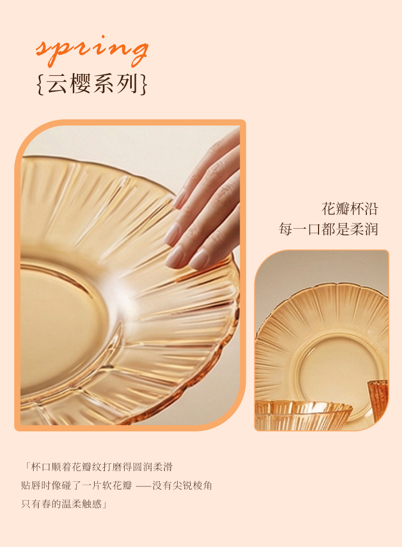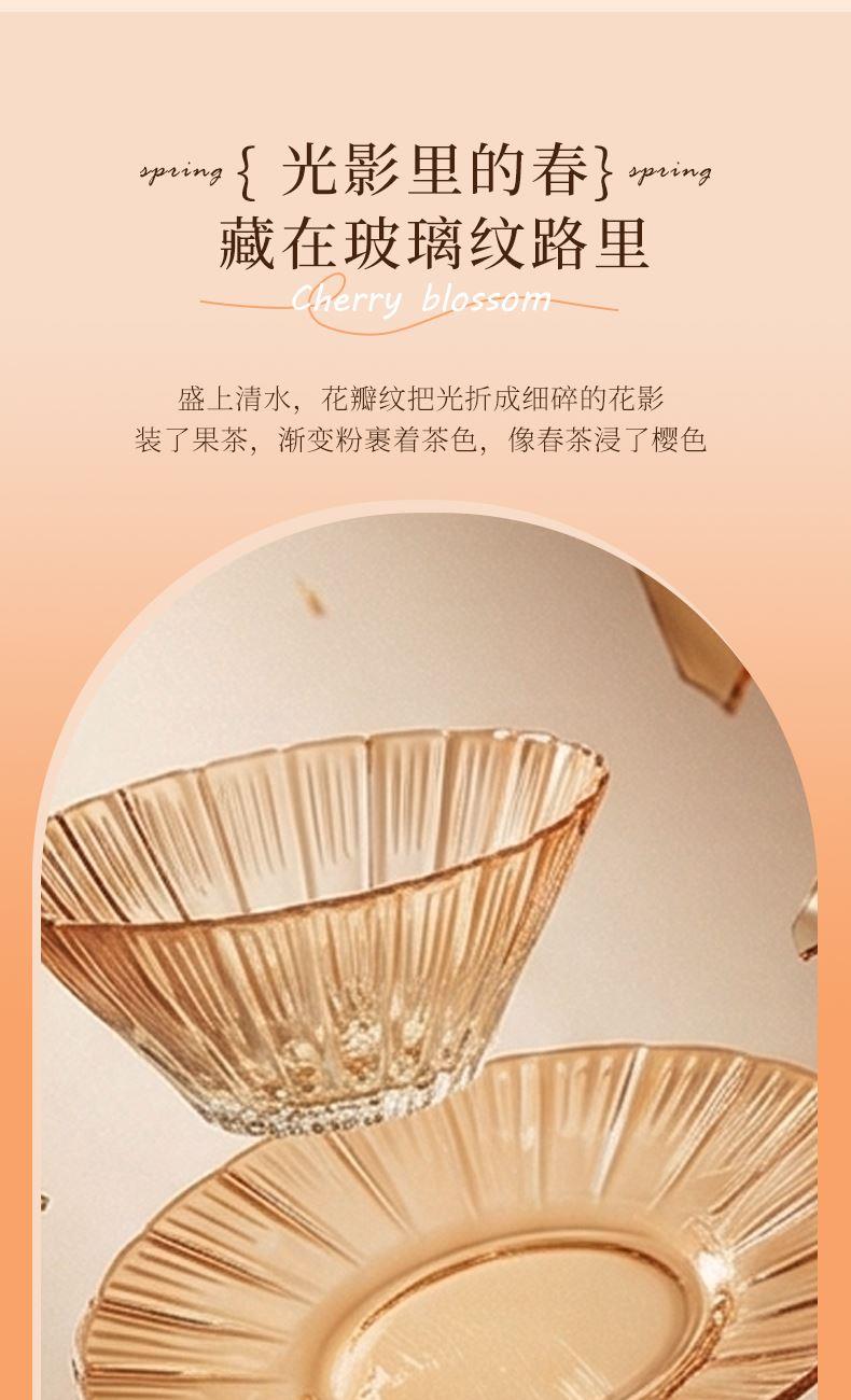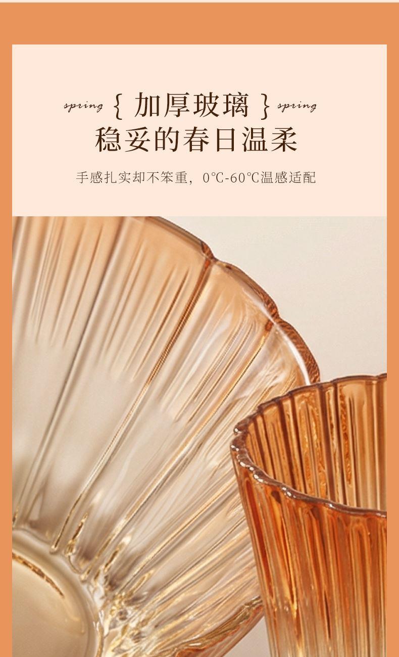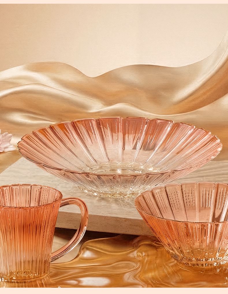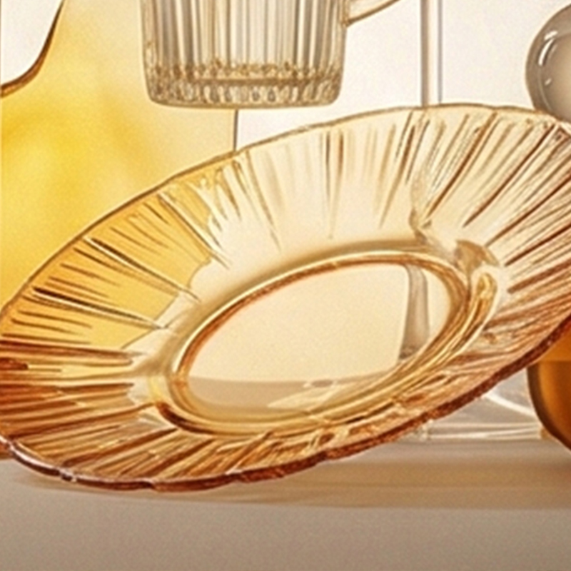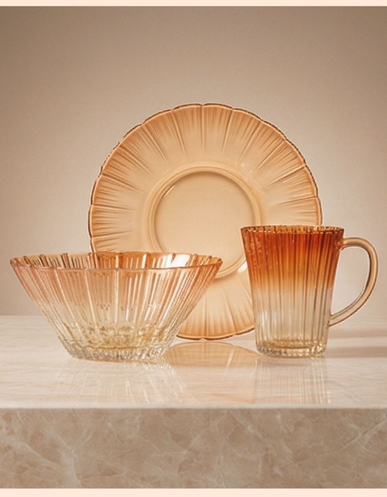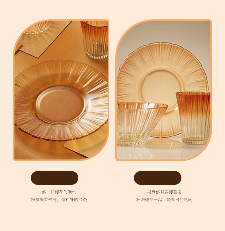 货 号:YYXL/L1 适用温度:0°C-60°C 材 质:钠钙玻璃 产品参数:果盘247*54mm 产品卖点:1.采用温暖的高颜值渐变玻璃工艺,色彩从深到浅过渡自然。 2.多元场景,点亮精致生活一套包含水杯、沙拉碗和点心盘,轻松驾驭各种日常需求。 3.高颜值玻璃餐具上市发售咯,复古竖纹搭配高 级琥珀渐变,自带轻奢氛围感。