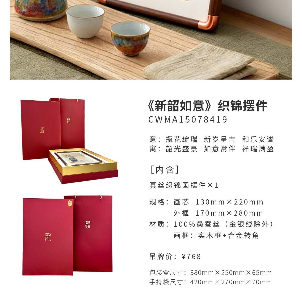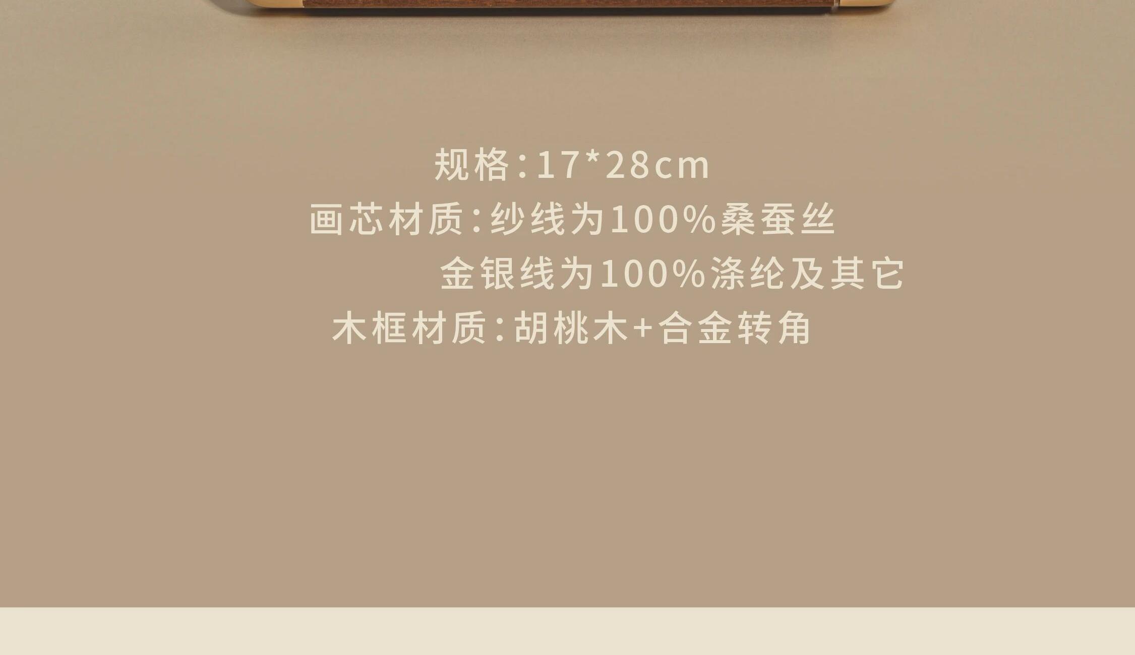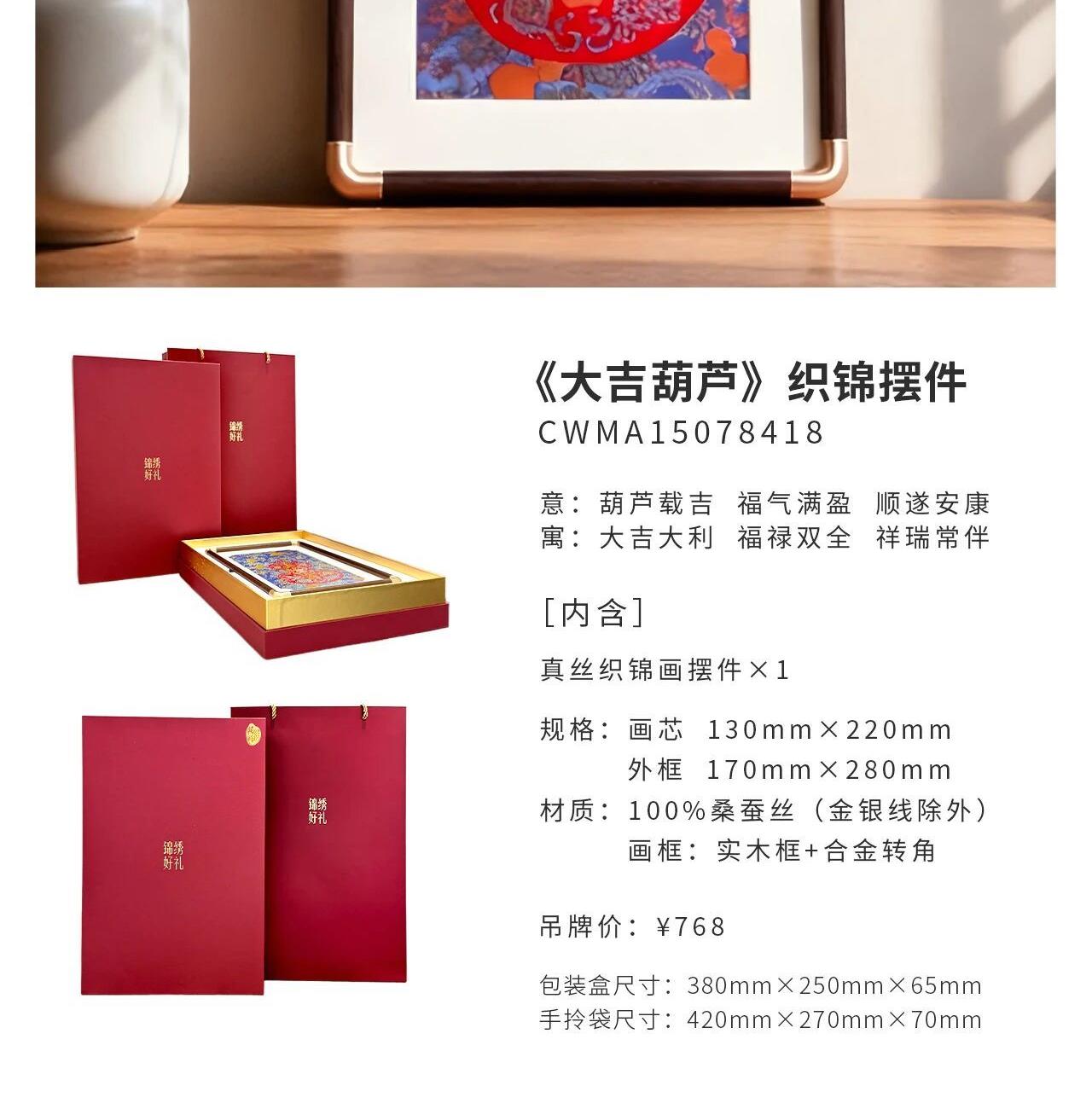 [内含] 真丝织锦画摆件 Ⅹ 1 规格:画芯130mm×220mm 外框170mm×280mm 材质:100%桑蚕丝(金银线除外) 画框:实木框+合金转角 包装盒尺寸:380mm×250mm×65mm 手拎袋尺寸:420mm×270mm×70mm