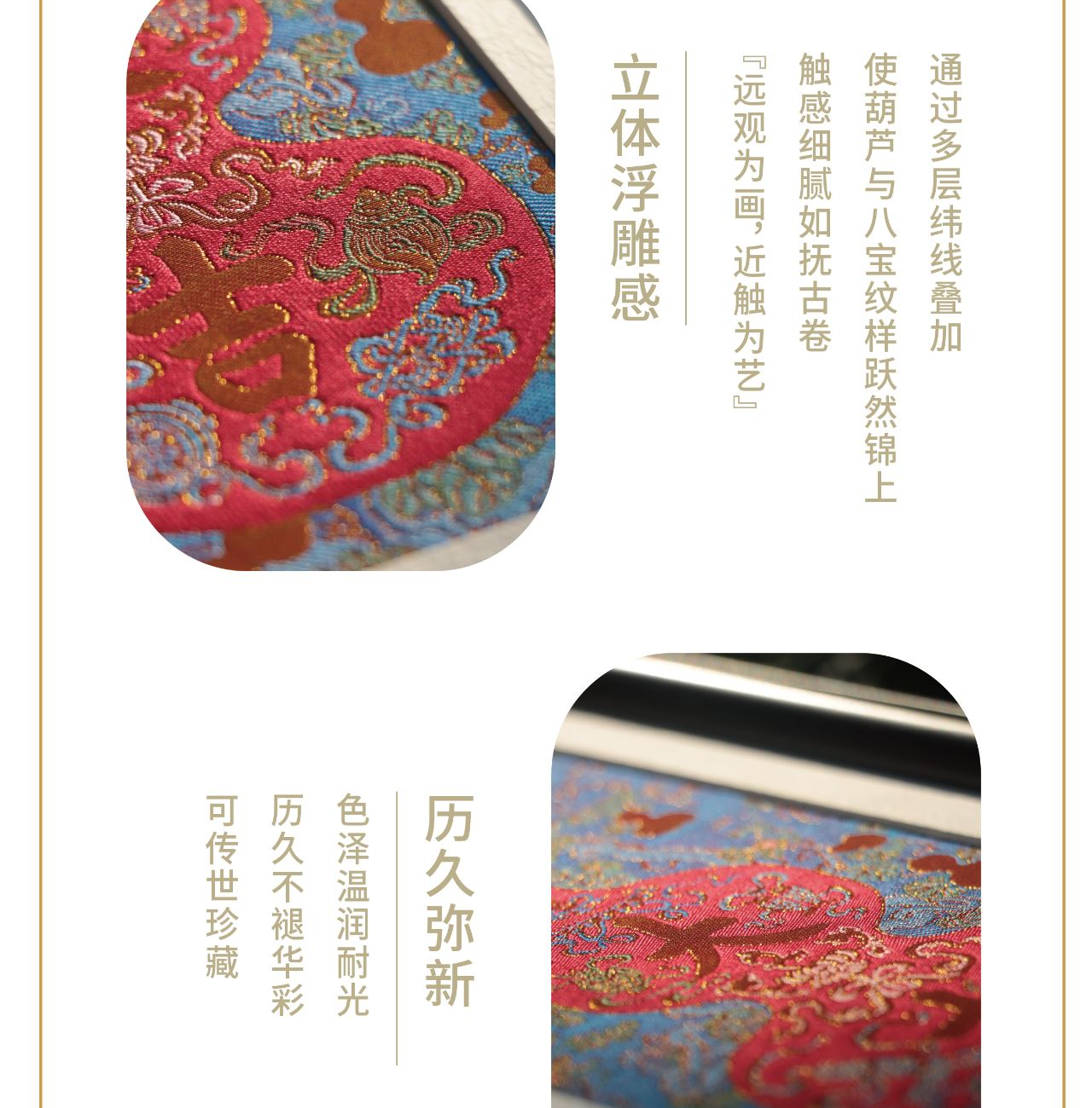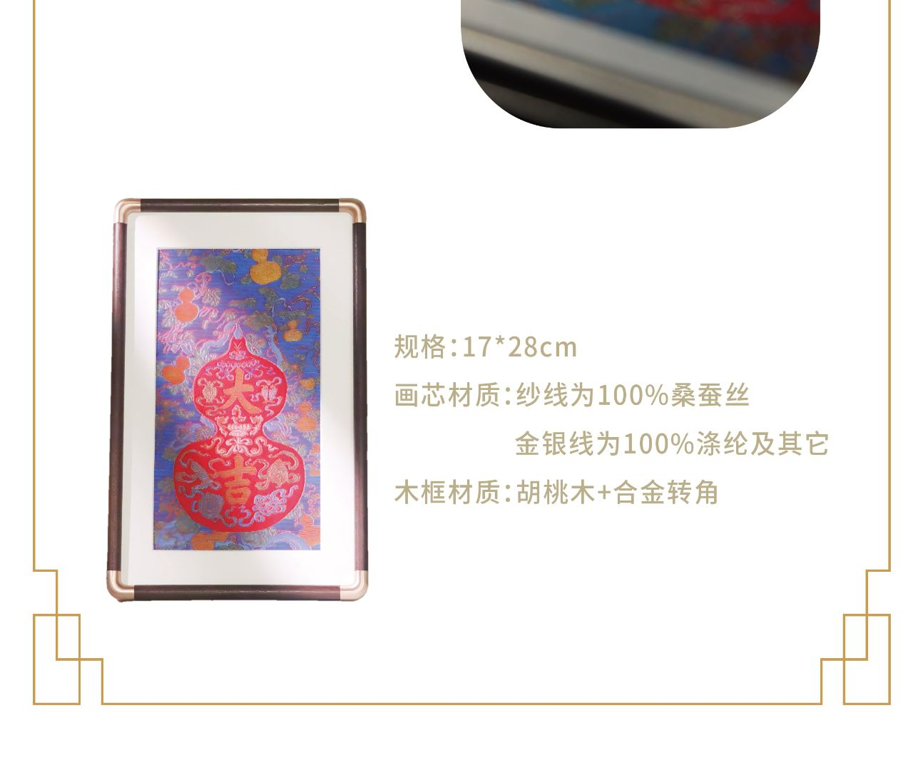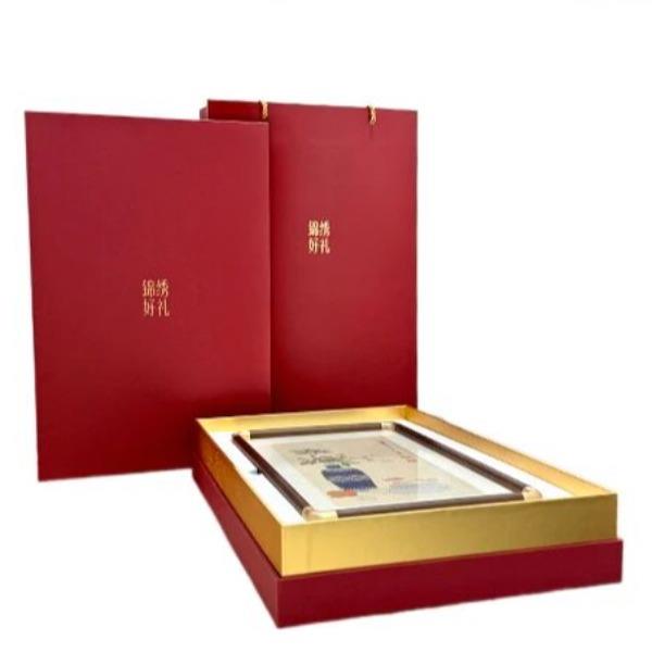 [内含] 真丝织锦画摆件 Ⅹ 1 规格:画芯130mm×220mm 外框170mm×280mm 材质:100%桑蚕丝(金银线除外) 画框:实木框+合金转角 包装盒尺寸:380mm×250mm×65mm 手拎袋尺寸:420mm×270mm×70mm