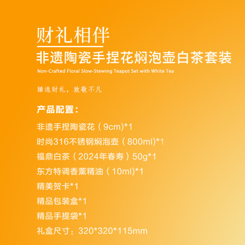 【产品配置】 非遗手捏陶瓷花(9cm)*1 时尚316不锈钢焖泡壶(800ml)*1 福鼎白茶(2024年春寿)50g*1 东方特调香薰精油(10ml)*1 精美贺卡*1 精品包装盒*1 精品手提袋*1 【产品说明】 非遗手捏陶瓷花+316 不锈钢焖泡壶,工艺与实; 臻选 2024 春寿福鼎白茶,茶品优质; 东方特调香蒸精油,多维度感官体验; 财礼主题包装,适配商务与新年礼赠; 多品类组合,礼盒精致有档次。