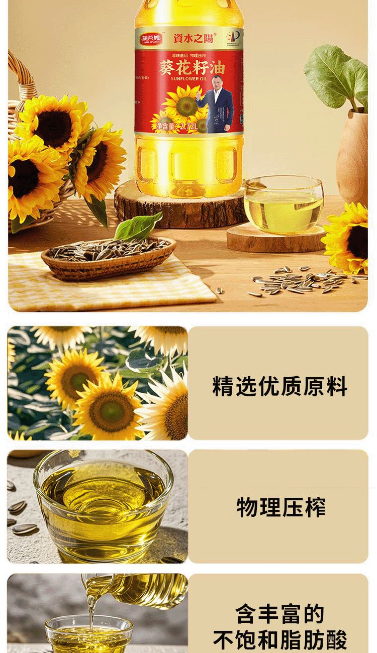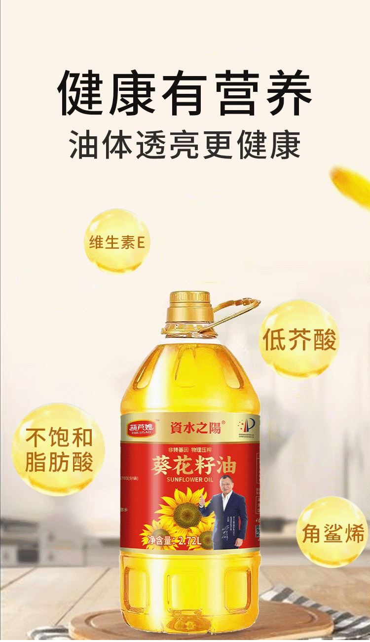 配置:2.72L葵花籽油 一件代发“” 彩盒尺寸:14*14*33cm 产品规格:3kg/1瓶/盒 集采: 外箱尺寸:40*40*33cm 产品规格:24kg/9瓶/箱