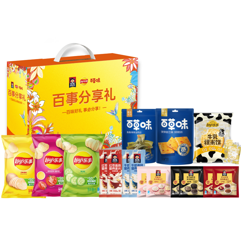 乐事薯片40g*3包(口味随机) 桂格黑芝麻黑米食养燕麦片30g*2 桂格红豆红枣食养燕麦片30g*2 桂格生椰薏仁食养燕麦片30g*2 桂格牛奶高钙燕麦片30g*2 桂格红枣高铁燕麦片30g*2 乐事牛乳裸米饼 60g *1 百草味海带结80g*1 百草味鱼豆腐75g*1