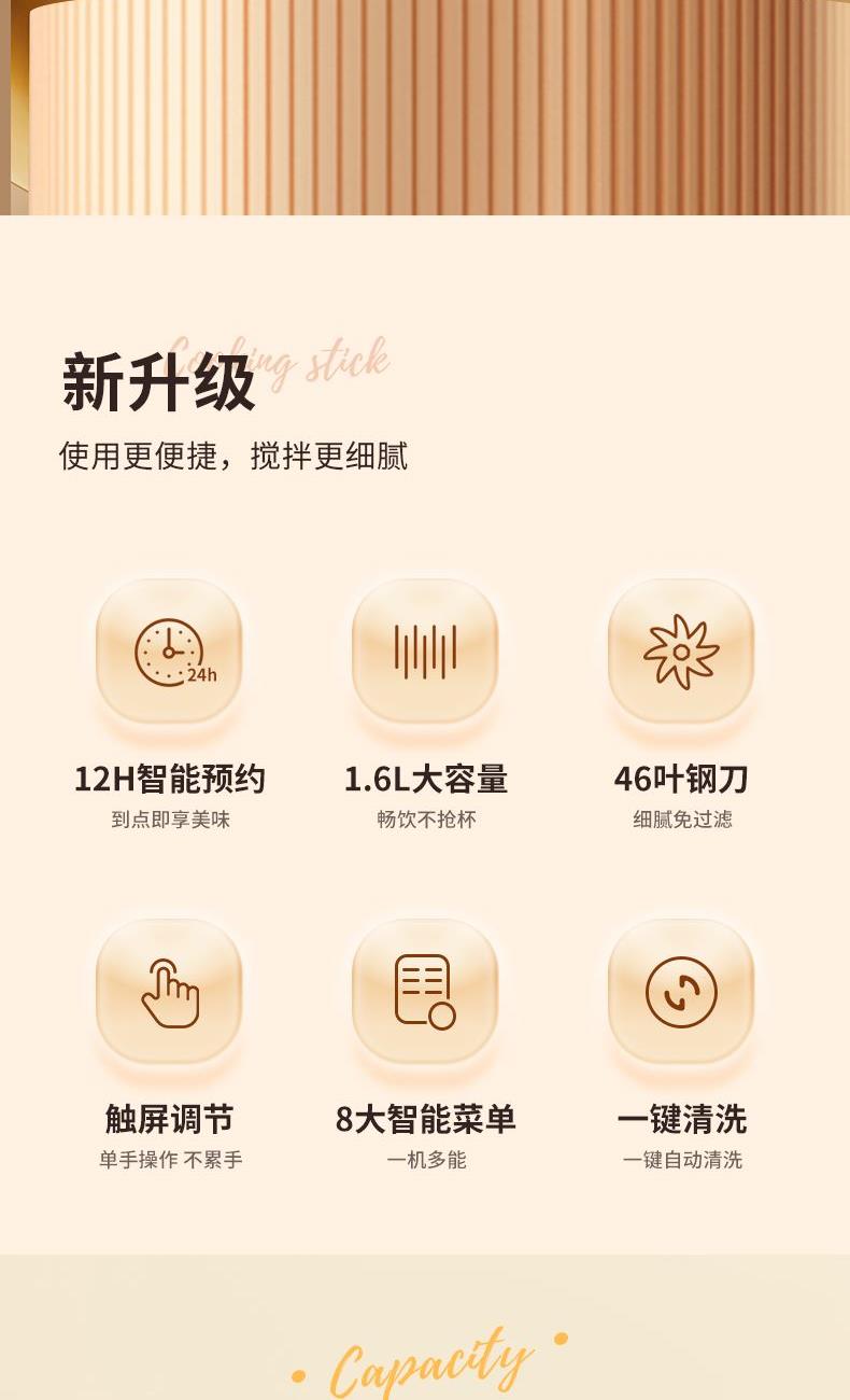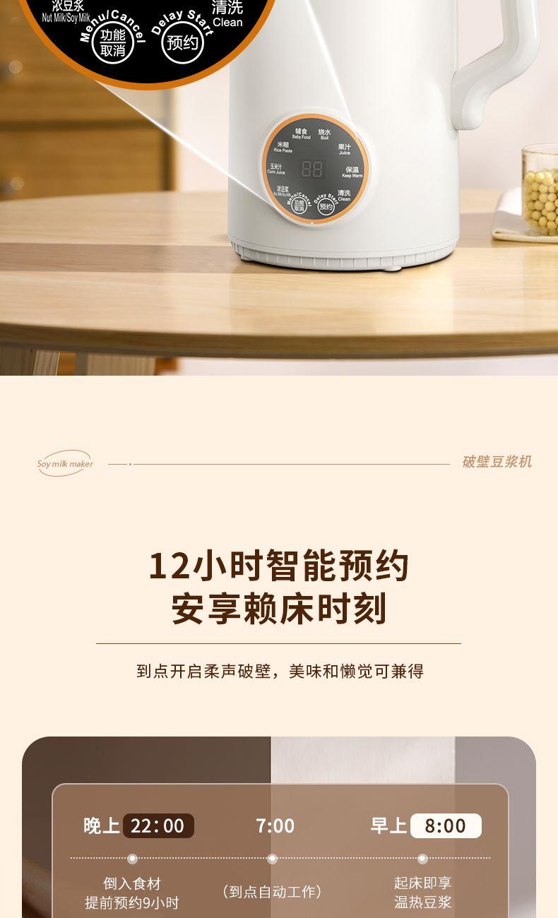 2、12智能预约,1.6L大容量免泡豆免过滤,满足全家人的餐桌需求