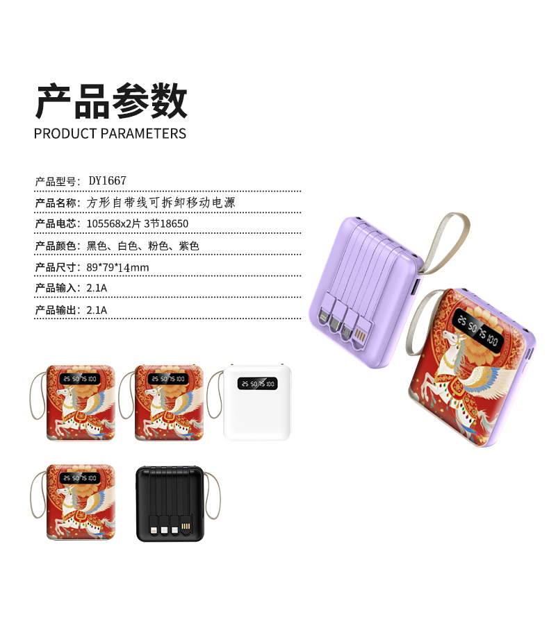 型号:DY1667 条码:6974230742532 颜色:黑、白、粉、紫 材质:PC+ABS容量:10000毫安 产品尺寸: 8.9*7.9*1.4cm