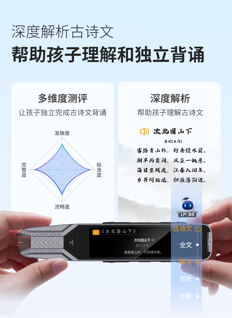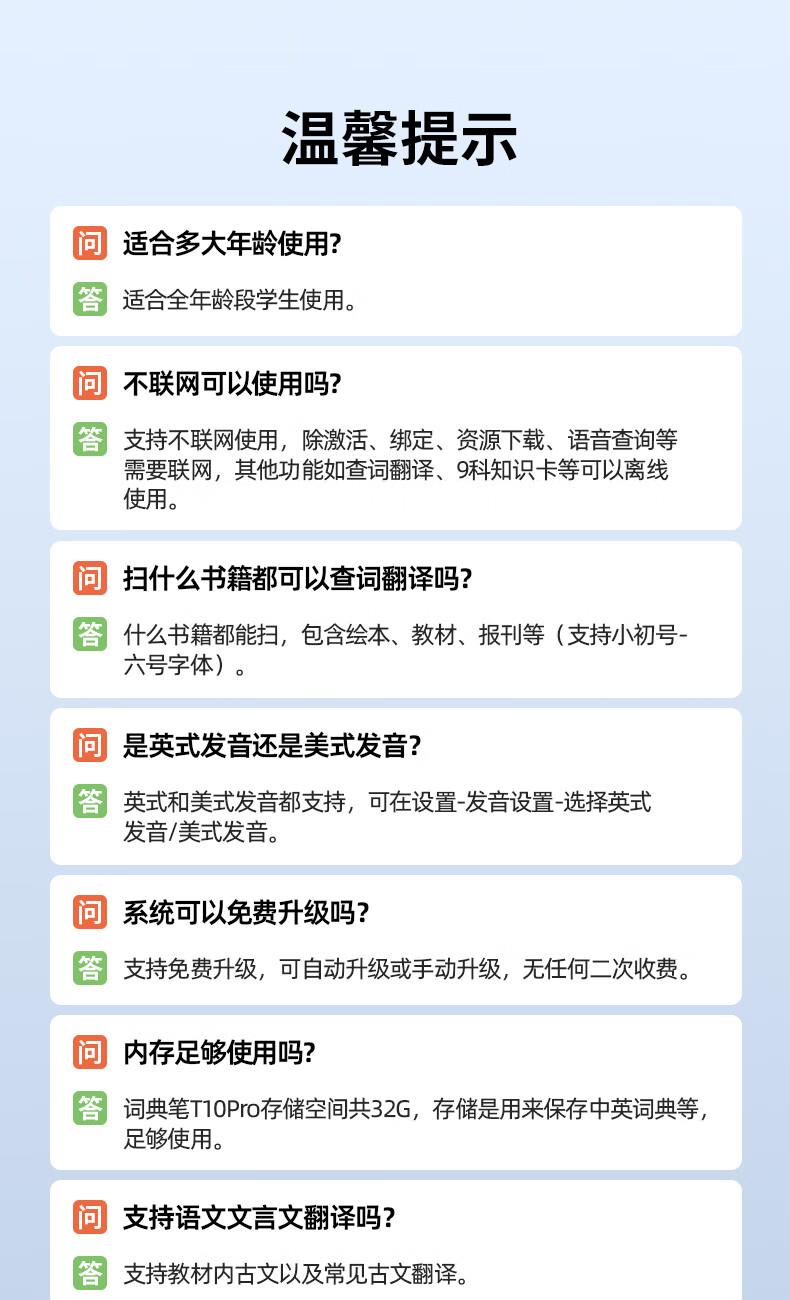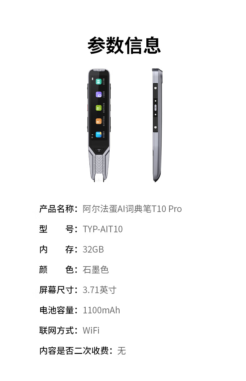 屏幕尺寸:3.71英寸 适用人群:中学生 内置语言:全科学习,汉英双语 类型:笔形词典 认证型号:TYP-AIT10 存储媒介:不支持存储媒介 型号:TYP-AIT10 功能:离线查词;英汉查词;口语练习 色系:灰色系 国补备案型号:TYP-AIT10 存储类型:内置存储 耳机接口:无 电池容量:1100mAh 电池类型:锂电池 内存容量:32GB