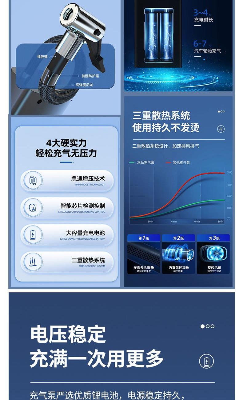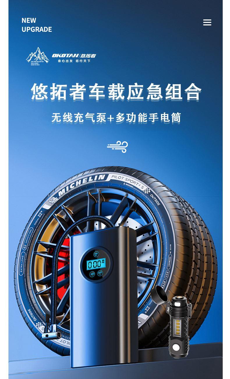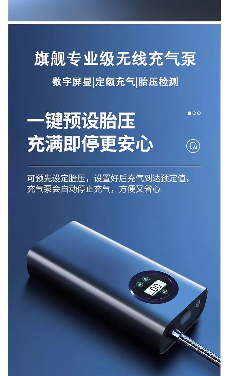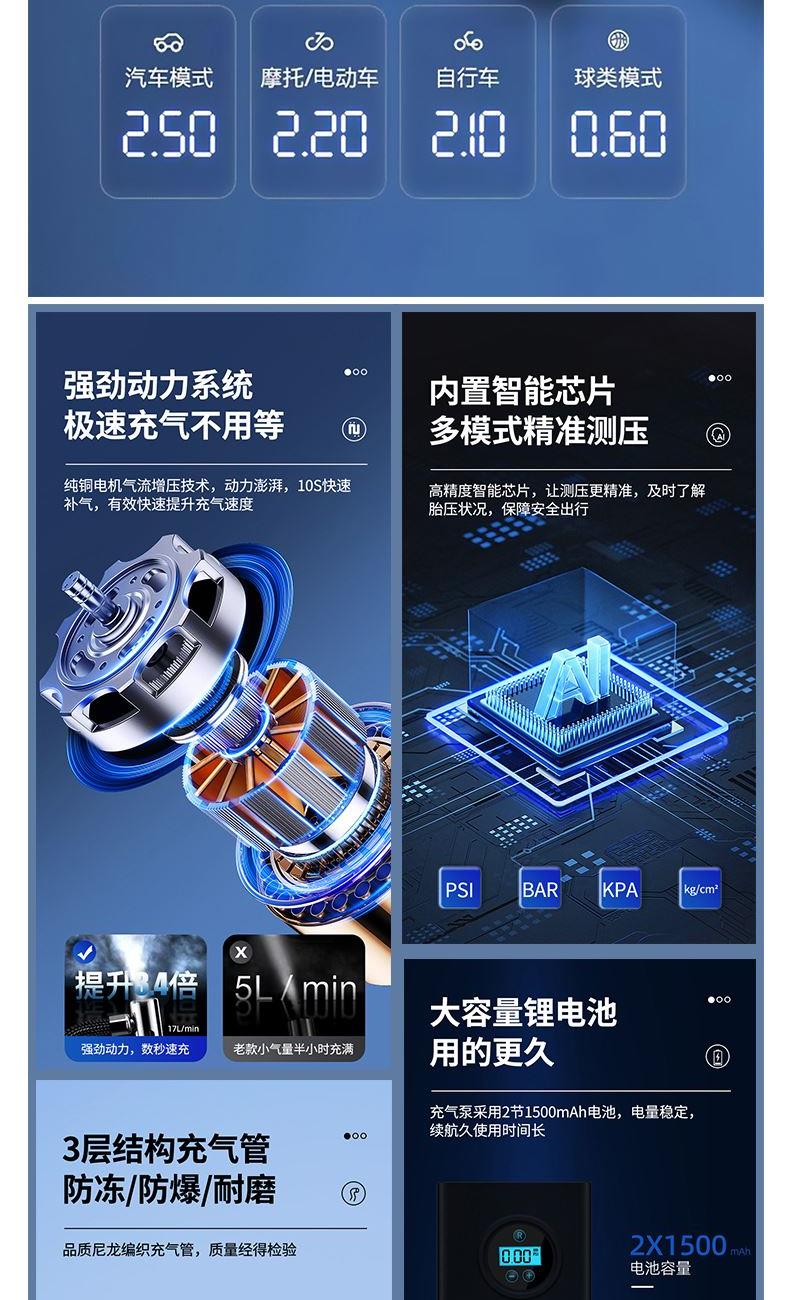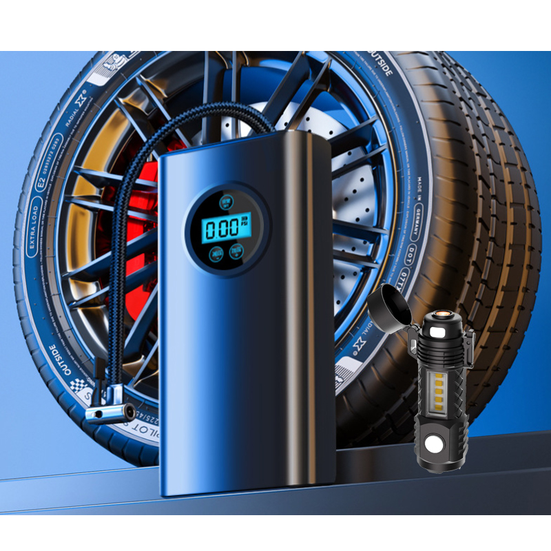 气泵款式分类:指针款 电池容量:1800毫安5C电池*2 额定电压:7.4V 额定功率:120W 气压流量:17L/min 产品尺寸:8.5*4.8*18cm 三合一充电应急灯: 光源形式:LED 射程:200-500米 产品尺寸:10.8*3*3cm 功能:COB侧灯+应急照明+电丝防风点火 产品特点: 1、急速增压技术。 2、智能芯片检测控制。 3、大容量充电电池。 4、三重散热系统。 5、汽车、自行车,摩托车,球类均可使用。
