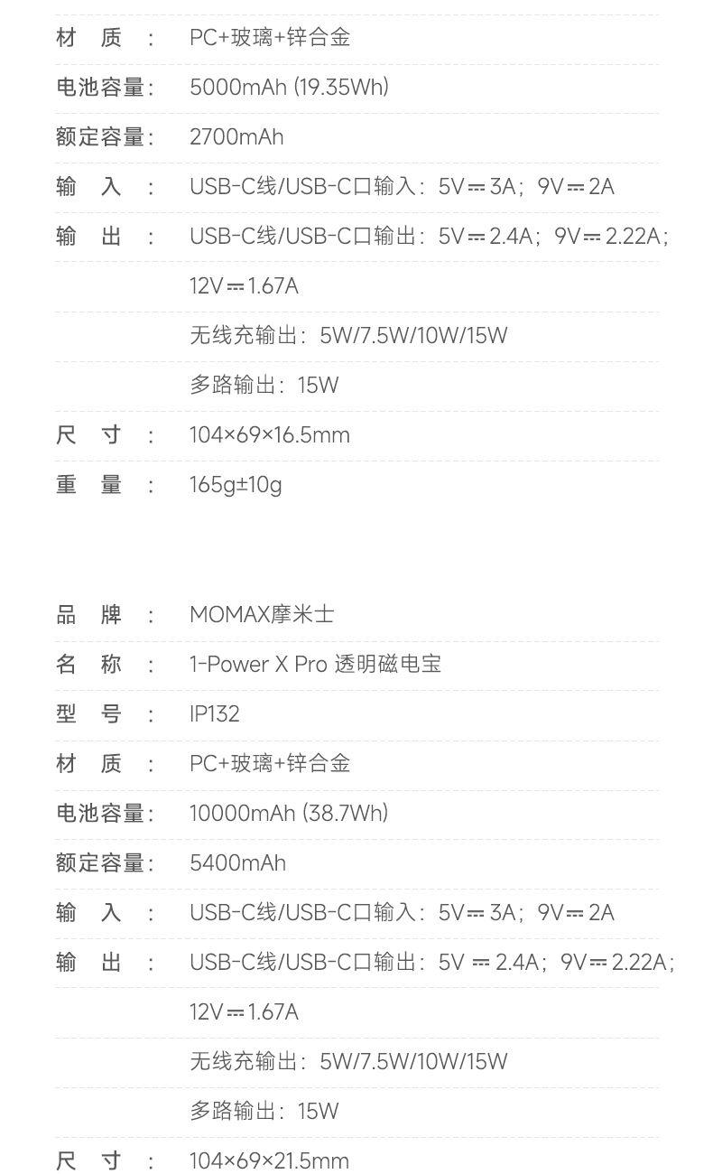 USB-C线/USB-C口输出:5V⎓2.4A;9V⎓2.22A;12V⎓1.67A