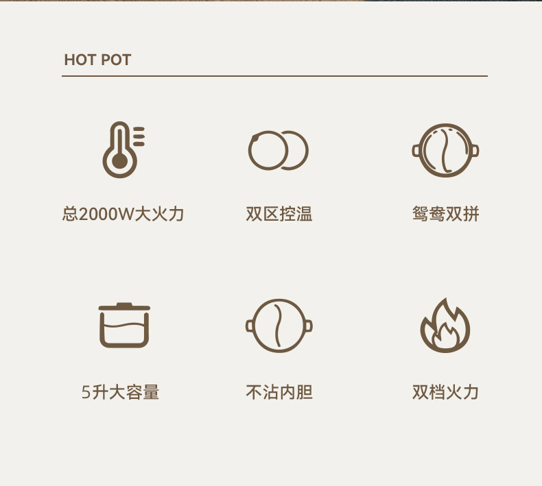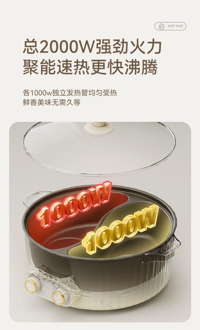 功率:2000W 电压:220V 容量:5L 毛重:2.5Kg 材质:外壳PP+食品级不粘水性涂层 彩盒包装尺寸:351*200*352mm 外箱包装尺寸:712*410*365mm 推荐理由: 1、5升大容量,满足全家所需 2、双开关分区独立控温,单独运作互不干扰 3、不粘锅内胆,清洗好方便 4、2000W大火力,更快沸腾更方便 5、全新升级,独立发热盘 6、自动控温检测,防干烧保护