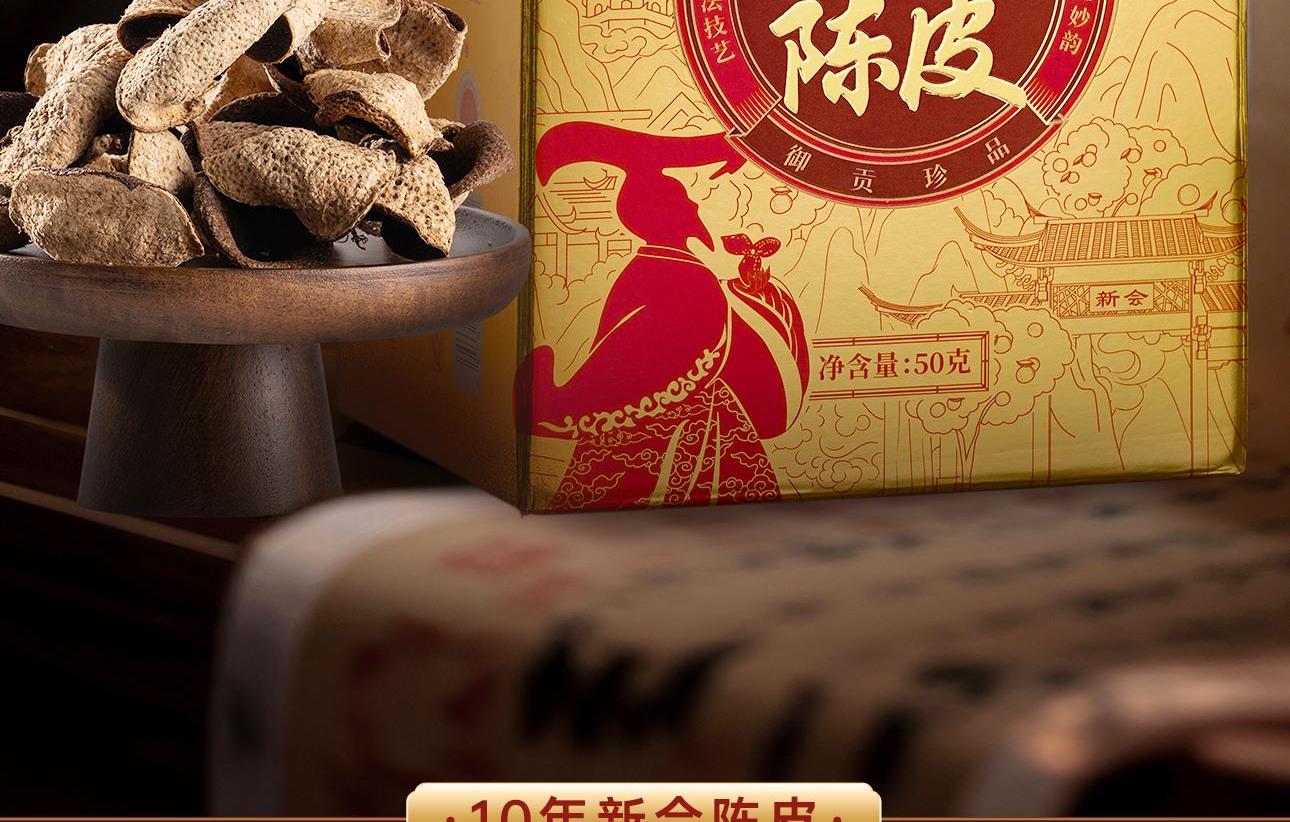 原料选的是新会陈皮核心产区梅江村圈枝柑老树大红皮,后经阳光生晒、十余年自然干仓陈存转化而制成,具有色、香、味俱佳,品质天然,历久弥珍的特点。