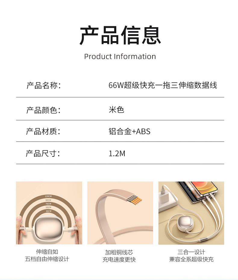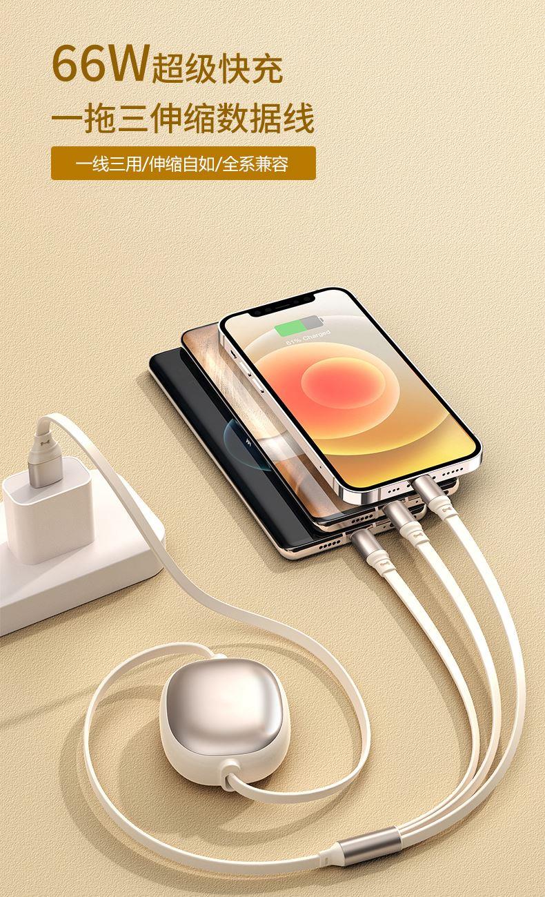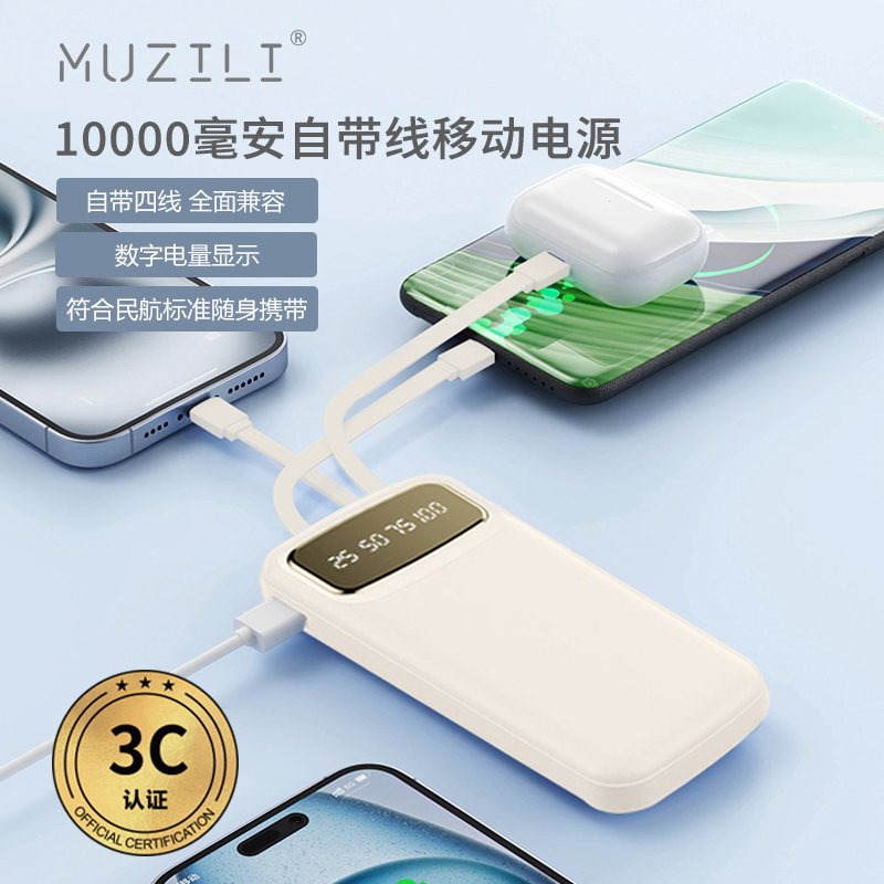 1、一万毫安自带四线移动电源 数字电量显示 内置四线 满足不同手机 3C符合民航局标准,可随身携带 2、66W铝合金超级快充一拖三伸缩数据线 兼容苹果15系列 五档伸缩调节 1.2米长度设计 铝合金面盖 三种充电接口满足各种手机