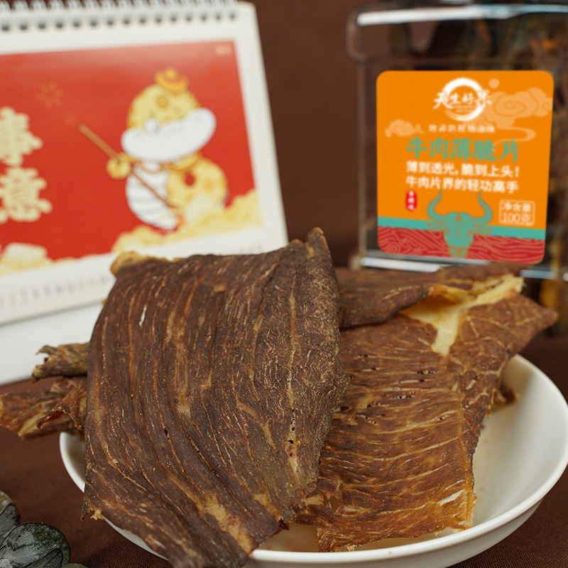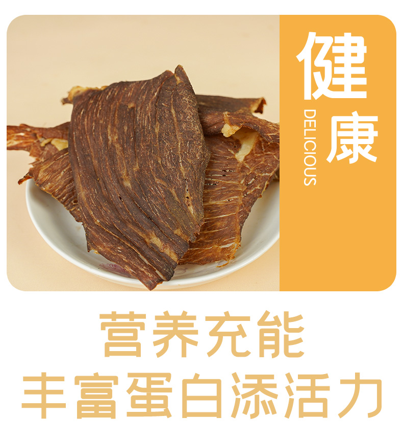 原切整片肉,鲜烤薄脆,肉眼可见的牛肉纹理,低温智能变温烘烤,锁住营养,口感香脆。