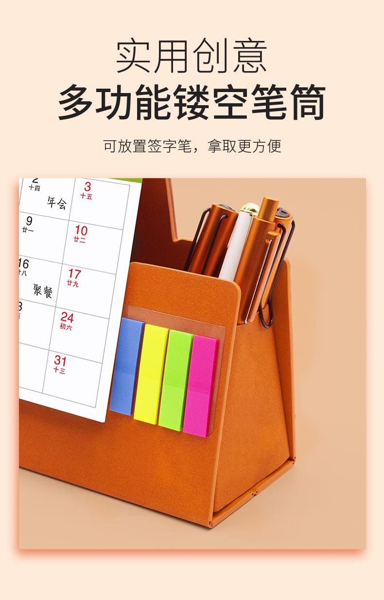 台历尺寸:27*8*19.5cm 内芯尺寸:20.8*14.8cm 广告位:23*2.5cm 包含:13张内芯+五色PET每色25张+PU台历架子