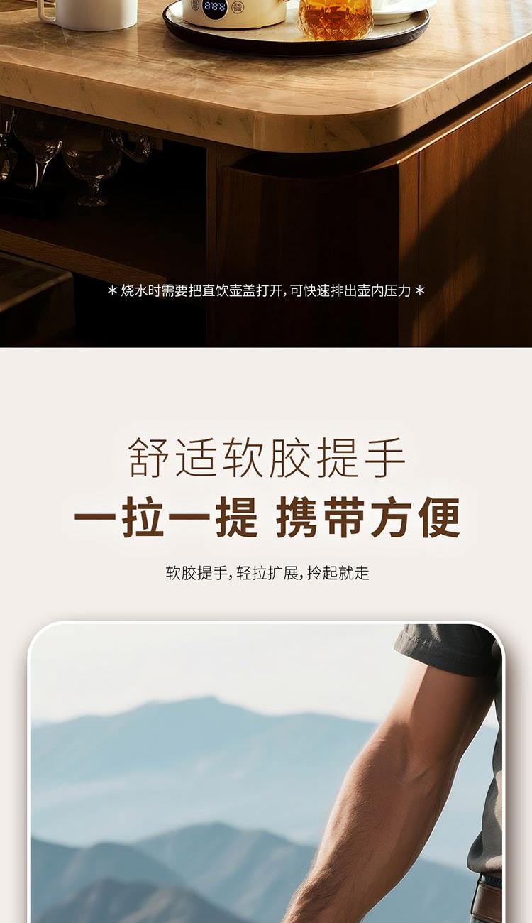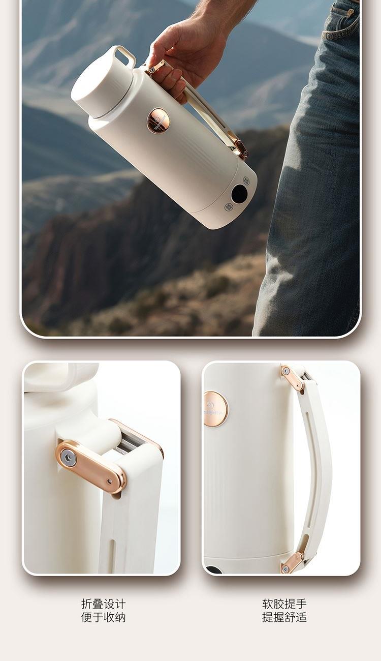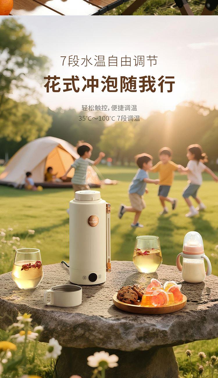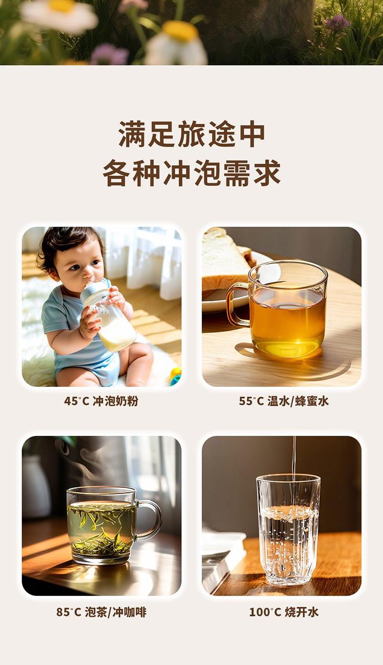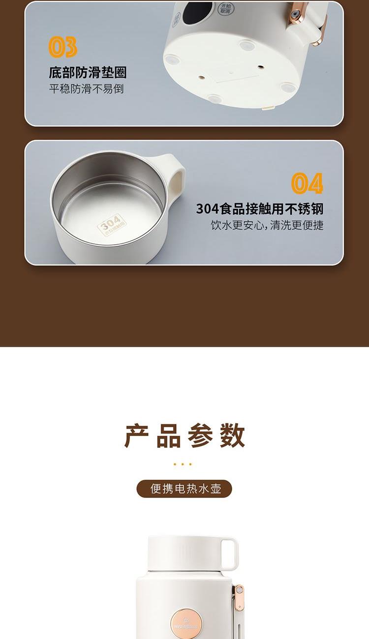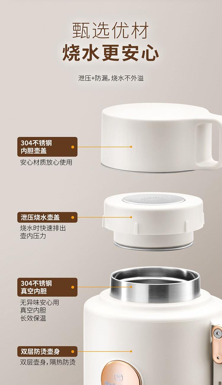 产品规格: 额定电压:220V~50Hz 额定功率:800W 额定容量:1L 内胆材质:304不锈钢 操作方式:触控式 产品颜色:米白色 产品特点: 1000ml大容量,满足家庭出行热饮; 35~100℃ 7段水温自由调节,便携调温; 800W大功率发热盘,快速烧水不久等; 304不锈钢内胆,饮水更安心; 双层壶身设计,隔热防烫; 一壶双盖,可当水杯的壶盖,方便实用。