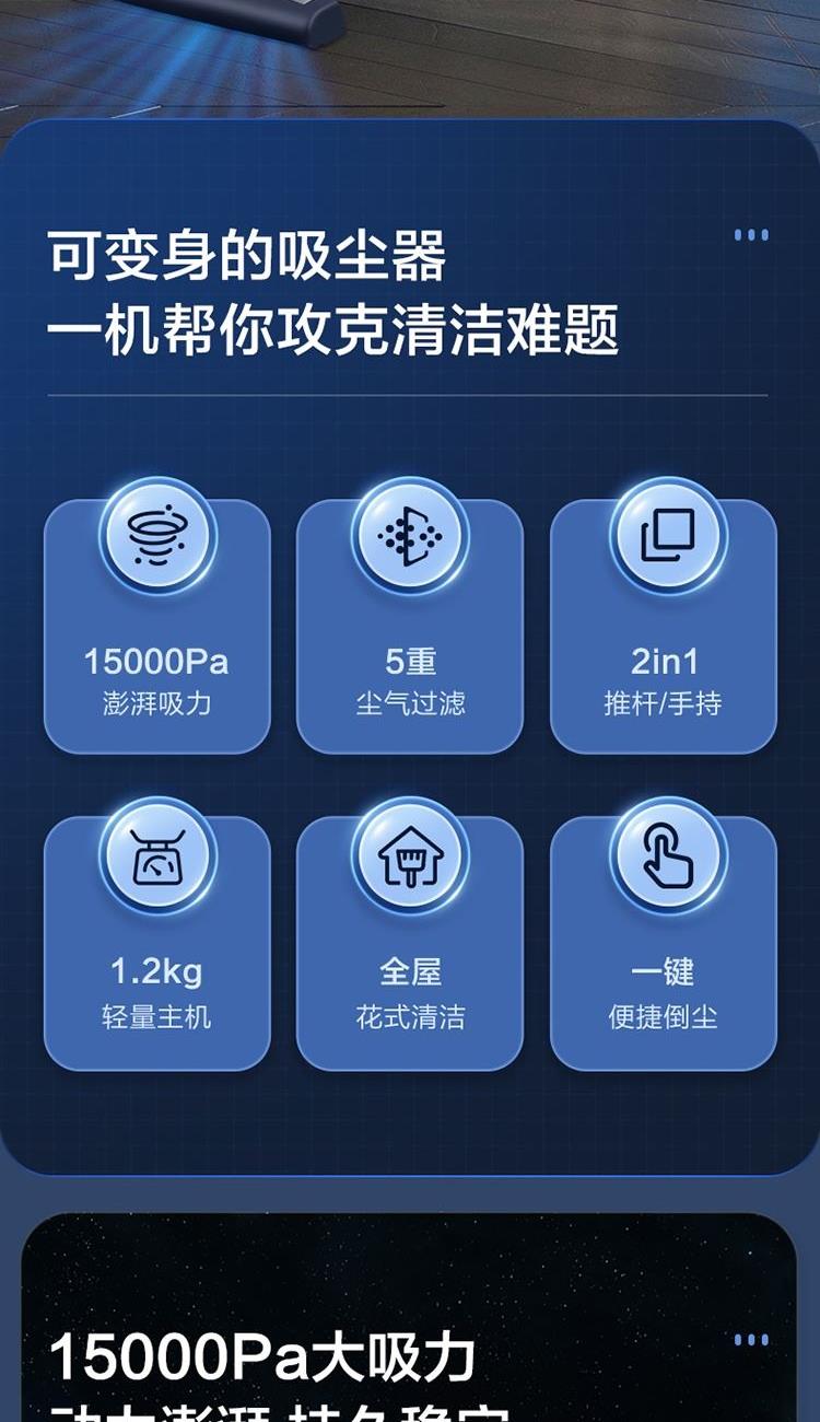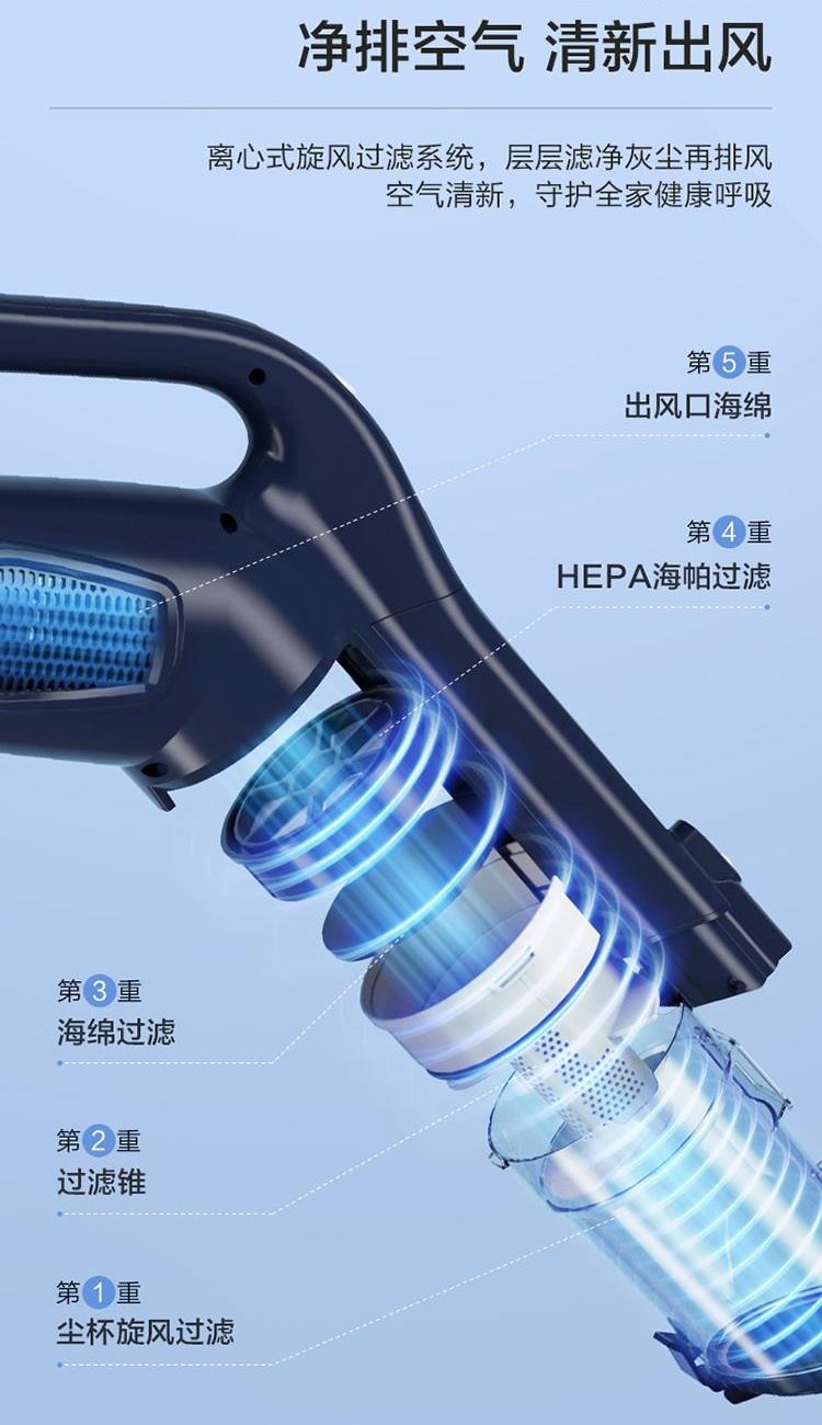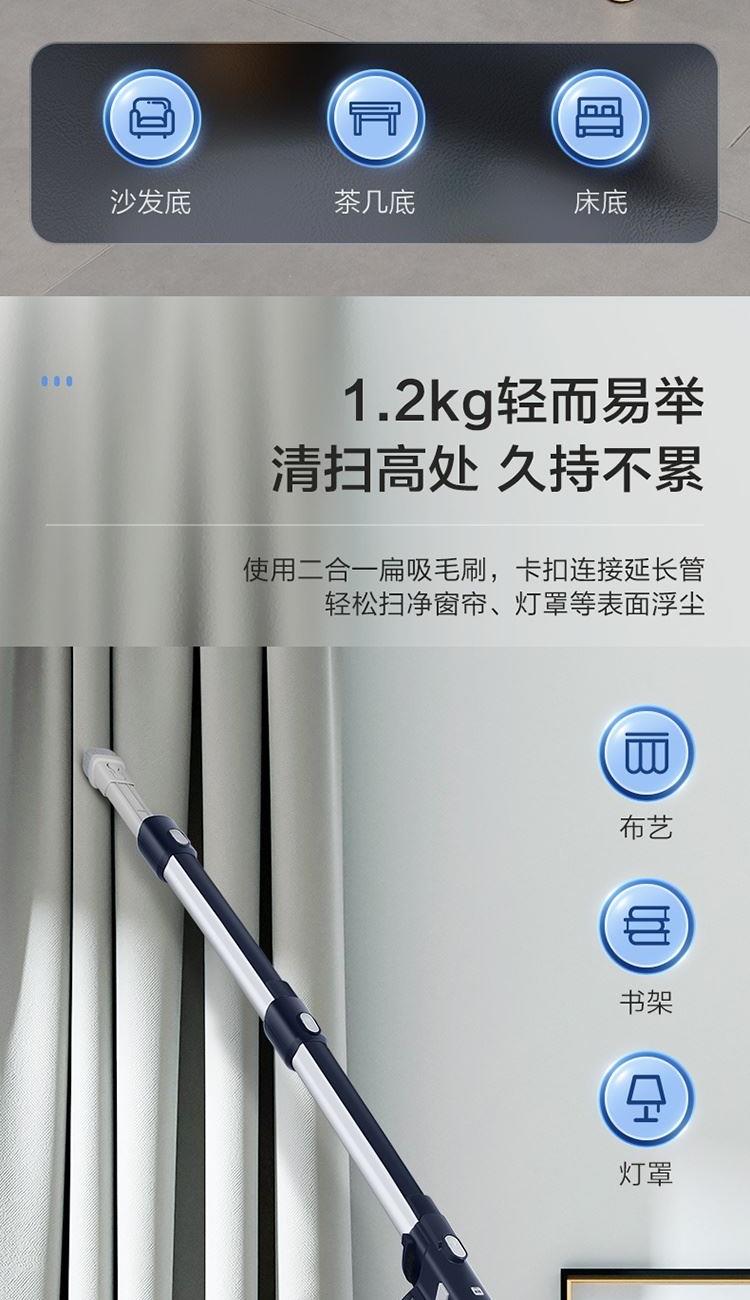 功率:450W 真空度:15kpa 重量(含包装):2.8 包装尺寸(长/深):365*140*518mm 配件:1.主机2.墙挂3.毛刷4.长扁吸5.地刷6.延长管 1.、360° 旋风大吸力,450W高速电机,15kPa真空度强劲吸尘 2、 5重强效过滤,锁定灰尘,轻松洗净 推杆&手持二合一 ,配备多刷头多场景使用(地面、窗帘、沙发、灯罩、汽车座椅、桌面等) 3、 0.5L大容量尘杯,滤网滤芯等可水洗,重复使用