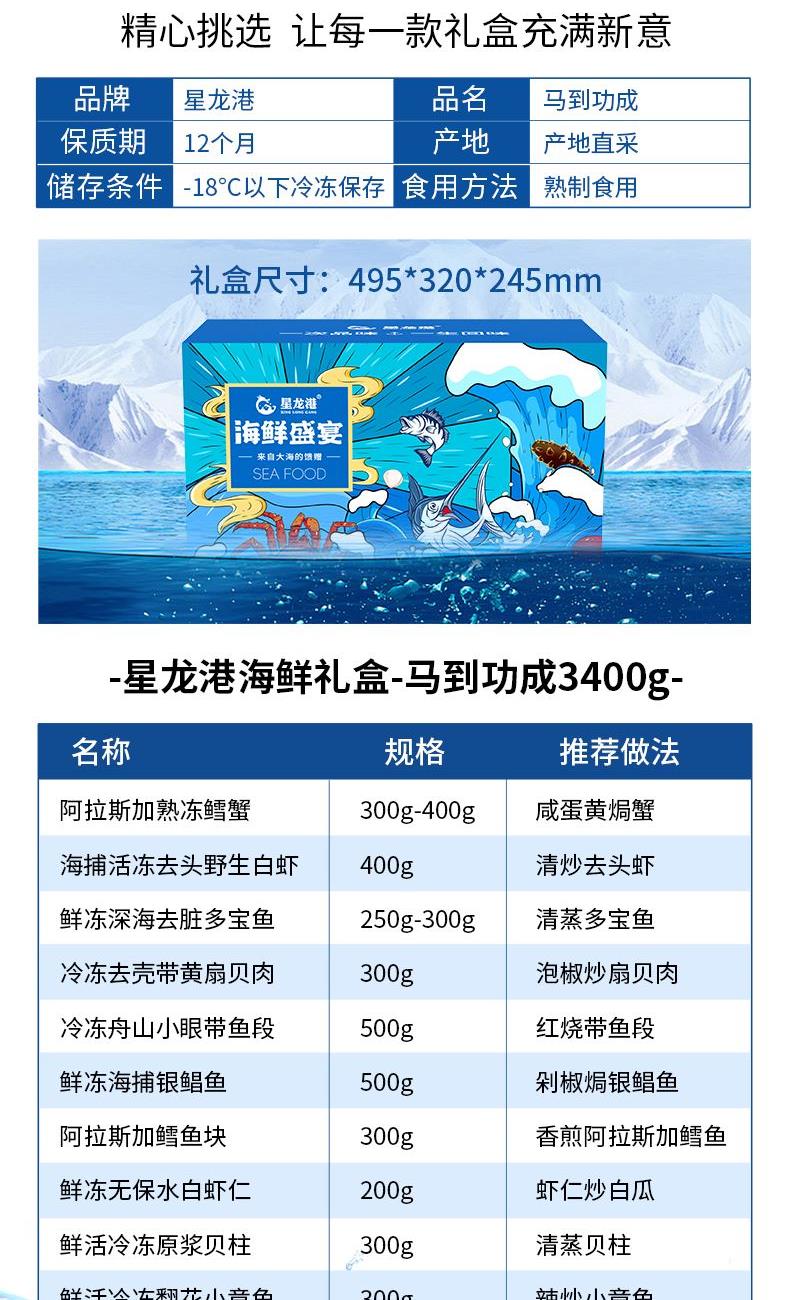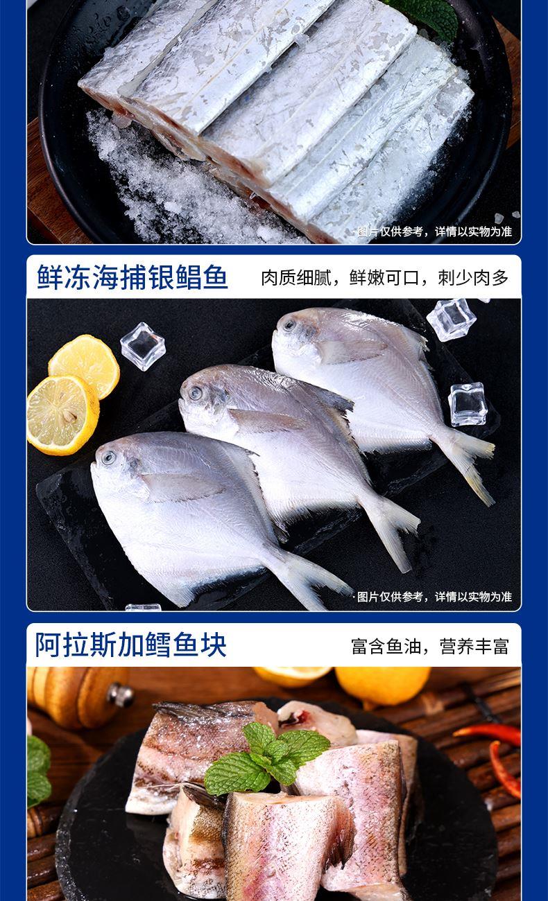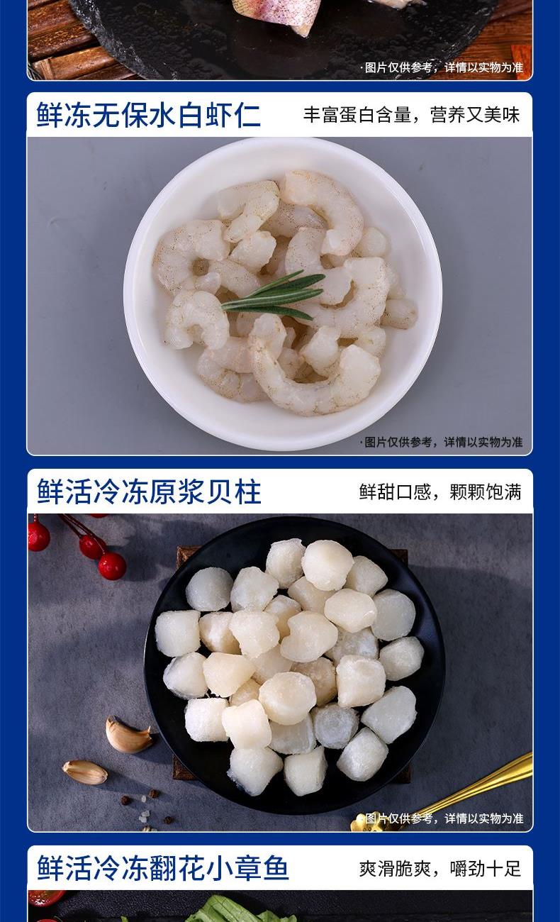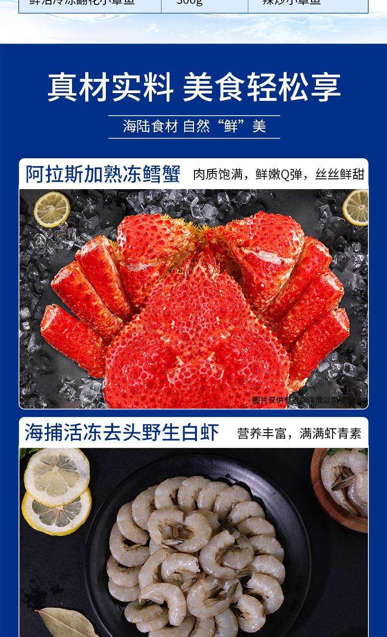 阿拉斯加熟冻鳕蟹300g-400g 海捕活冻去头野生白虾400g 鲜冻深海去脏多宝鱼250g-300g 冷冻去壳带黄扇贝肉300g 冷冻舟山小眼带鱼段500g 鲜冻海捕银鲳鱼500g 阿拉斯加鳕鱼块300g 鲜冻无保水白虾仁200g 鲜活冷冻原浆贝柱300g 鲜活冷冻翻花小章鱼300g