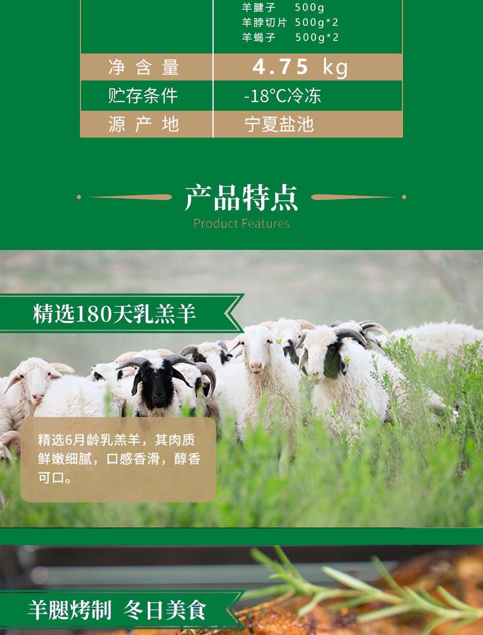 配置: 羊后腿 1750g 羊寸排 500g 羊腱子 500g 羊脖切片 500g*2 羊蝎子 500g*2 一方水土,养育一方特色滩羊盐池滩羊食百草 “吃中草药 (甘草、苦豆子)喝弱碱水"长大的羊。 中和体内酸性,使得肉质鲜嫩细腻,脂肪分布均匀原切滩羊羊肉不腥不膻。 宁夏盐池县 自然环境优异,气候冬长夏短 日照充足, 土地呈盐碱化,使得水源呈弱碱性, 盐池草原呈半沙漠化,其中含名贵中草药约110种左右 新鲜屠宰,保证肉质鲜美!