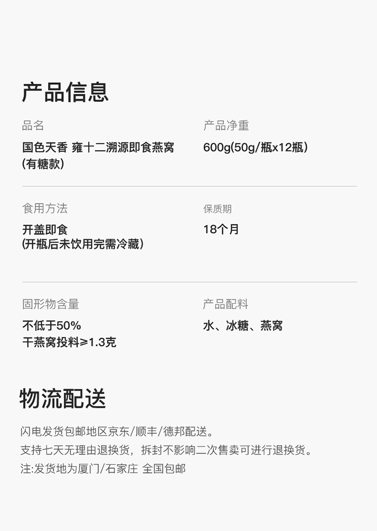 产品规格:即食燕窝50g*12瓶 固形物含量≥50%/瓶 干燕窝投料≥1.3克。 配料表:水、冰糖、燕窝 食用方法:开盖即食(开瓶后未饮用完需冷藏保存) 净含量:600克/盒 保质期:18个月 储存方法:存放于通风干燥处