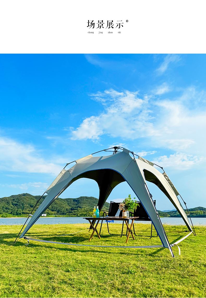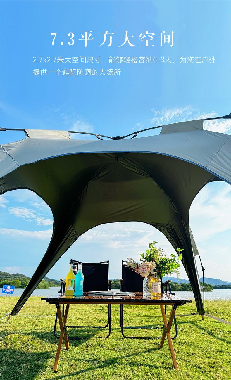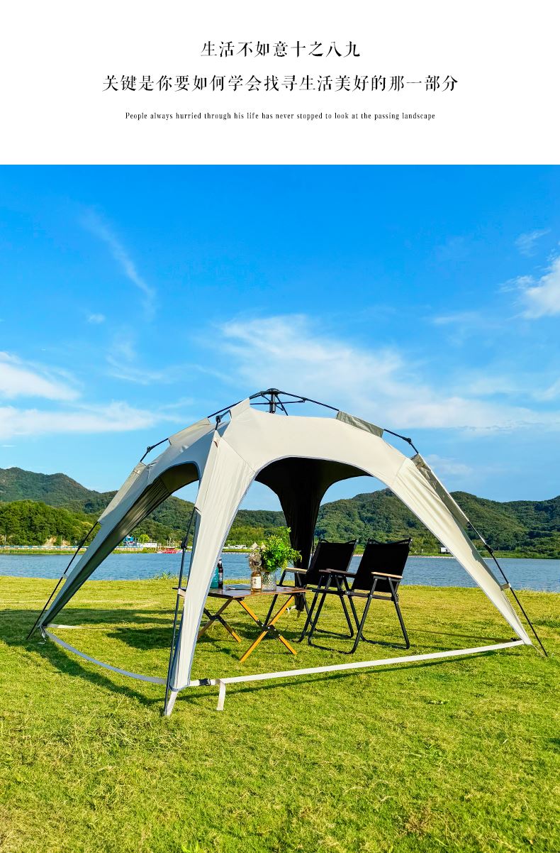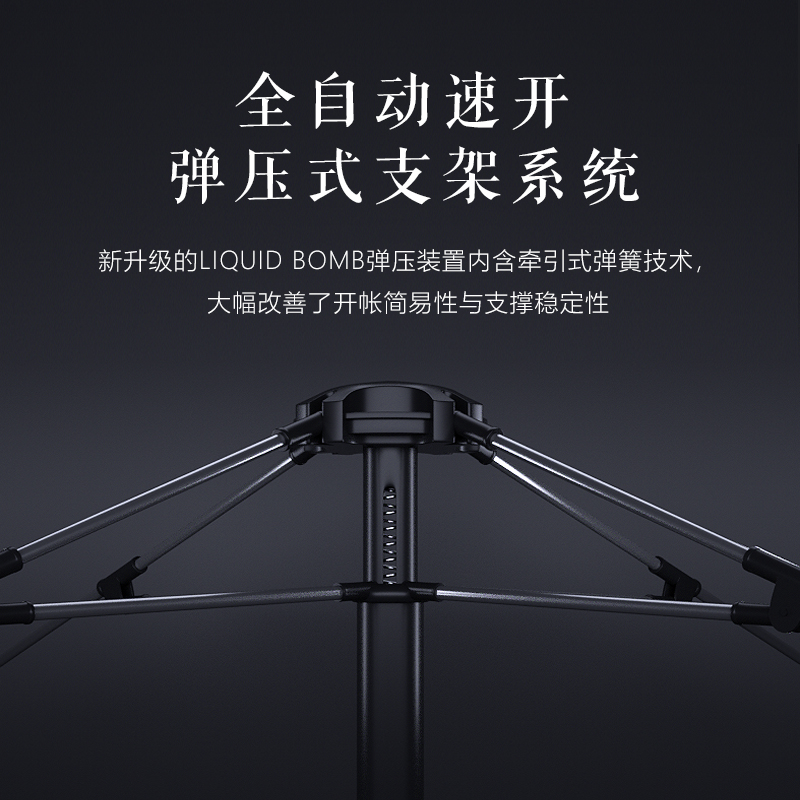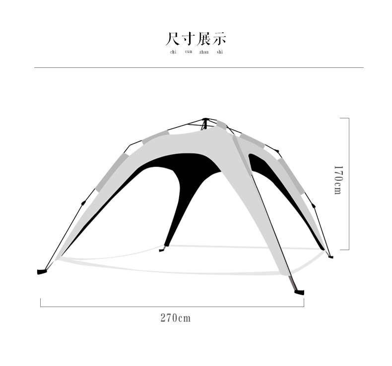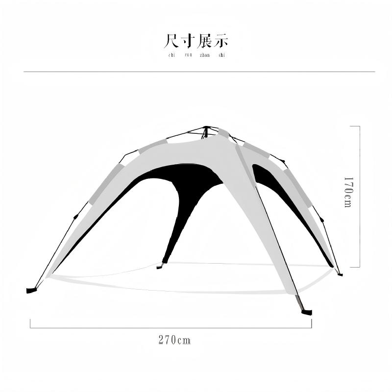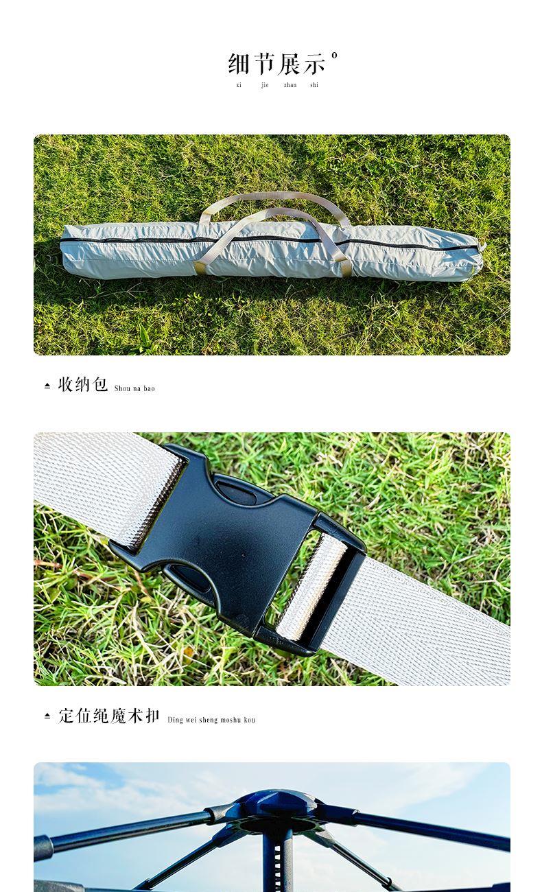 材质:210D钛黑胶牛津布+玻璃纤维杆 展开尺寸:270*270*170cm 收纳尺寸:108*17*17cm 颜色:浅卡其 净重:3.5kg 1、钛黑胶新材料,隔绝紫外线,有效防晒; 2、高颜值,7.3平大空间,可容纳户外6-8人亲友聚餐; 3、自动液压开合,一人也可搭建,轻松自如; 4、210D防水钛黑胶,深度防水防晒; 5、加强地钉,匹配对应风绳,自带收纳袋,轻松携带