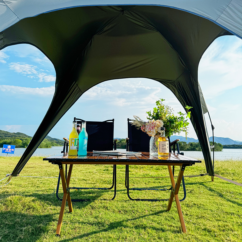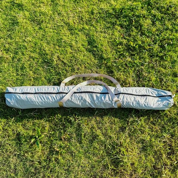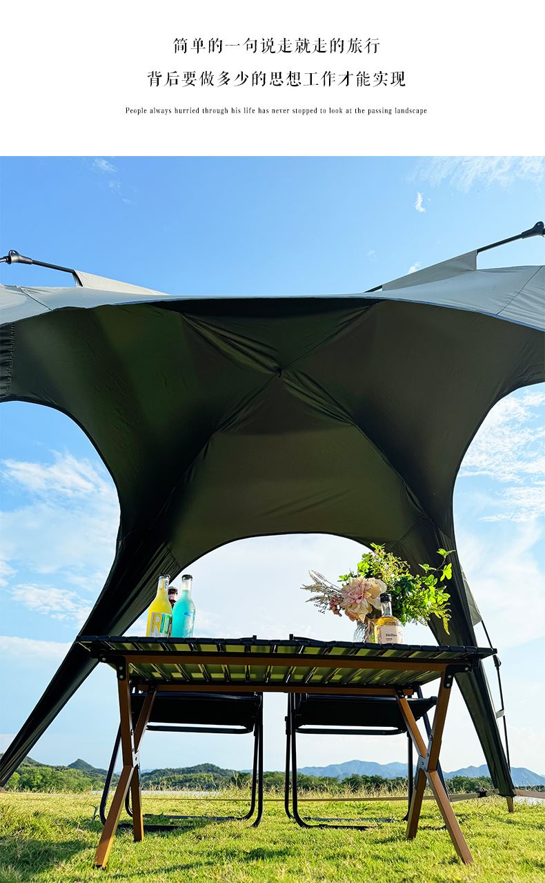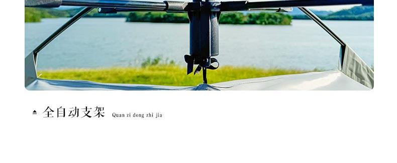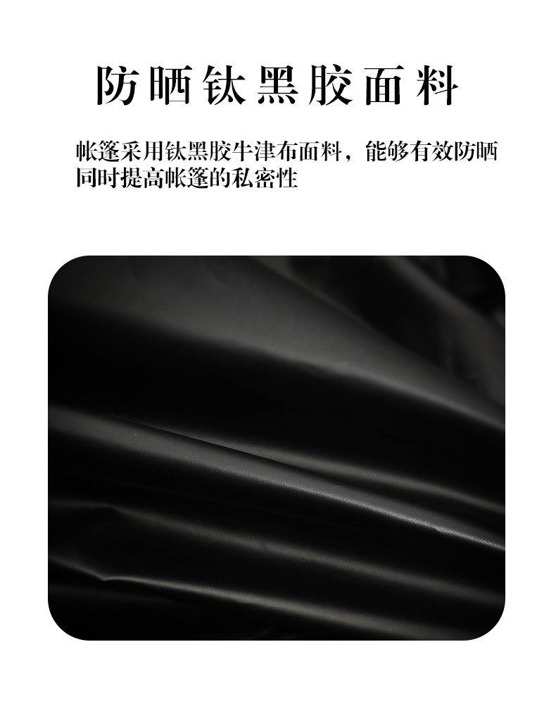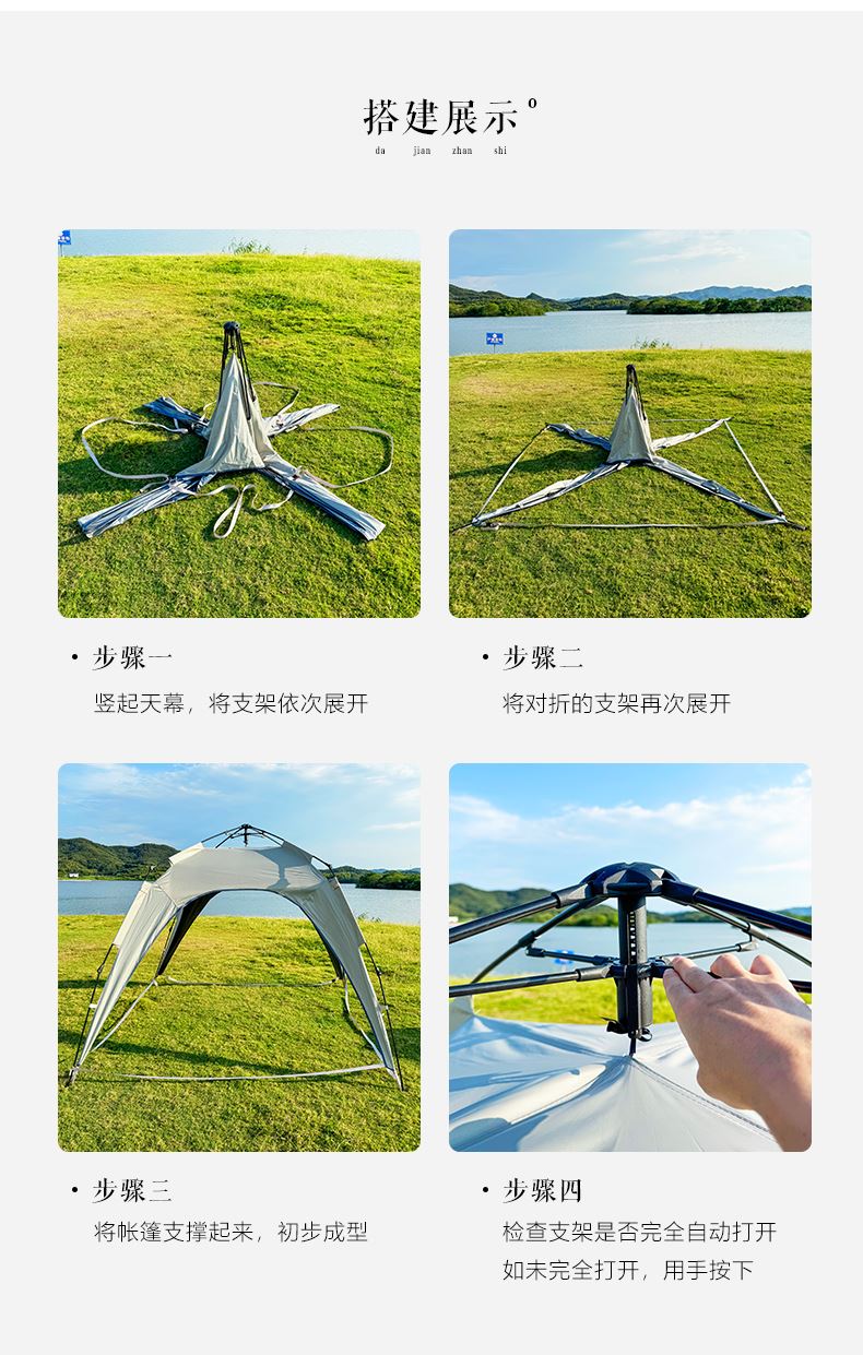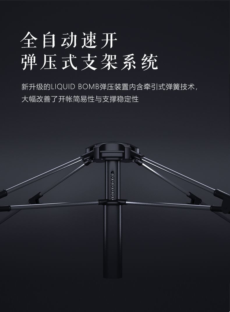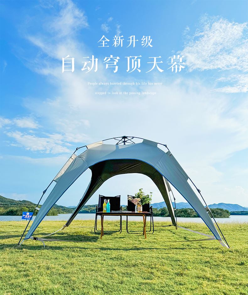 材质:210D钛黑胶牛津布+玻璃纤维杆 展开尺寸:270*270*170cm 收纳尺寸:108*17*17cm 颜色:浅卡其 净重:3.5kg 1、钛黑胶新材料,隔绝紫外线,有效防晒; 2、高颜值,7.3平大空间,可容纳户外6-8人亲友聚餐; 3、自动液压开合,一人也可搭建,轻松自如; 4、210D防水钛黑胶,深度防水防晒; 5、加强地钉,匹配对应风绳,自带收纳袋,轻松携带