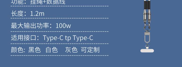 材质:锌合金+尼龙编织 功能:挂绳+数据线 功率:240w 产品长度:1.2m 适用接口:Type-C tp Type-C 颜色:黑色 白色 灰色颜色可定制 Type-Cto Type-C PD240w超速闪充数据线铝合金外壳/加粗编织挂绳,一绳两用简单一挂 机不离身外出手机搭档,便携出行解放双手。