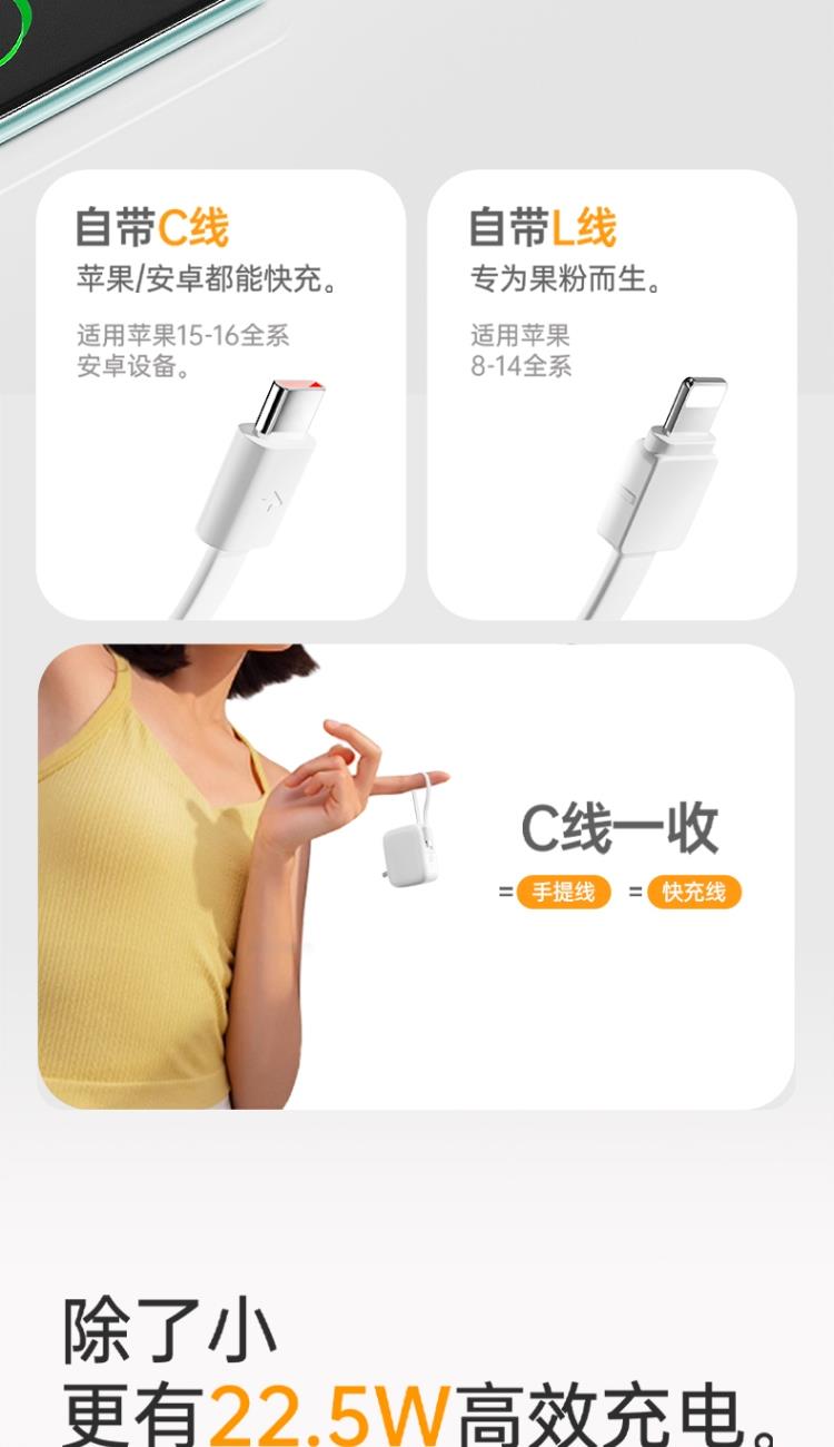 Type-C口/Type-c线输出:5V/3A,9V/2.22A,12V/1.67A, 10V/2.25A 22.5W Max