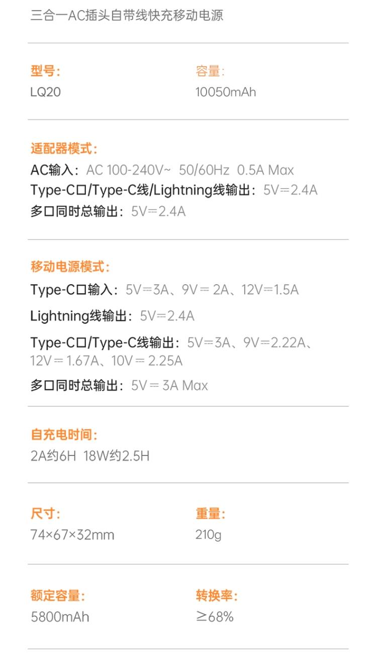 电池容量:10050mAh产品尺寸:74*67*32mm