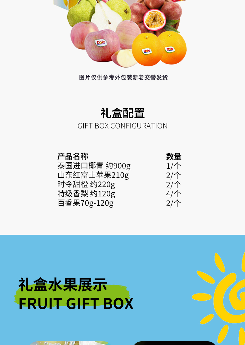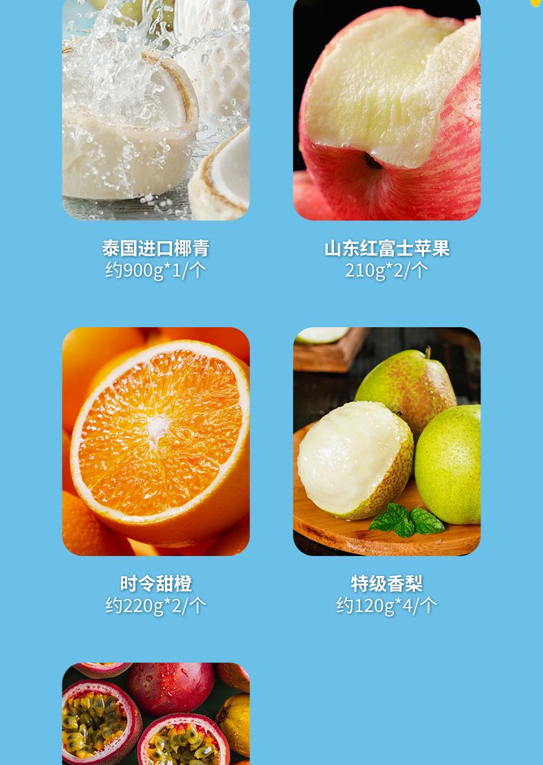 泰国进口椰青 约900g*1/个 山东红富士苹果210g*2/个 时令甜橙 约220g*2/个 特级香梨 约120g*4/个 百香果70g-120g*2/个"