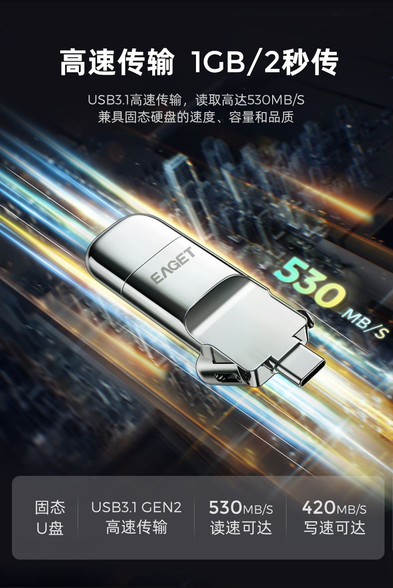 Type-C/USB3.2双接口 采用双接口传输 USB3.2固态高速传输 一键备份、数据加密 专属APP、智能管理 产品尺寸:58.5*20.4*8.4mm 包装尺寸:113*100*10mm 单品重量:17g