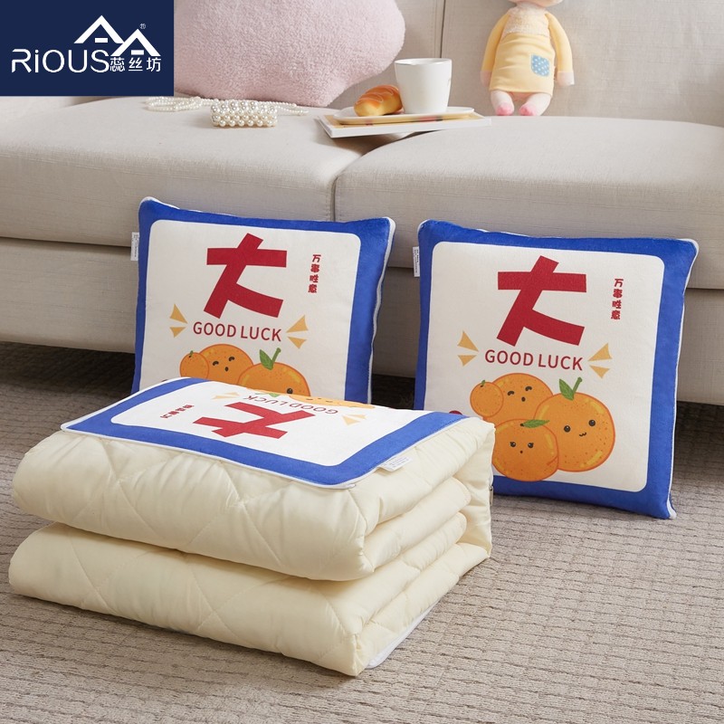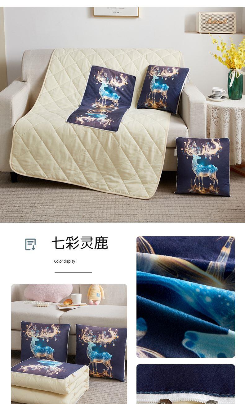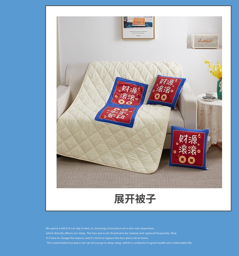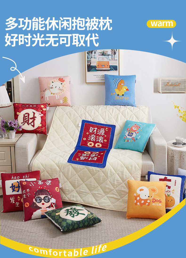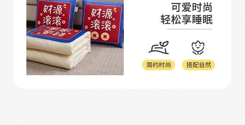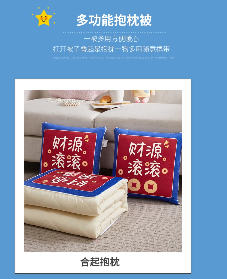 抱枕被设计,一枕多用,可做靠枕,打开可做被子,用途广泛,方便收纳、可机洗。新一代活性印染,色牢度高,不易褪色,不惧机洗水洗;细密卷边工艺,针脚紧密,耐磨耐用;双向拉链设计,顺滑易拉,经久耐用。