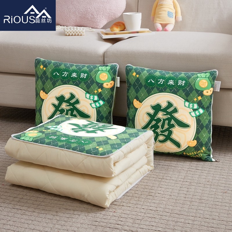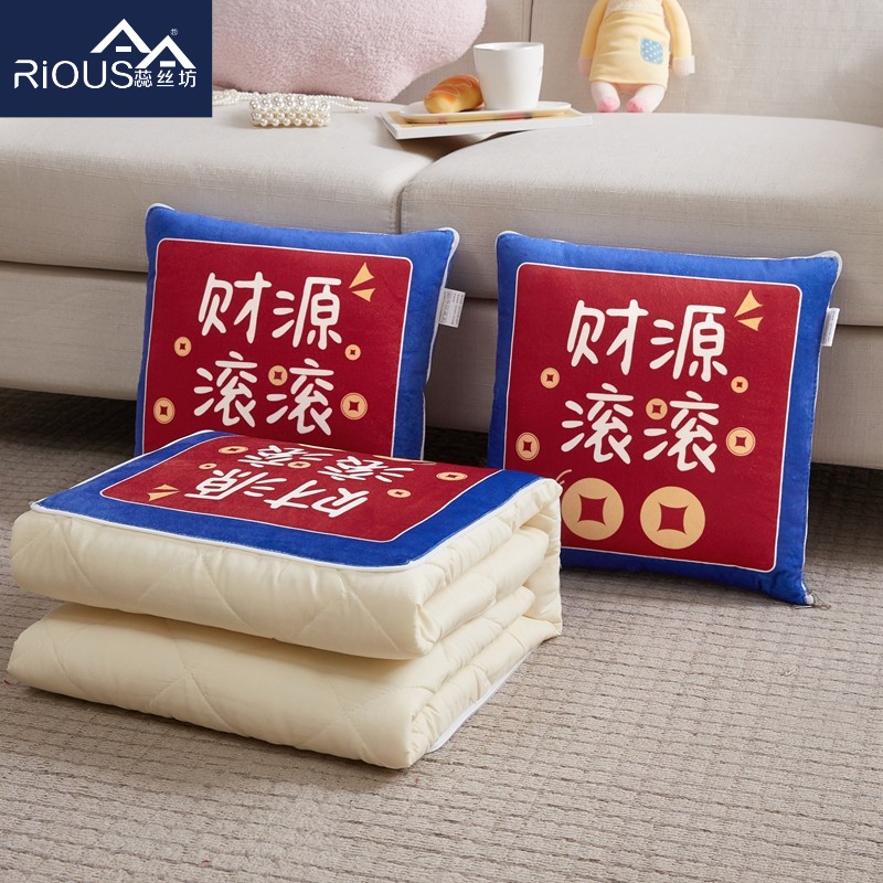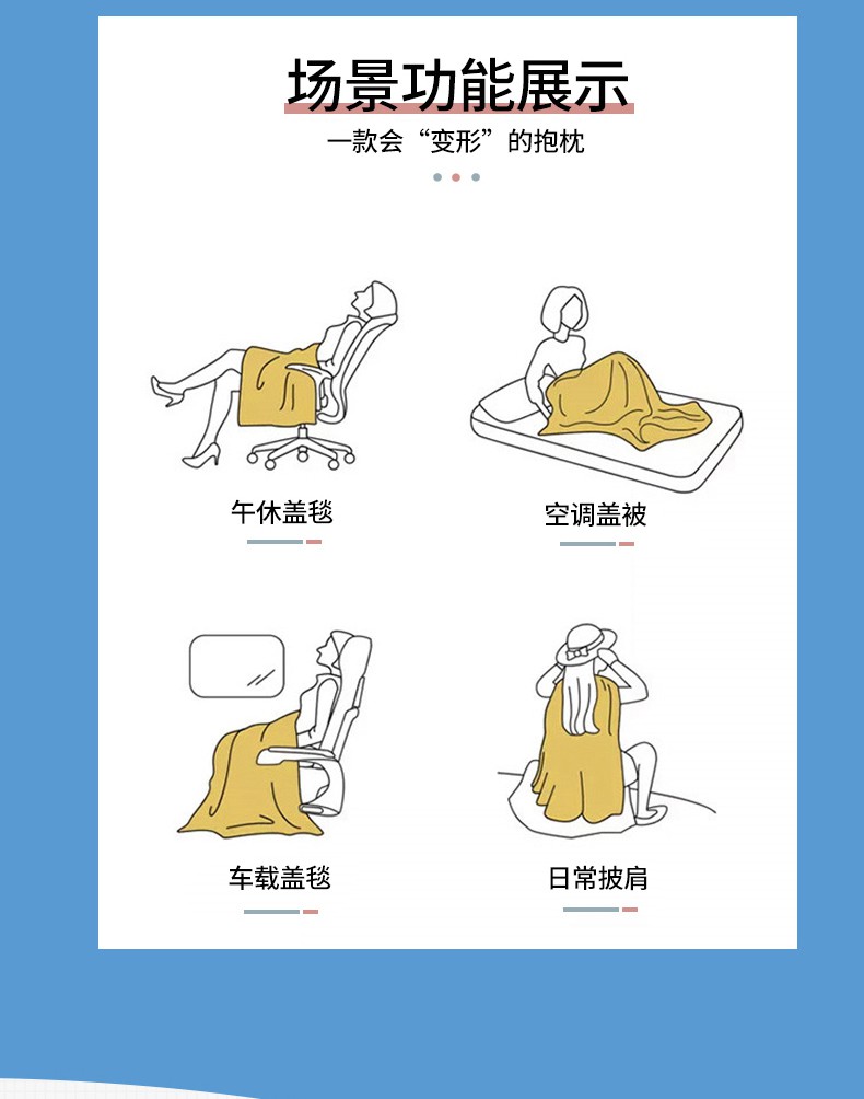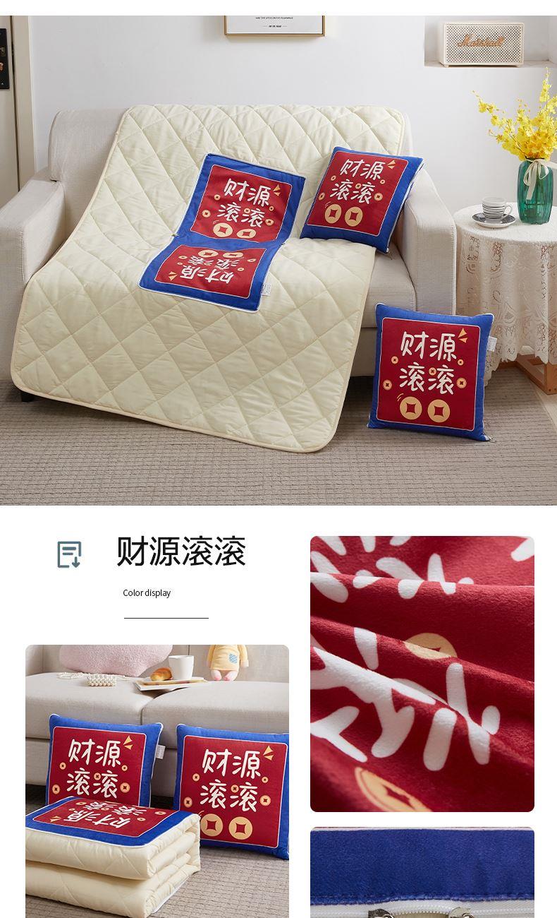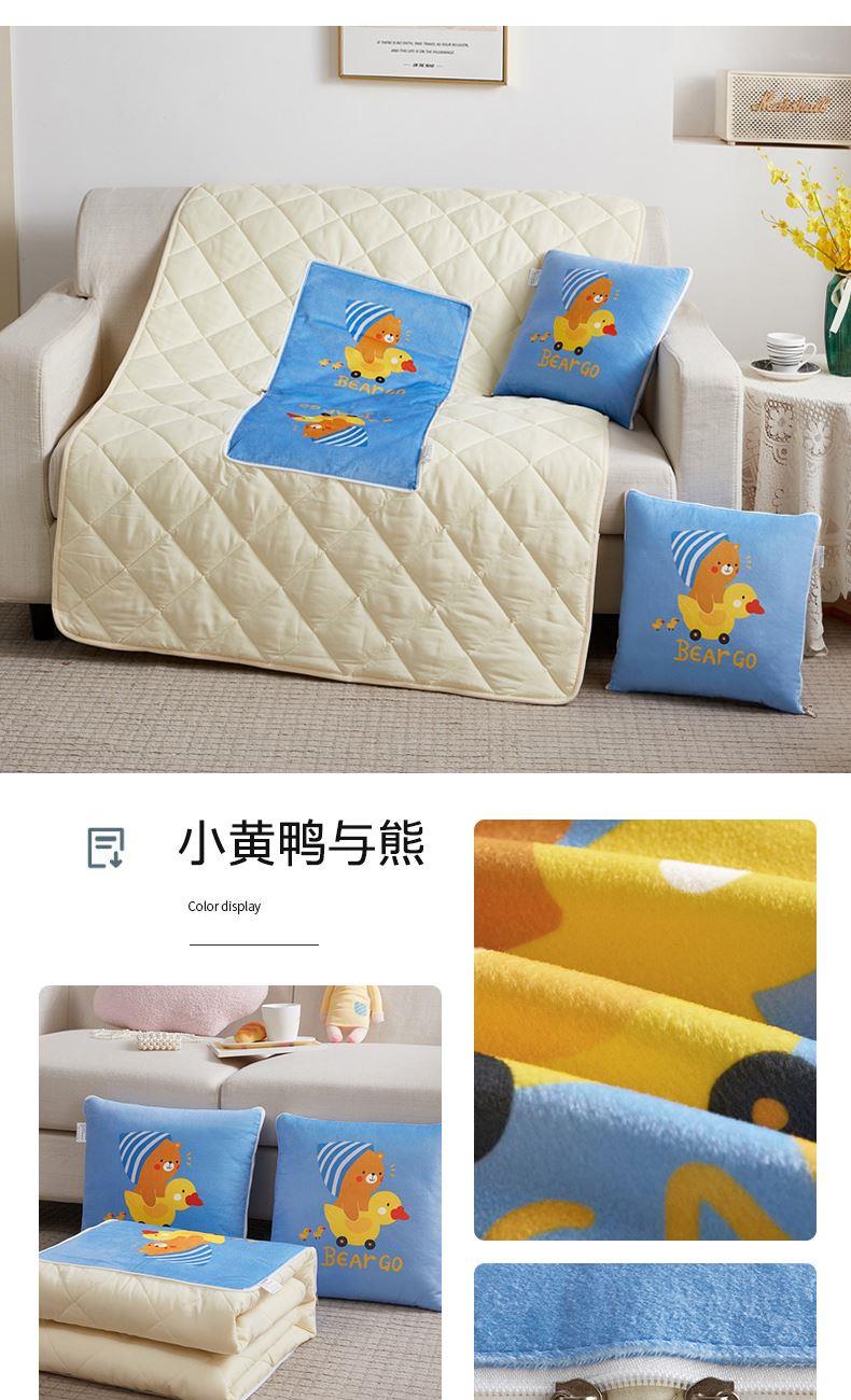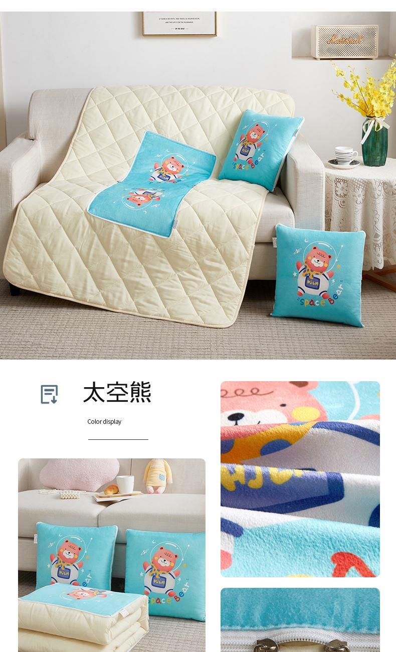 抱枕被设计,一枕多用,可做靠枕,打开可做被子,用途广泛,方便收纳、可机洗。新一代活性印染,色牢度高,不易褪色,不惧机洗水洗;细密卷边工艺,针脚紧密,耐磨耐用;双向拉链设计,顺滑易拉,经久耐用。