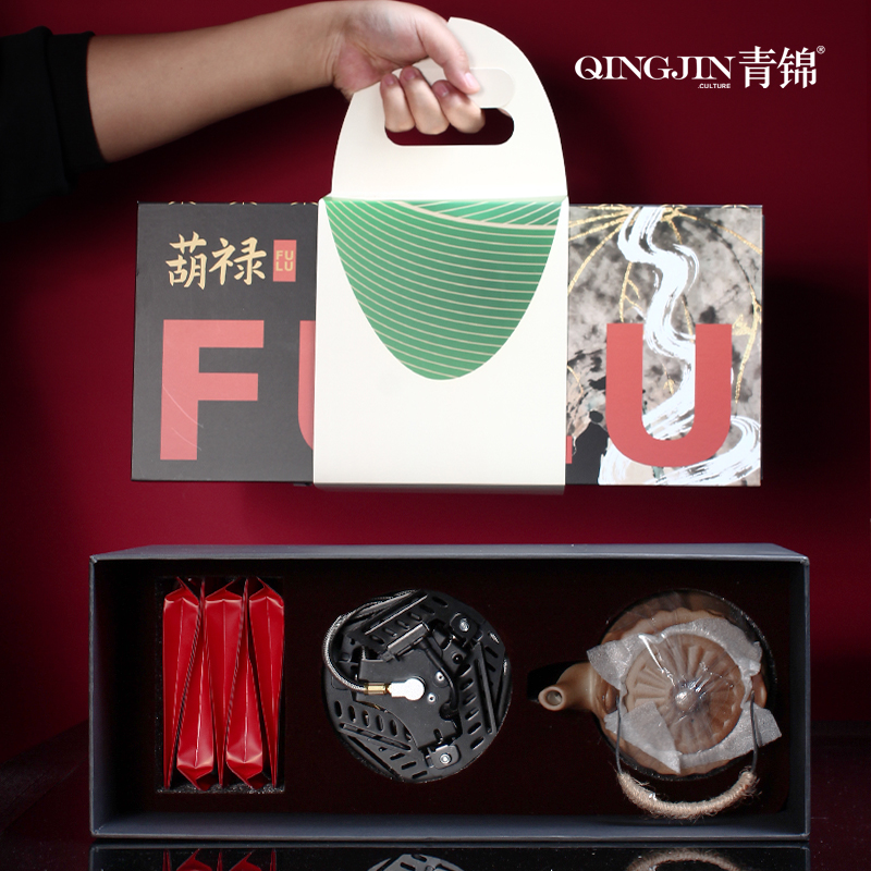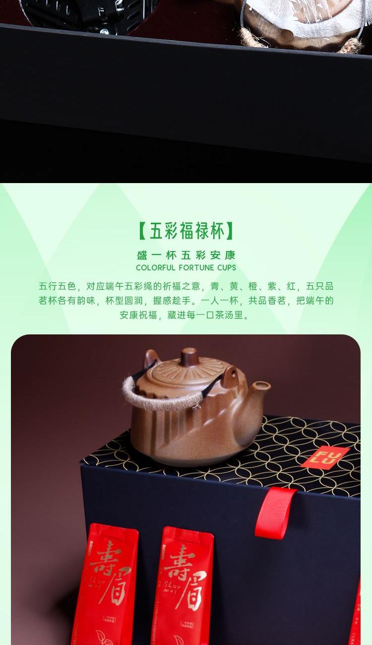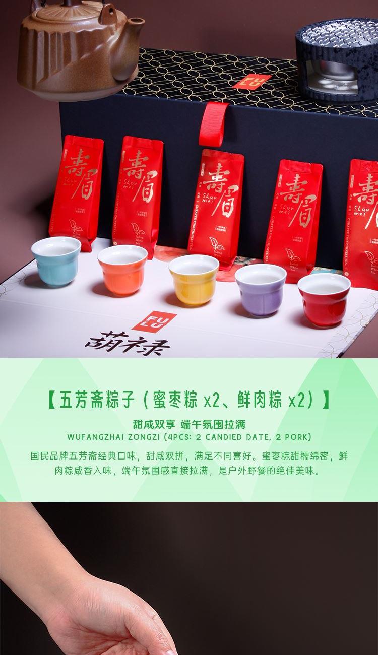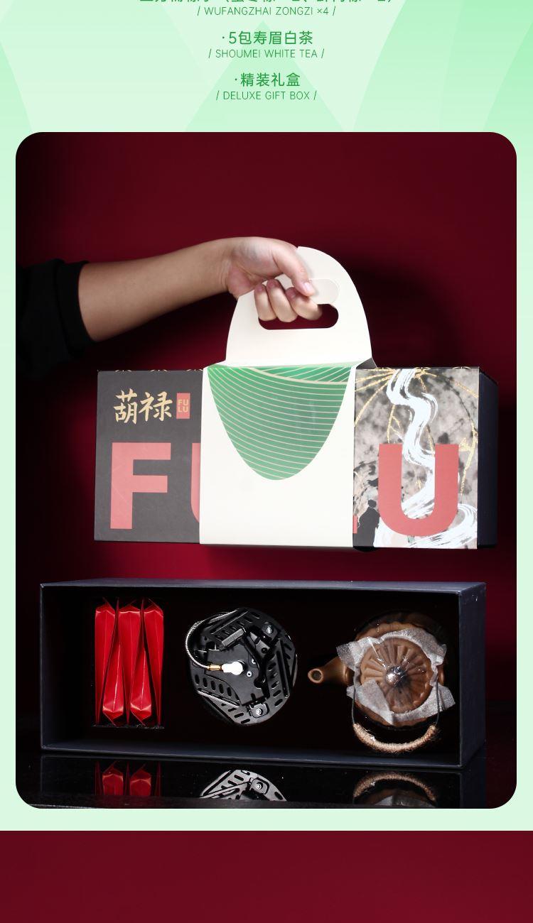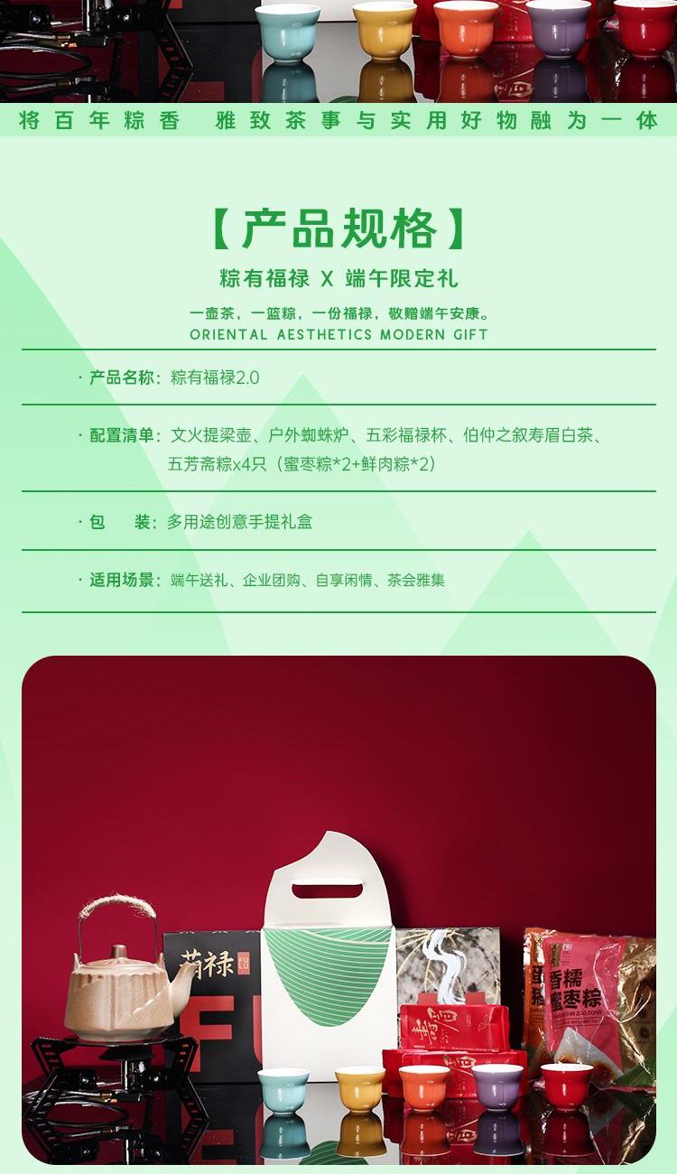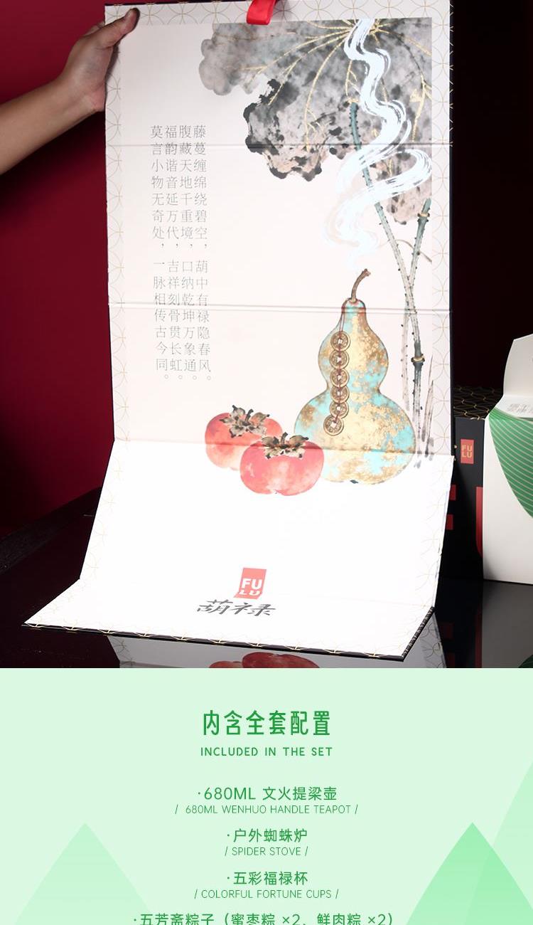 配置 1-文火提梁壶*1 680ml 陶瓷材质 2-户外蜘蛛炉*1 3-五彩福禄杯*5 陶瓷 5.8*4.8cm 50ml 4-伯仲之叙寿眉白茶*5包 5-五芳斋粽x4只(蜜枣粽*2-鲜肉粽*2) 6-精装实用性礼盒*1 包装可做挂画 材质 陶瓷 金属 尺寸 礼盒:18×20×45cm 馈赠重要伙伴彰显不凡品味敬献温情。 祝福在壶中沸腾,在墙上停驻。 首批限量,诚邀品鉴。