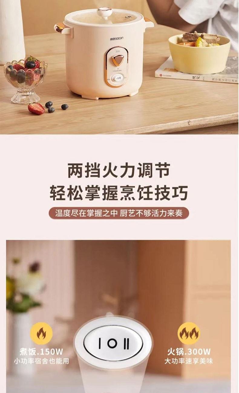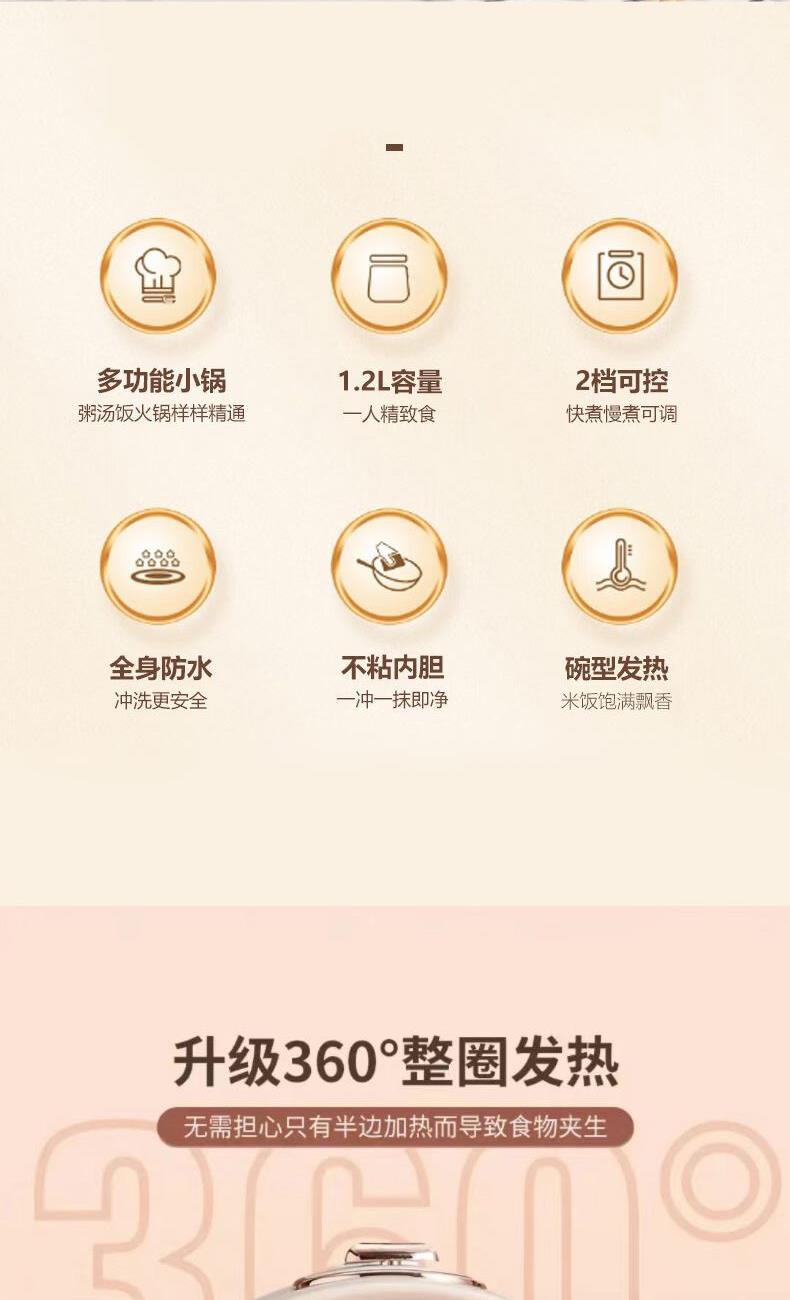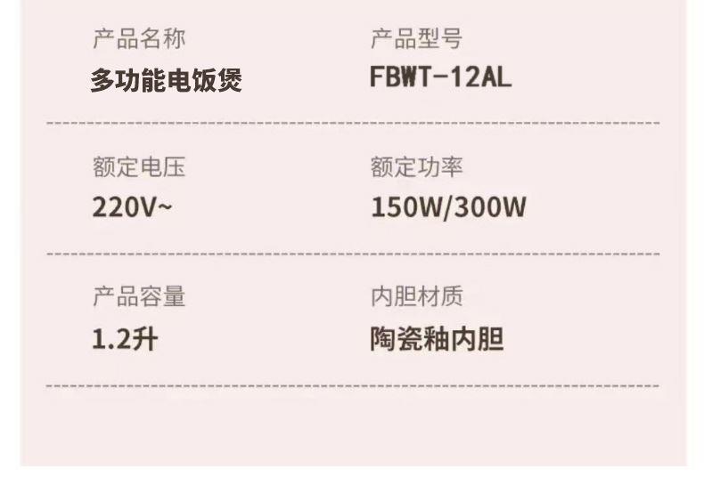 内胆材质:不锈钢 涂层材质:陶瓷釉 容量:1.2L 电源线长:0.75m 额定功率:300W 功能:预约定时 快速饭 粥/汤 加热方式:底盘 适用人数:2人以下