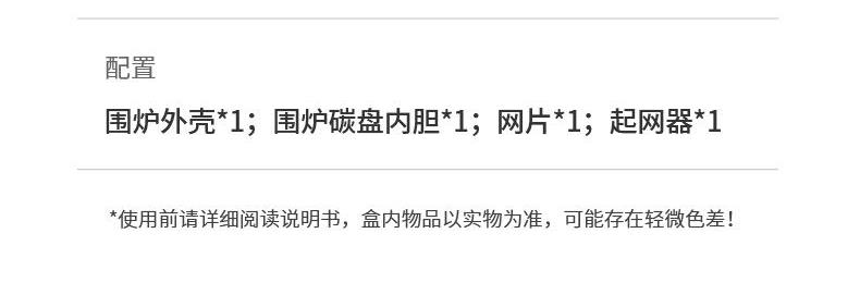 材 质:优质铁器材 配 置:围炉外壳*1;围炉碳盘内胆*1;网片*1;起网器*1 规 格:300*120mm 装 箱 数:10pcs/箱 采用优质铁基材,一体拉升成型。 三合一结构,可拆卸易清洗,方便清洗打理。 大面积加密烤网,耐用耐高温。 加高炉脚,防止烫伤桌面。 防烫手柄,安全隔热。 独立碳槽,炉体全身打孔,获得充足的氧气,使碳充分燃烧。