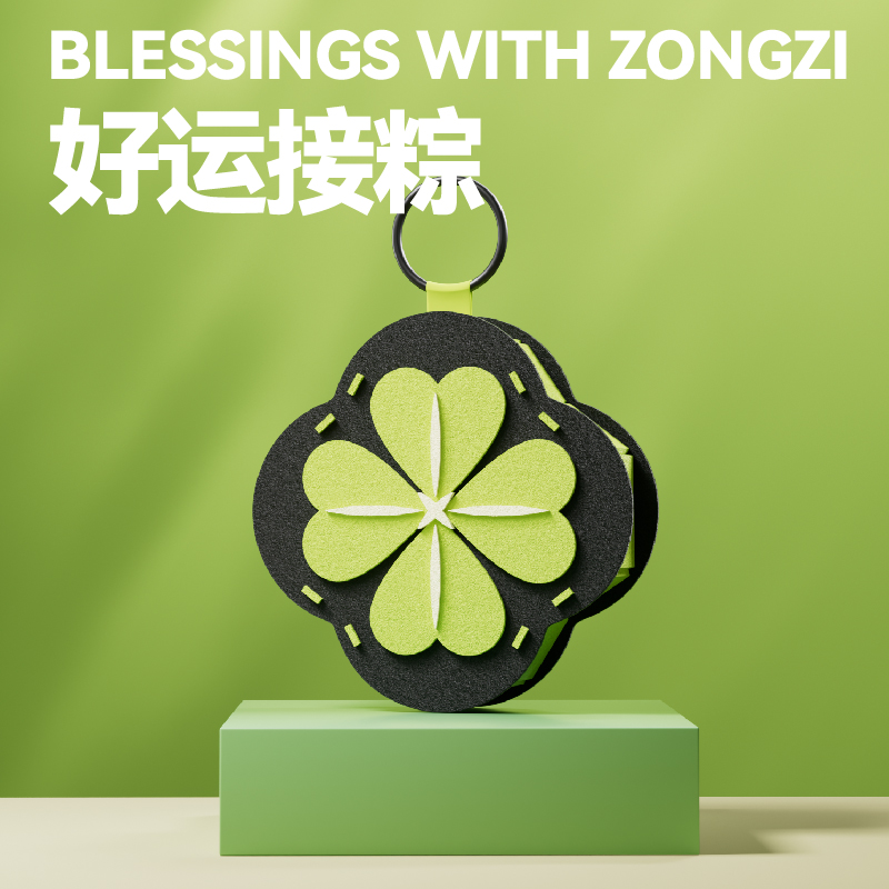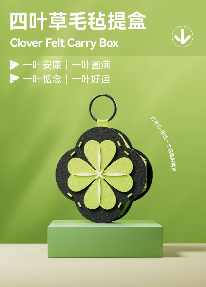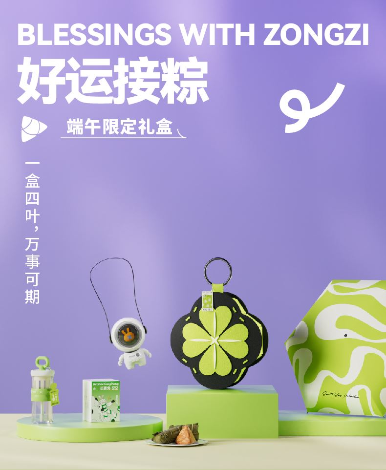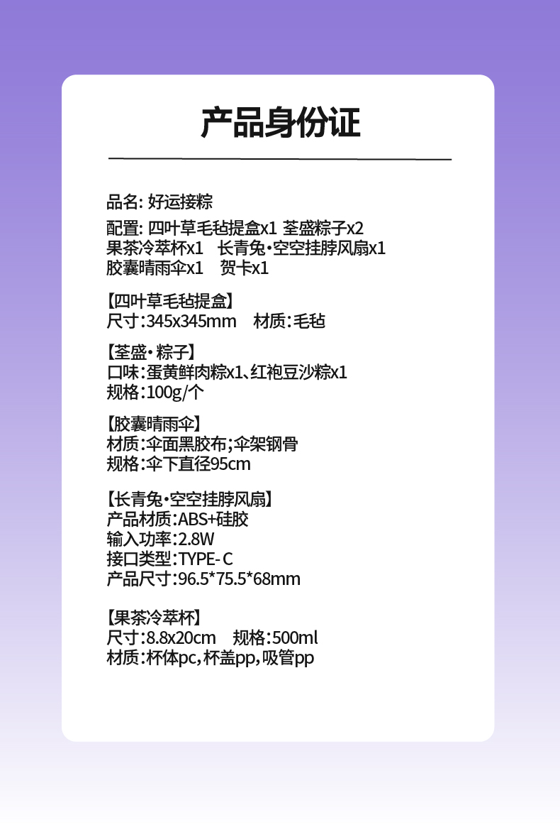 把端午的祝福,折进幸运的轮廓—— 一叶是安康,一叶是圆满,一叶是惦念, 第四叶留给不期而至的好运。 当礼盒开启,就像接住了一个温柔的寓言: 美好总在转角处,等你伸手 内配: 配置一:四叶草毛毡提盒x1 配置二:荃盛粽子x2 配置三:果茶冷萃杯x1 配置四:长青兔·空空挂脖风扇x1 配置五:胶囊晴雨伞x1配置六:贺卡x1