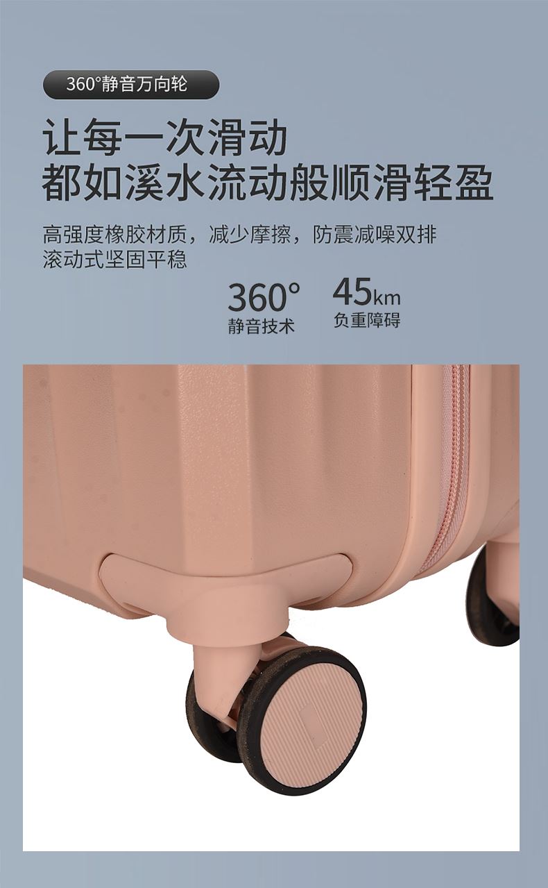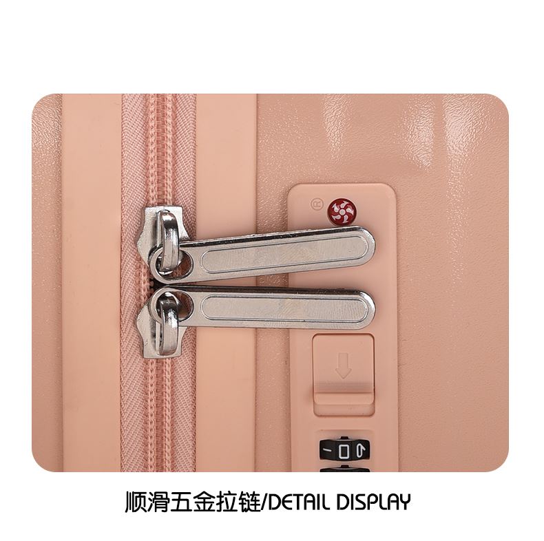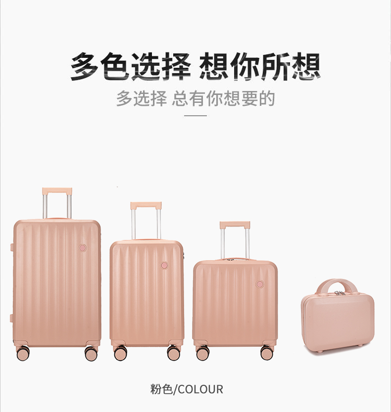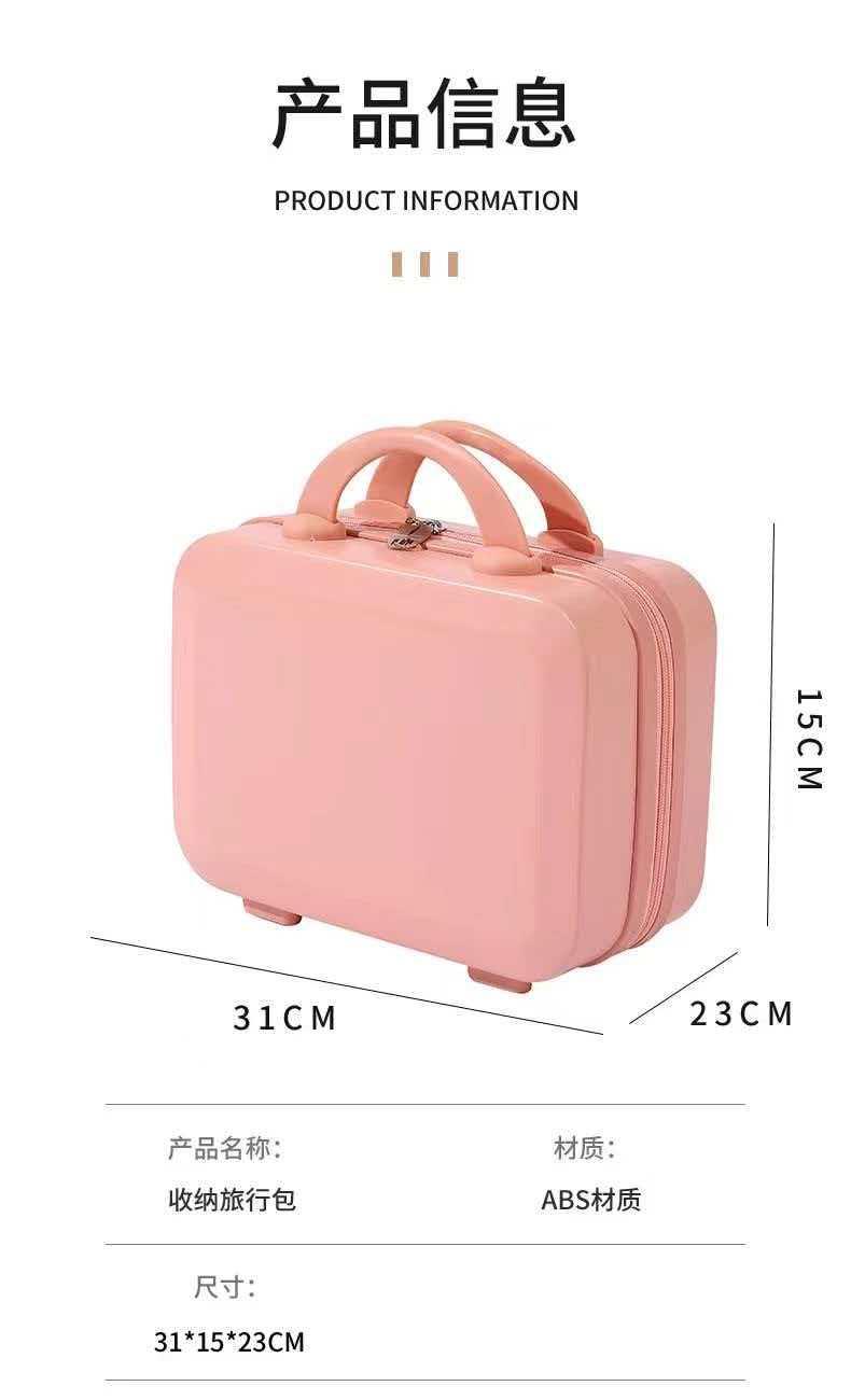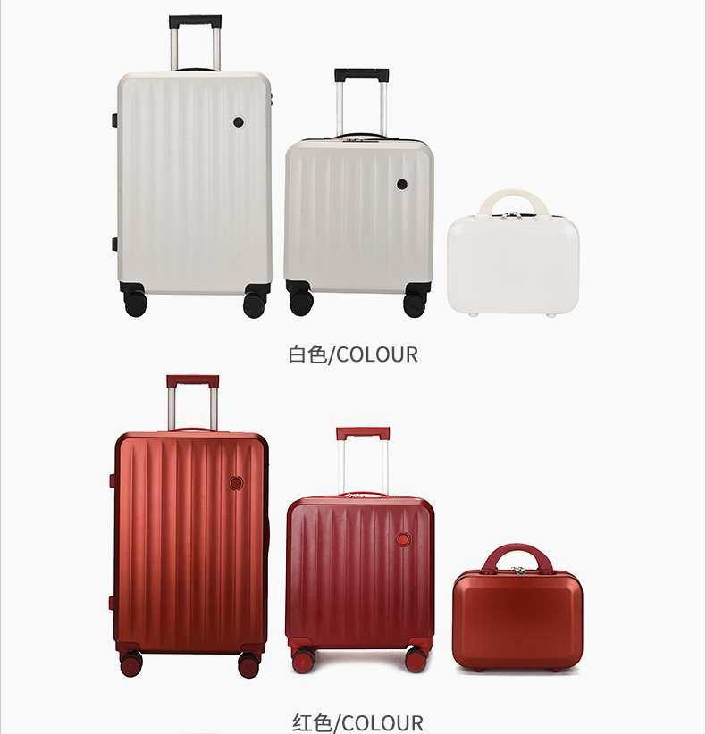 面料材质:ABS+PC 轮子:静音万向轮 拉杆:合金拉杆 颜色:粉、白、红、灰、黑、蓝、绿; 尺寸:20+14寸:55*35*25cm+31*15*23cm (尺寸包含轮子)