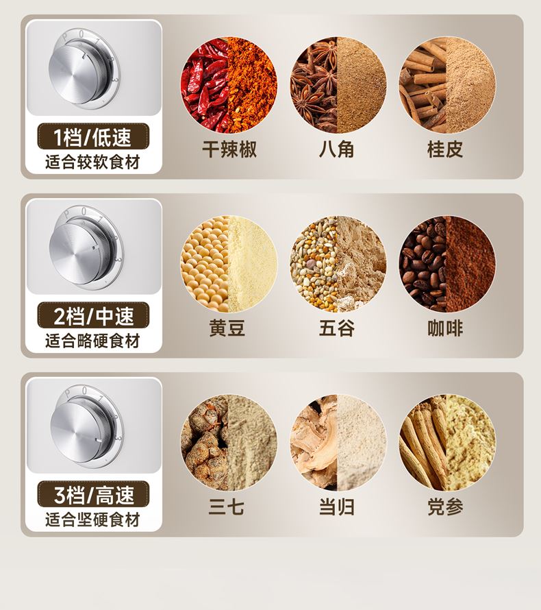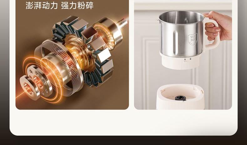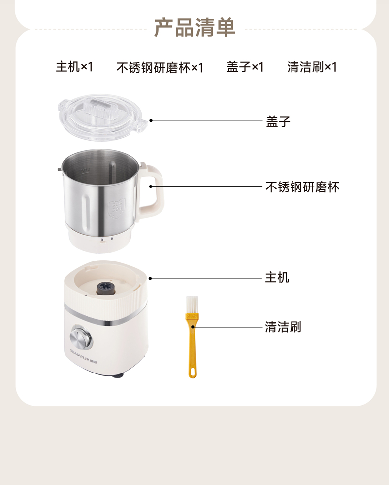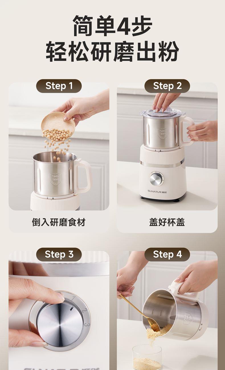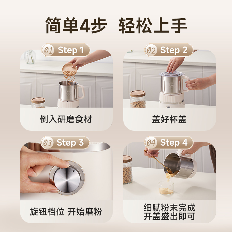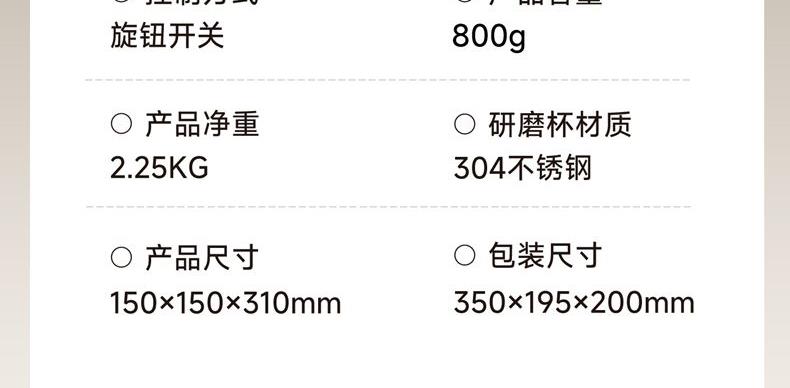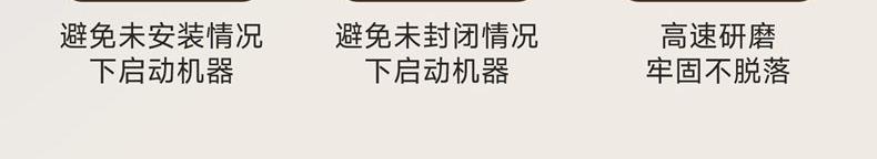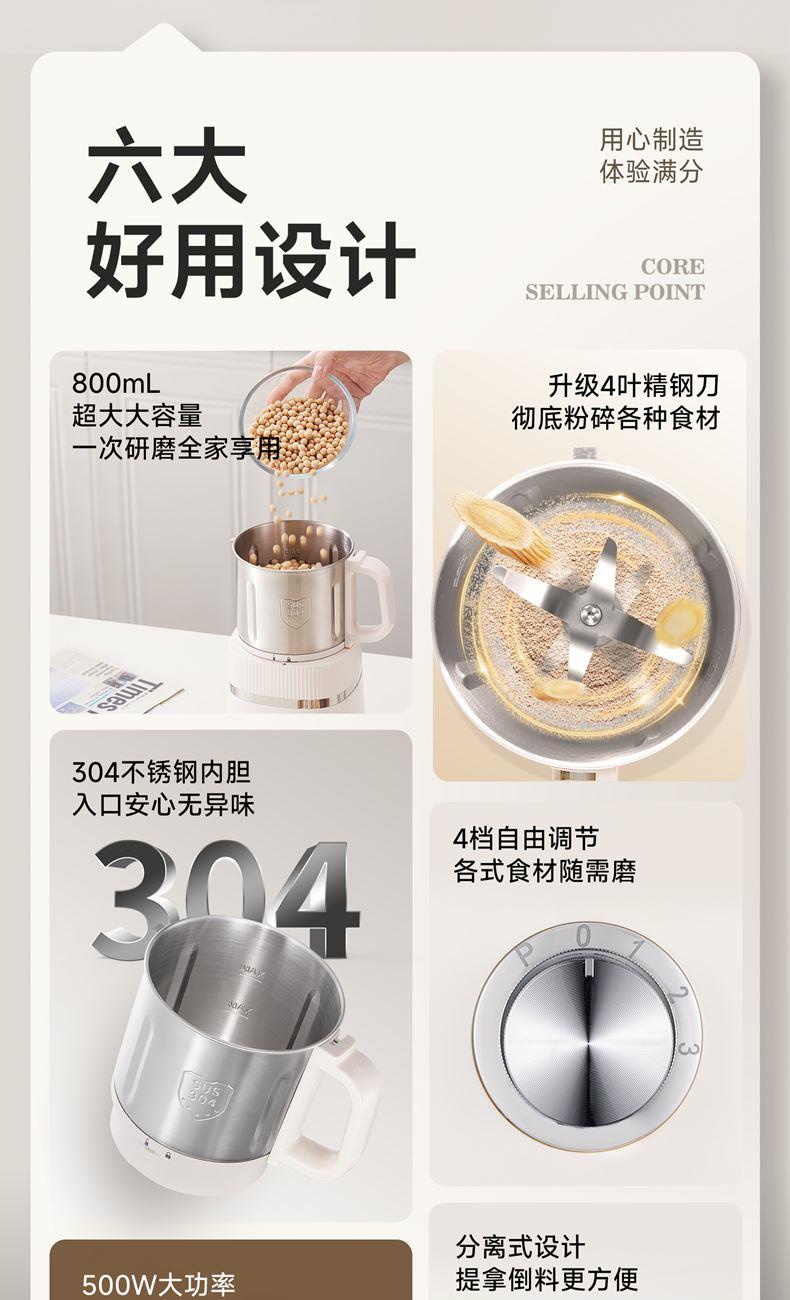 500W大功率电机 高速精细研磨; 800ml超大大容量 加大锋利精钢4叶精钢刀 出粉细腻; 304不锈钢内胆 一体成型抗污防腐 ; 少量也能精磨 控制不浪费; 四档自由调速 食材粗细随意磨; 主机与杯体分离设计 提拿倒料更方便; 三重安装保护 细心体贴 家人放心;
