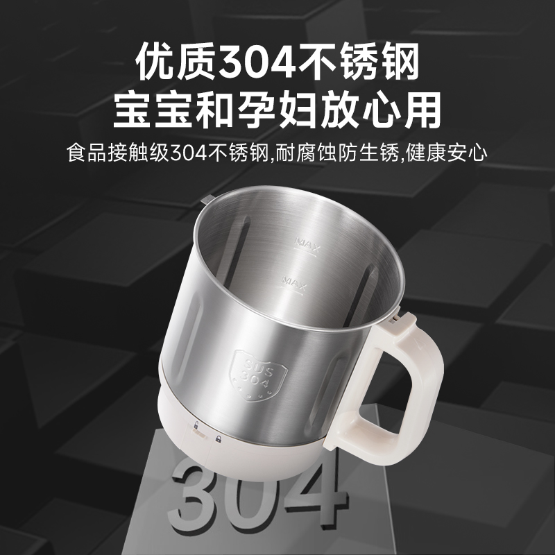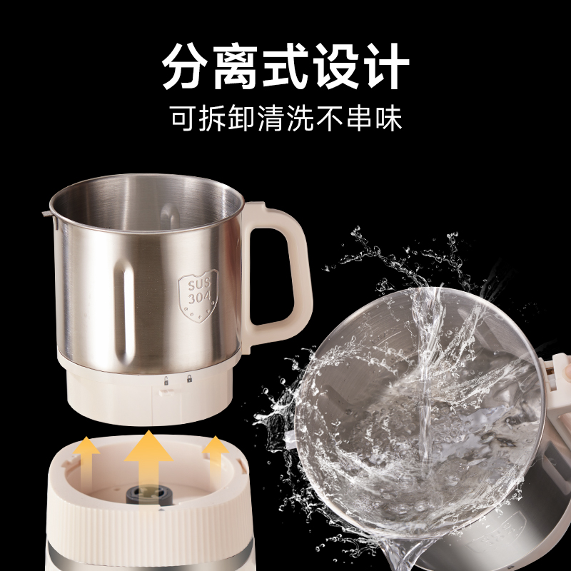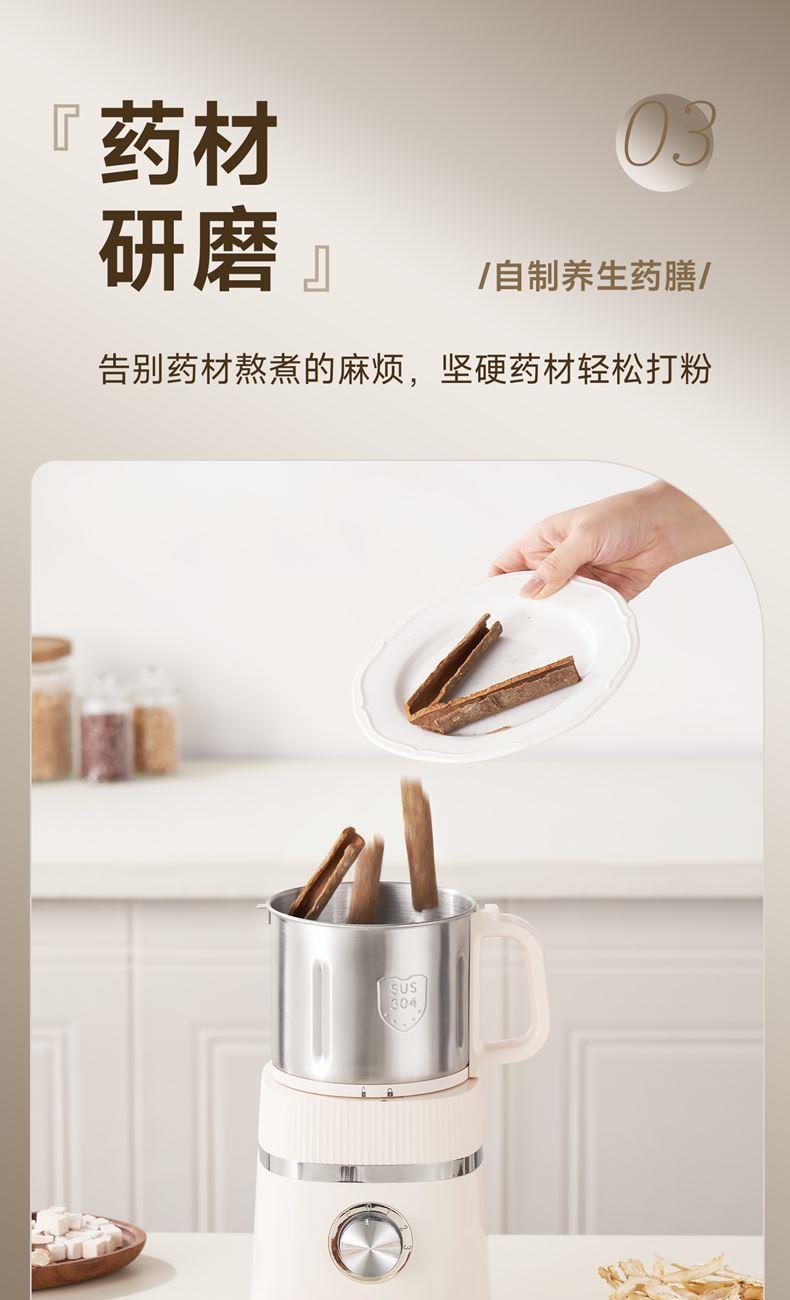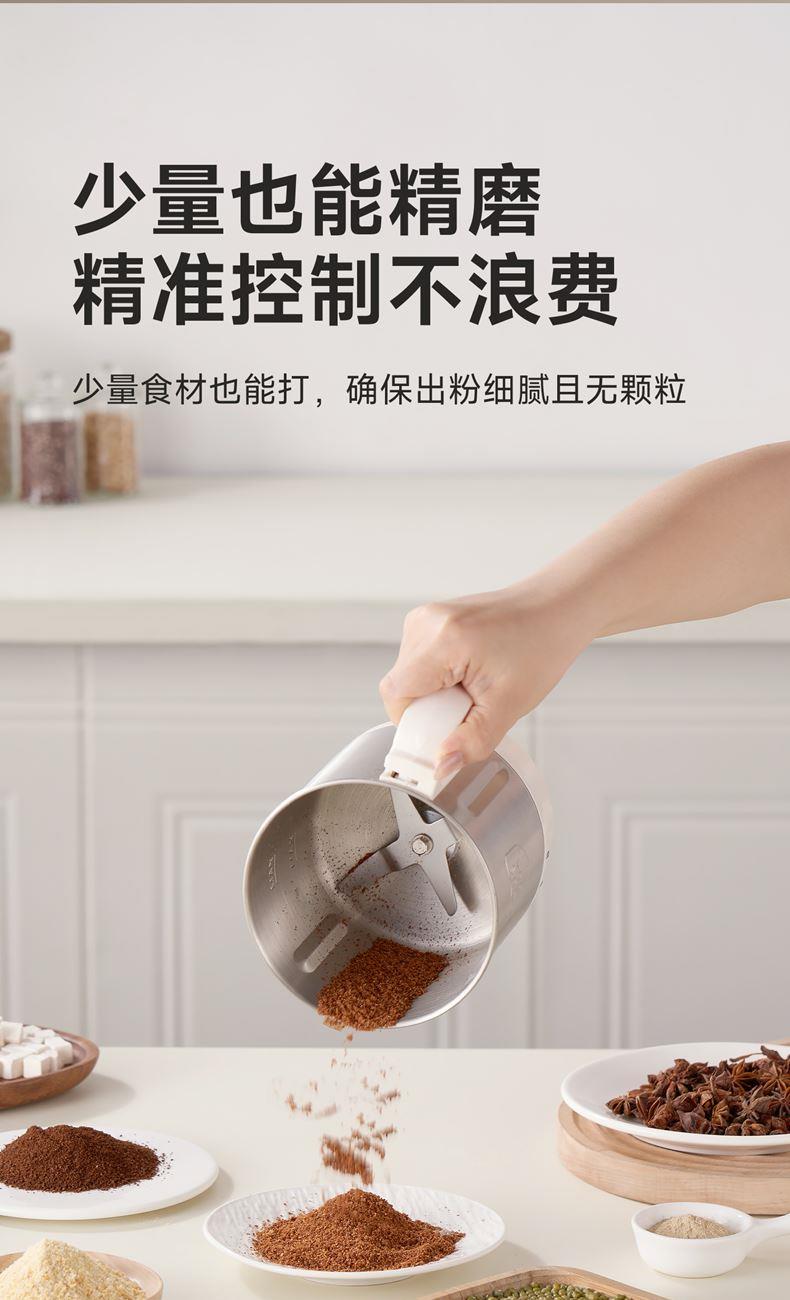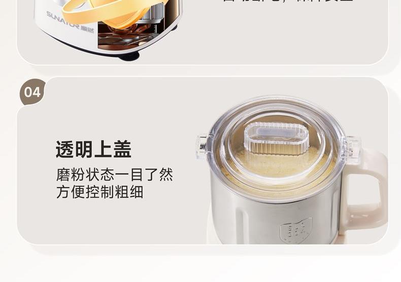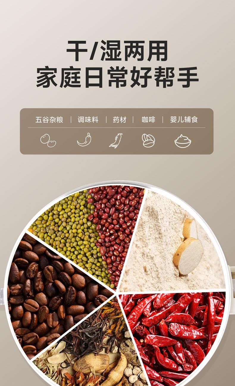 500W大功率电机 高速精细研磨; 800ml超大大容量 加大锋利精钢4叶精钢刀 出粉细腻; 304不锈钢内胆 一体成型抗污防腐 ; 少量也能精磨 控制不浪费; 四档自由调速 食材粗细随意磨; 主机与杯体分离设计 提拿倒料更方便; 三重安装保护 细心体贴 家人放心;