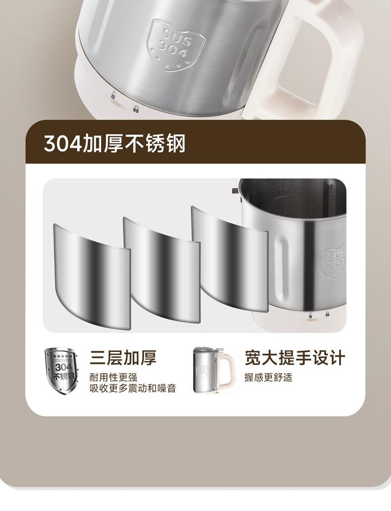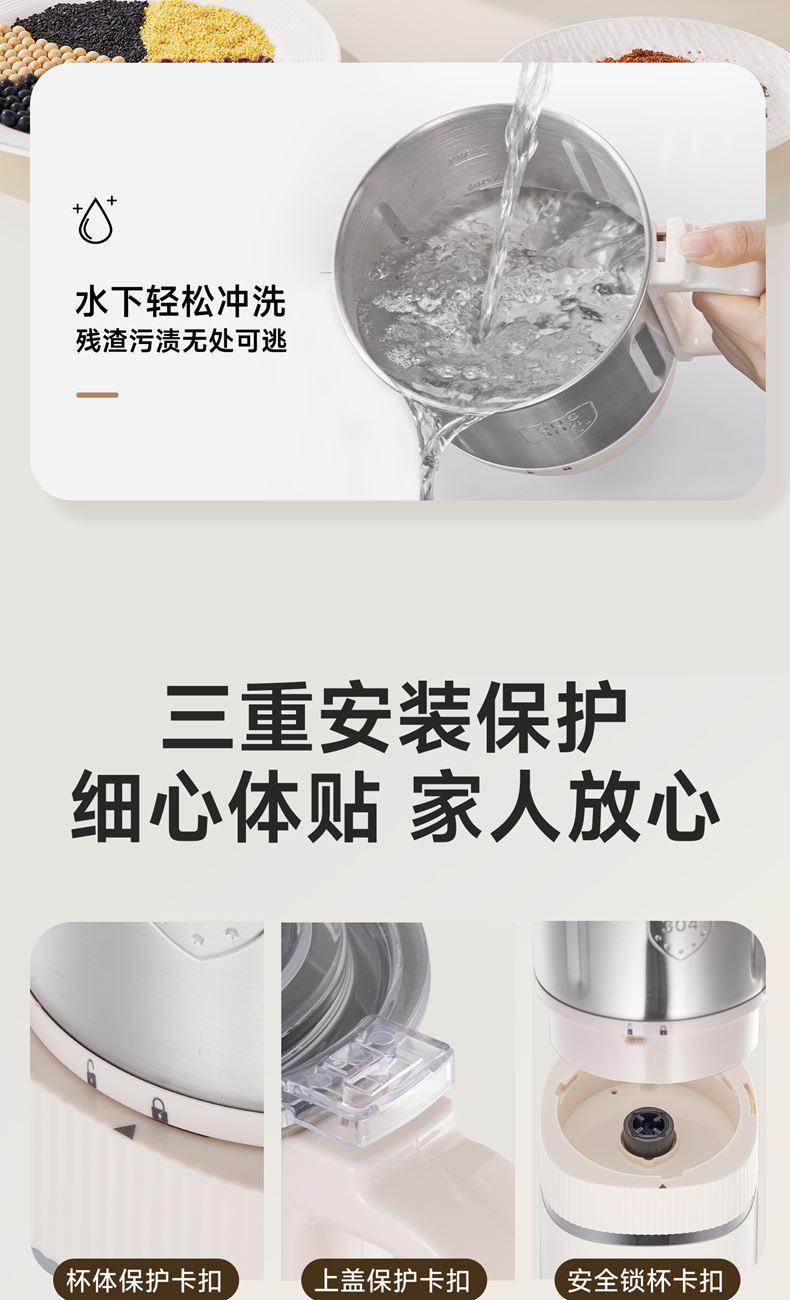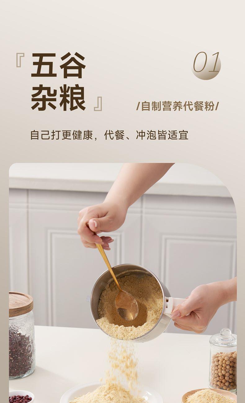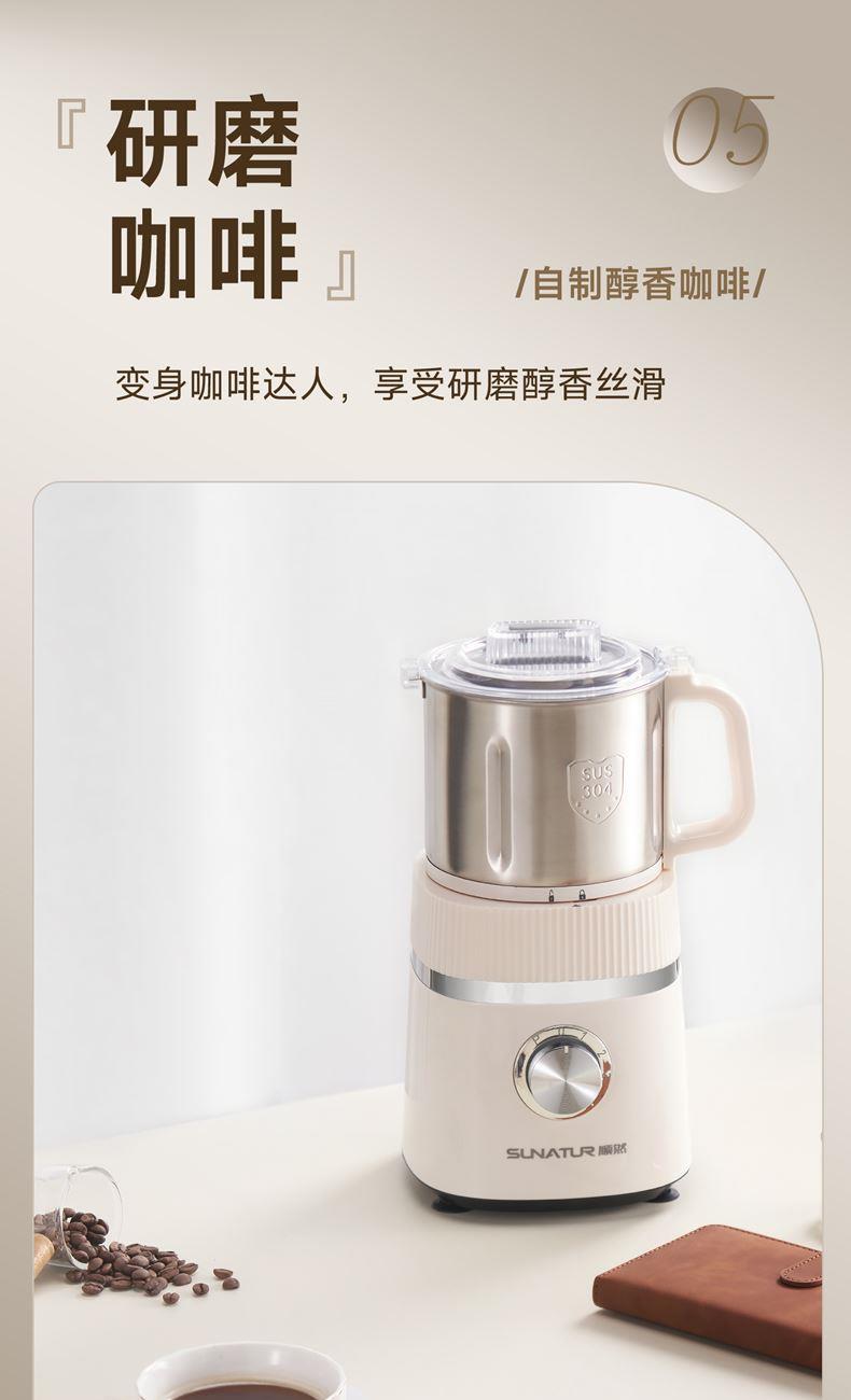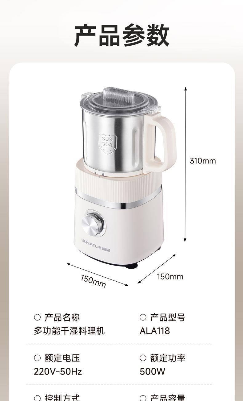 500W大功率电机 高速精细研磨; 800ml超大大容量 加大锋利精钢4叶精钢刀 出粉细腻; 304不锈钢内胆 一体成型抗污防腐 ; 少量也能精磨 控制不浪费; 四档自由调速 食材粗细随意磨; 主机与杯体分离设计 提拿倒料更方便; 三重安装保护 细心体贴 家人放心;