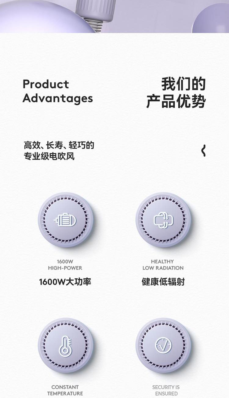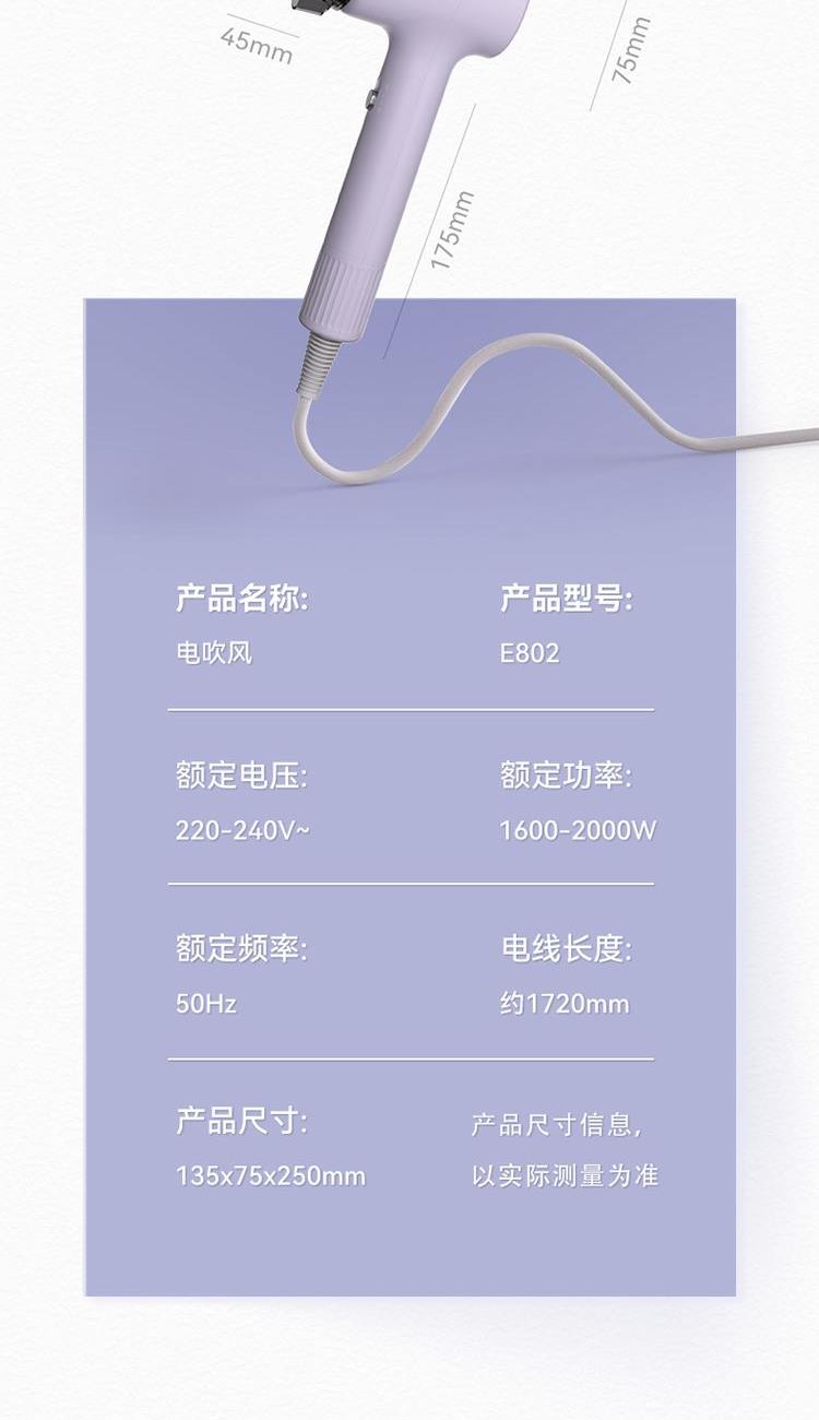 额定电压:220V-240~ 额定功率:1600W -2000W 额定频率:50Hz 产品净重: 产品尺寸:135X75X250mm 电线长度:1720mm 1、1600W大功率; 2、健康低辐射; 3、恒温不伤发; 4、安全保障 5.简约美学设计