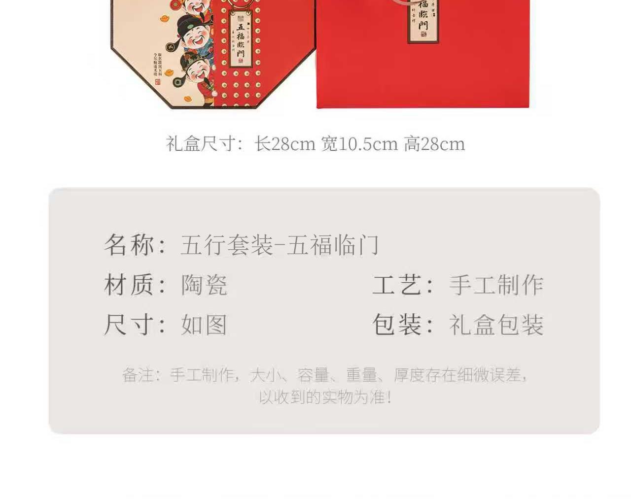 配置1五行套装:茶杯*5,提梁壶*1. 配置2四喜套装:茶杯*4,提梁壶*1. 尺寸:四喜茶杯7.8*6.2cm 容量180ml, 五行茶杯8.2*5.2cm 容量140ml 提梁壶11.8*15cm 容量270ml。 礼盒:28*10.5*28cm。
