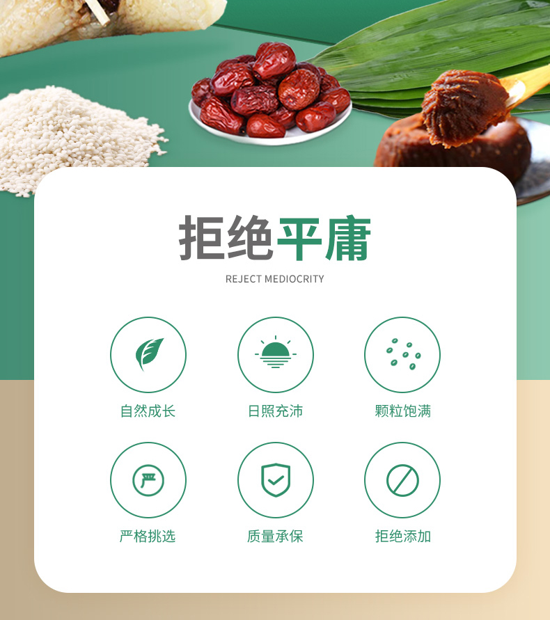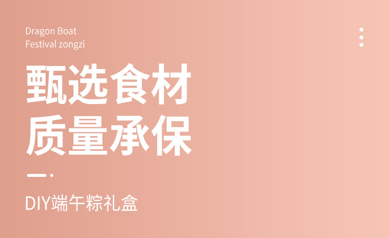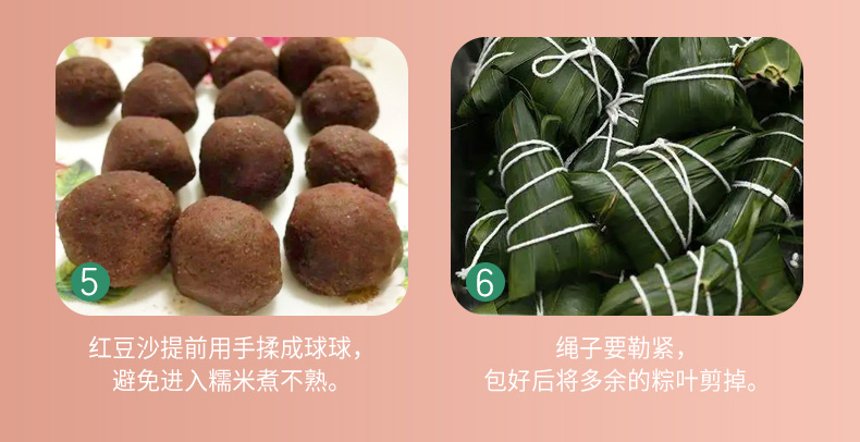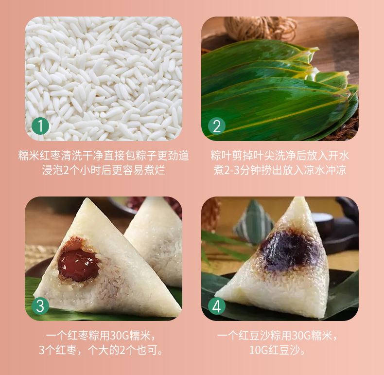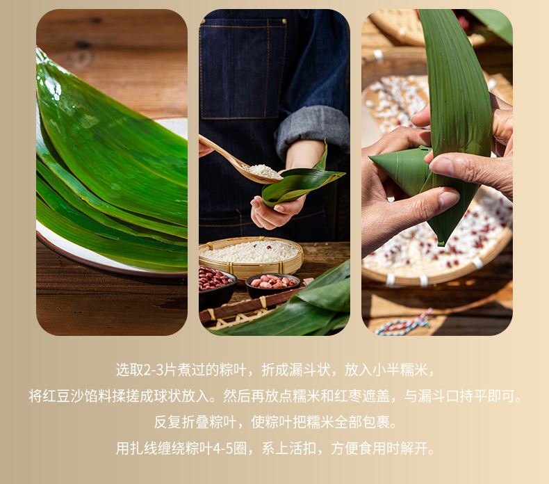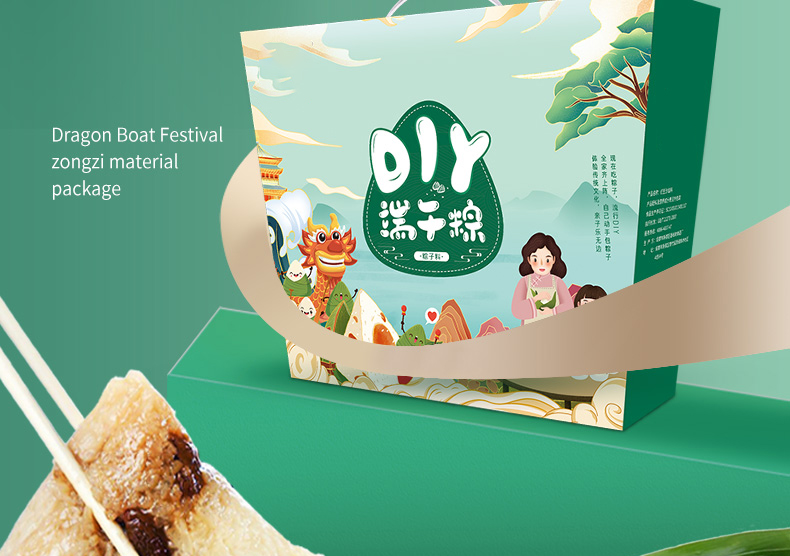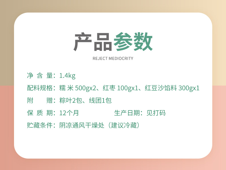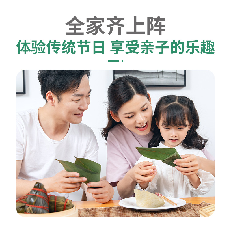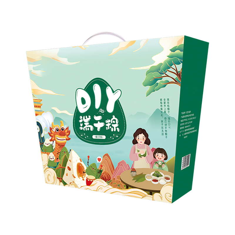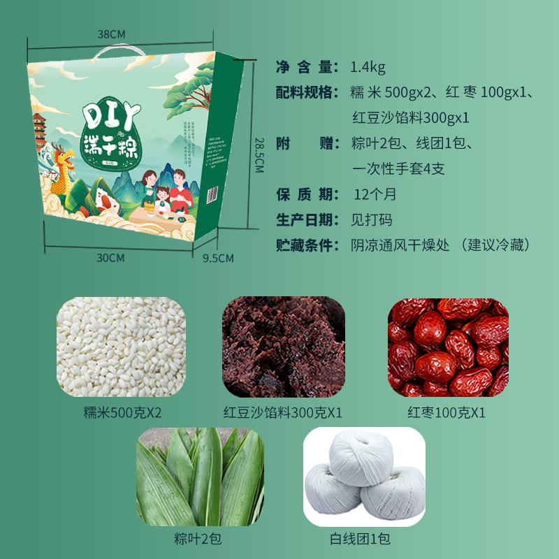 DIY端午粽(标配款) 产品规格配置:糯米500g*2袋、红枣100g红豆沙馅300g 净含量:1400g 粽叶20片*2包、线团25米 盒尺寸:38*9.5*28.5cm 箱尺寸:60*40*30 箱重量:10.8kg 箱体积:0.072方