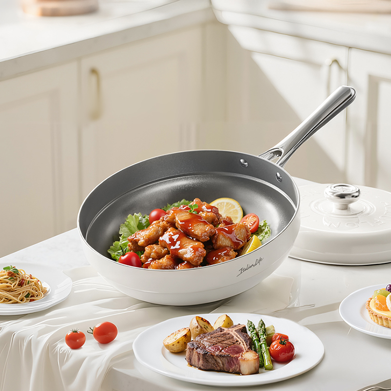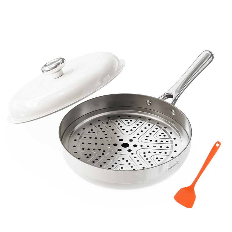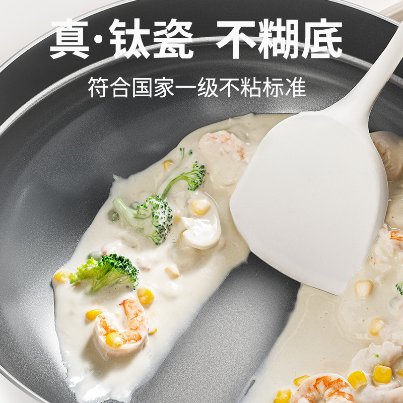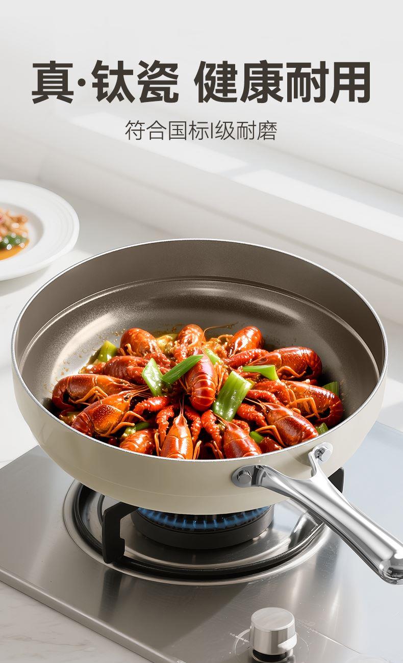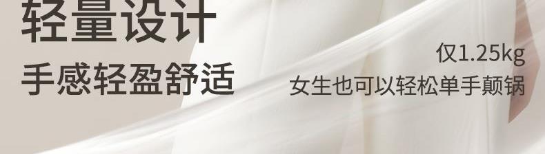 产品规格:30cm 产品颜色:白色 产品货号:2301190430 外箱尺寸:520*365*142mm 1、国标1级不粘,钛不粘不糊底 2、钛瓷革新材质,0氟0析出0涂层 3、9HV硬度,持久耐磨不粘 4、锅体减重约18%,单手可颠 5、可进洗碗机,解放双手