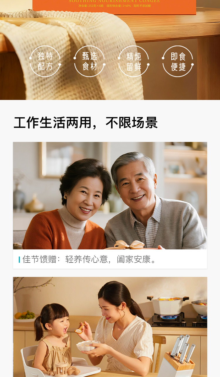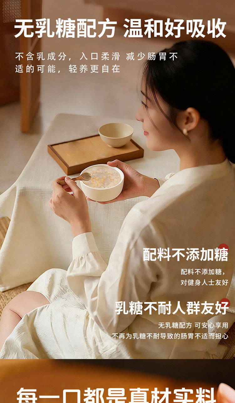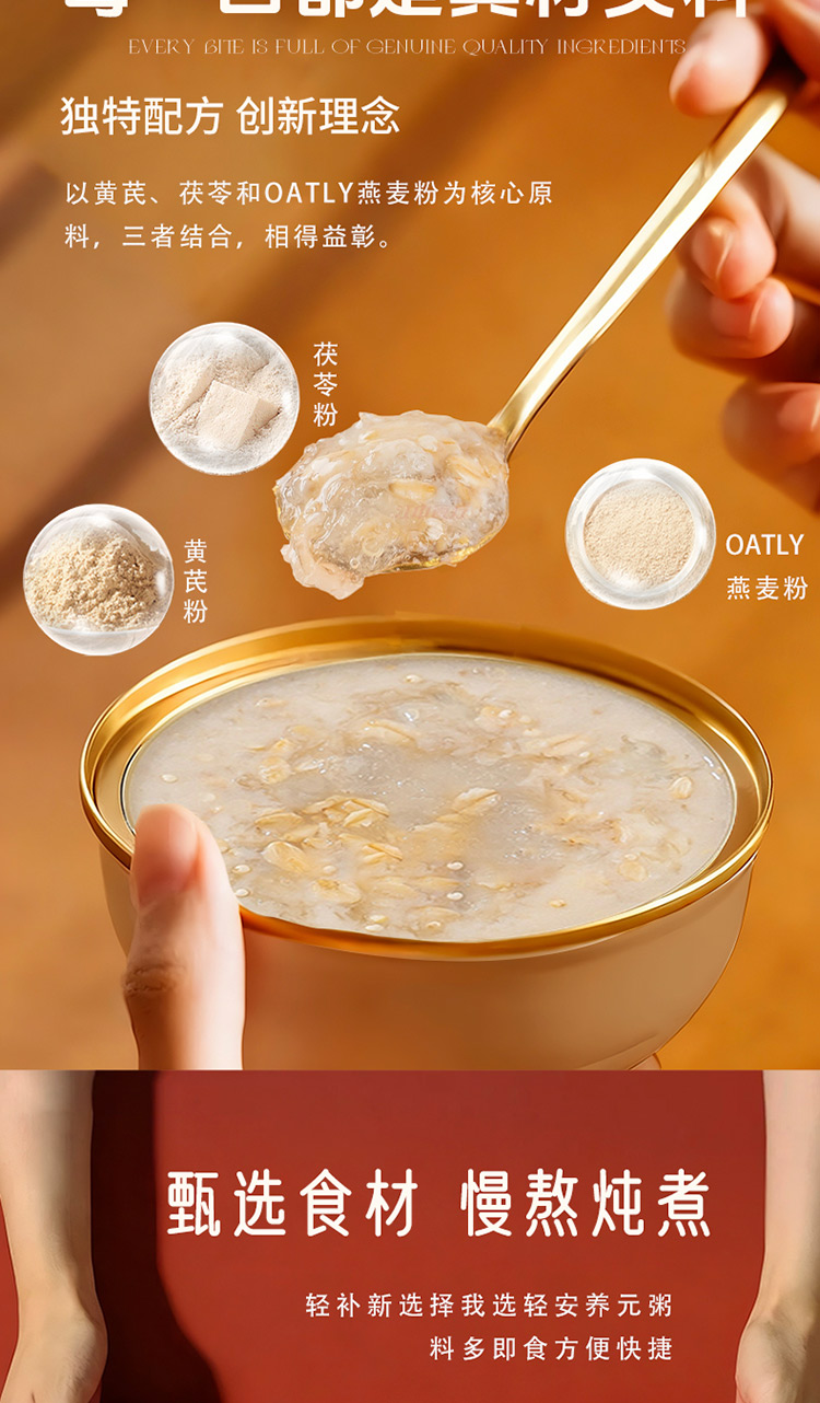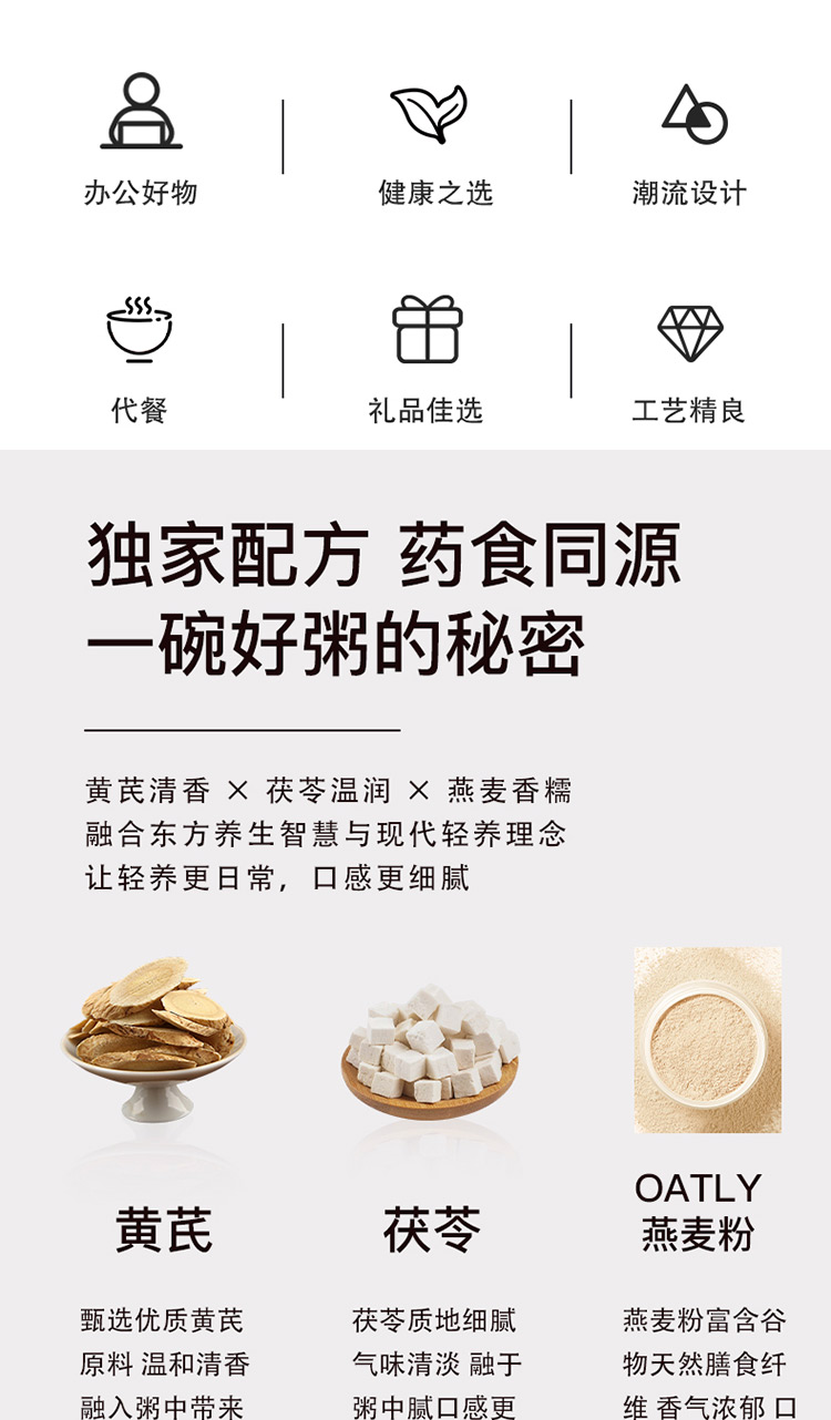 食材口感温润细腻,软糯香甜,黄芪、茯苓与燕麦粉的结合,浓而不腻,好吃健康无负担。 早晚代餐,营养一碗搞定。双低守护(低升糖),双高滋养(高蛋白、高膳食纤维),科学配比,成为健康稳糖新选择。 一盒6碗,无糖 老少皆宜,配料干净,坚持纯粹品质。
