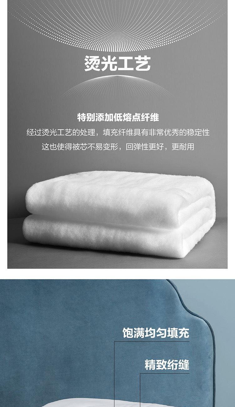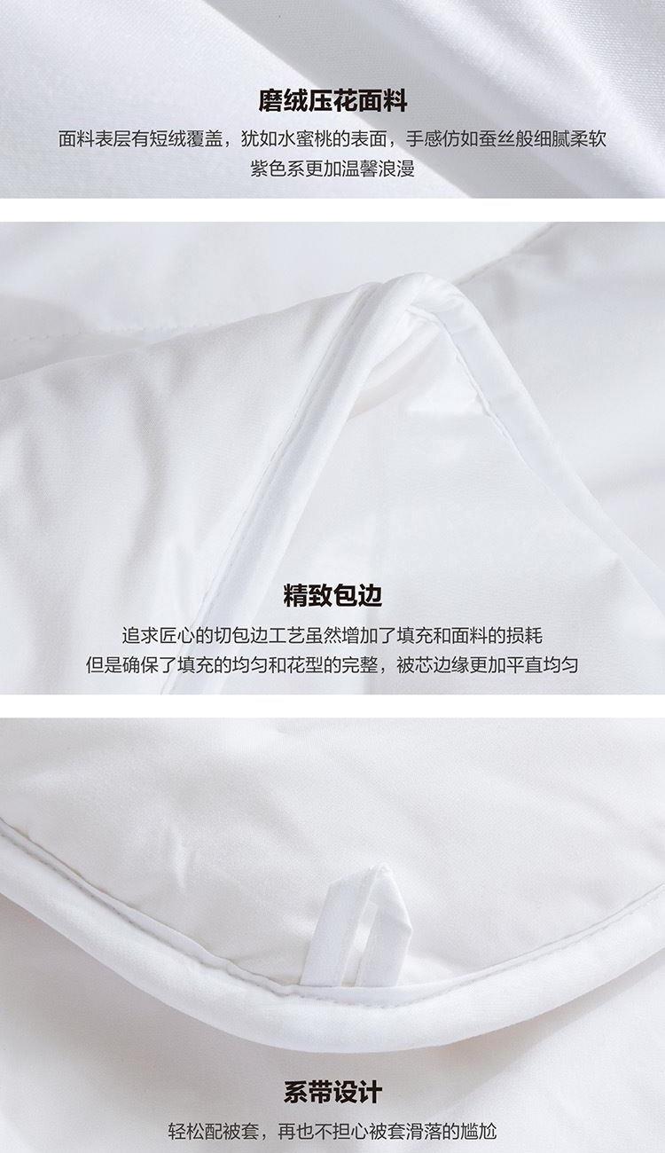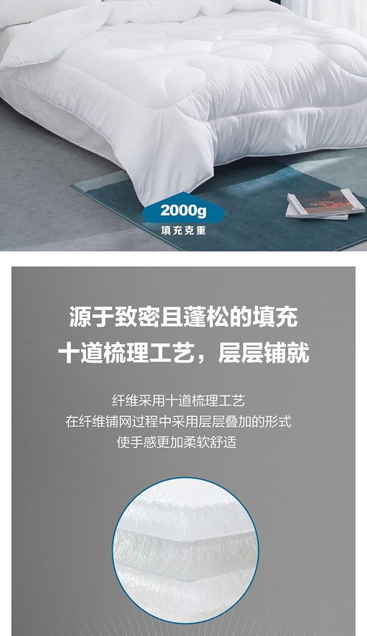 面料材质:聚酯纤维 填充材质:聚酯纤维(七孔纤维) 规格尺寸:200*230cm 填充重量:2000g 采用桃皮绒磨毛压花面料,表面附有细密的绒毛,手感绵密,亲肤舒适; 填充优质七孔纤维,藕形七孔结构设计,孔形完整、壁厚均匀,将多孔和三维卷曲的优势相结合,松回弹好,增强了纤维的抱合力,保暖更好;其他纤维比,蓬松度,保暖性,及耐用性综合指数佳。