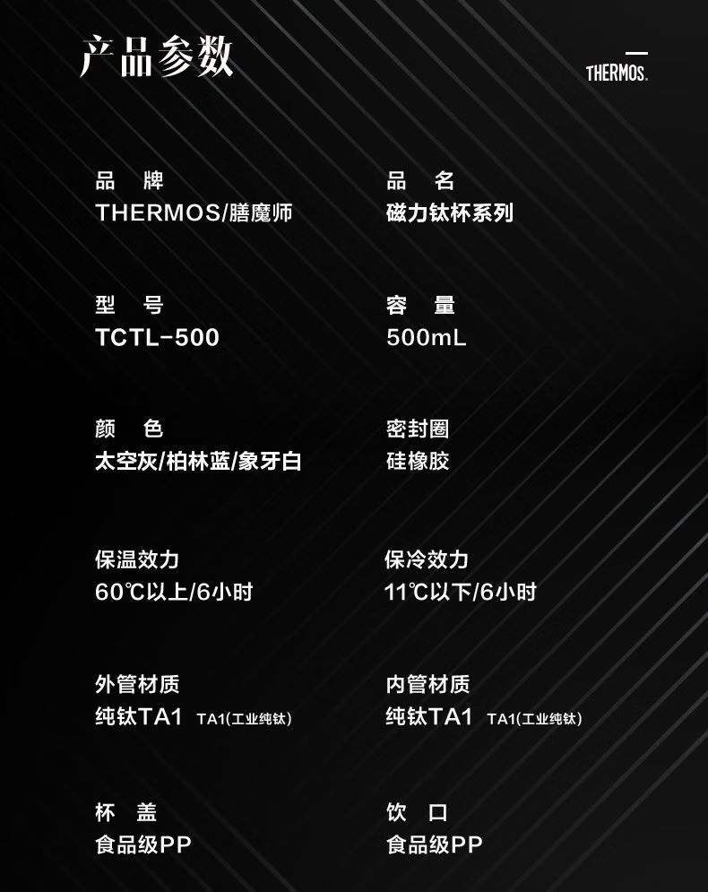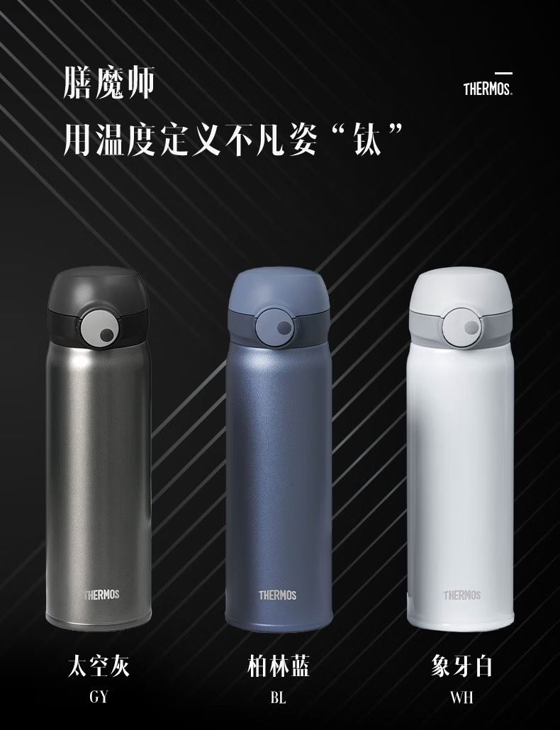 颜 色:WH象牙白 BL 柏林蓝 GY太空灰 容 量:500ml 类 型:单手易开型 定 制:可以定制 材 质:纯钛 保 温:6小时大约60°C 保 冷:6小时大约10°C