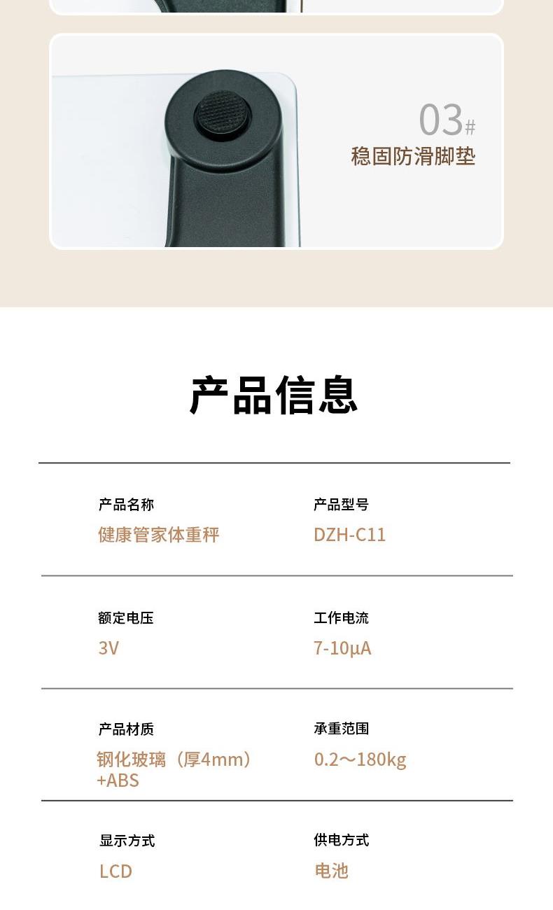 1. 灵敏感知细微浮动 2. LCD高清液晶屏,室温体重一目了然 3.智能感应开关节能省电,使用方便 4. 加大加厚钢化玻璃,无惧刮擦更耐用 5. 26cm圆角秤面,圆润不伤脚