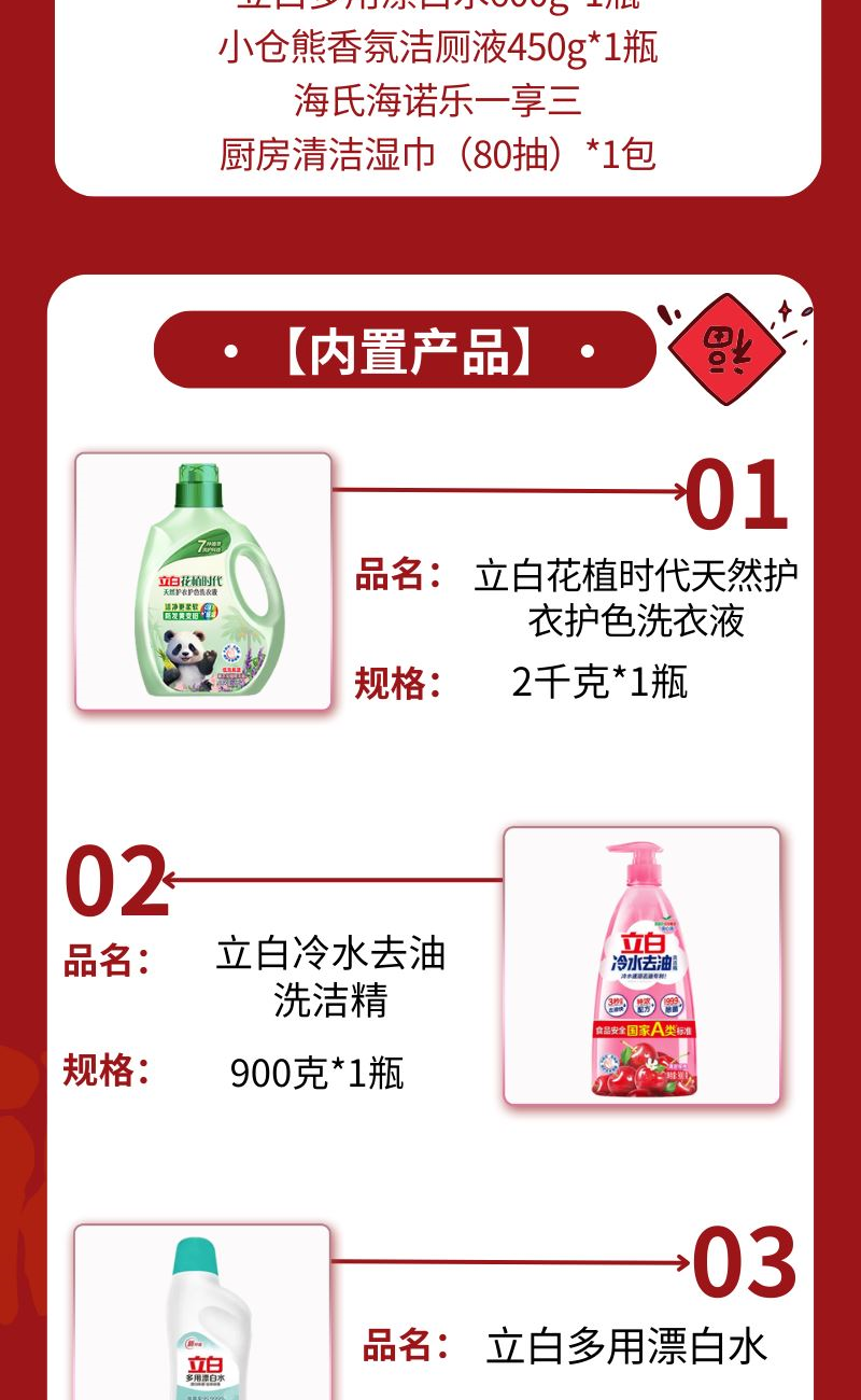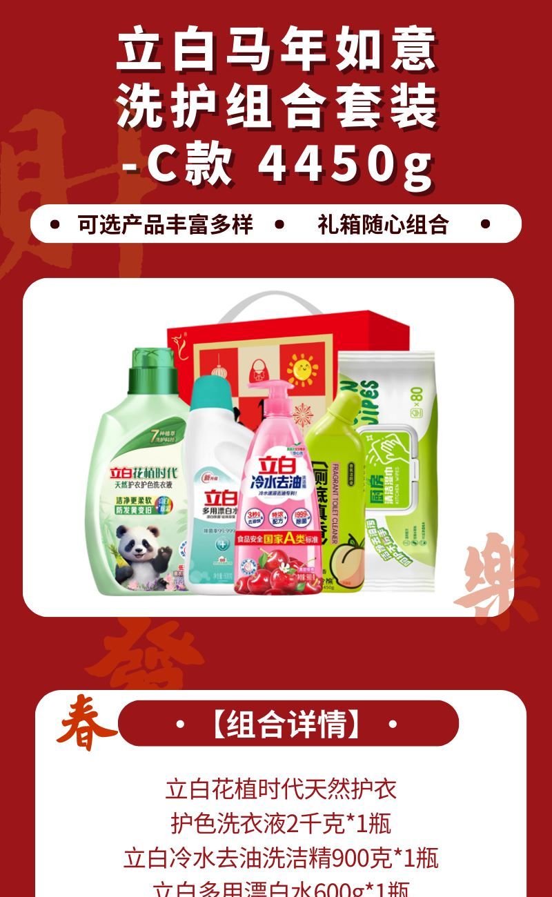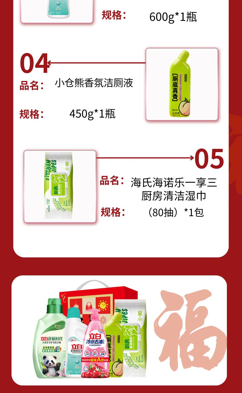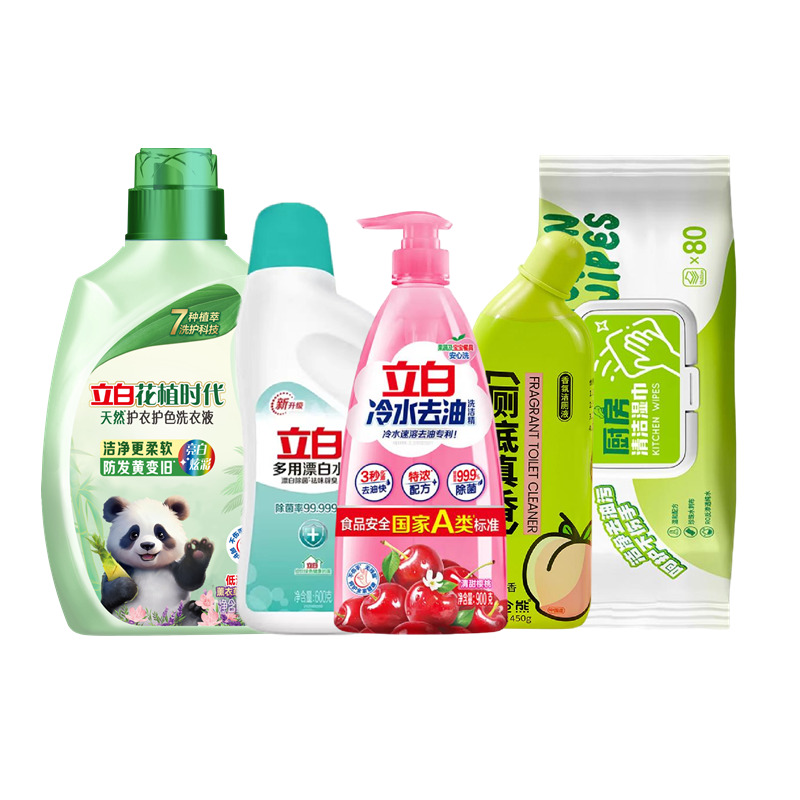 配置: 立白花植时代天然护衣护色洗衣液2千克*1瓶 立白冷水去油洗洁精900克*1瓶 立白多用漂白水600g*1瓶 小仓熊香氛洁厕液450g*1瓶 海氏海诺乐一享三厨房清洁湿巾(80抽)*1包 卖点: 可选产品丰富多样,礼箱随心组合,多种价位因需而定,充分满足各种送礼需求,是商务送礼、单位福利的用心之选。
