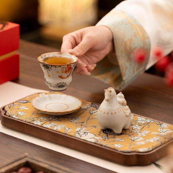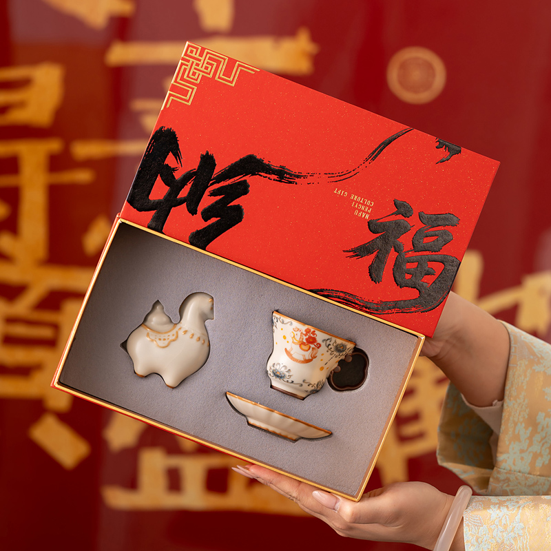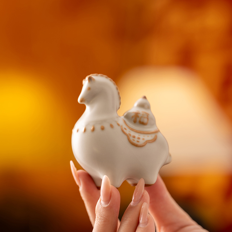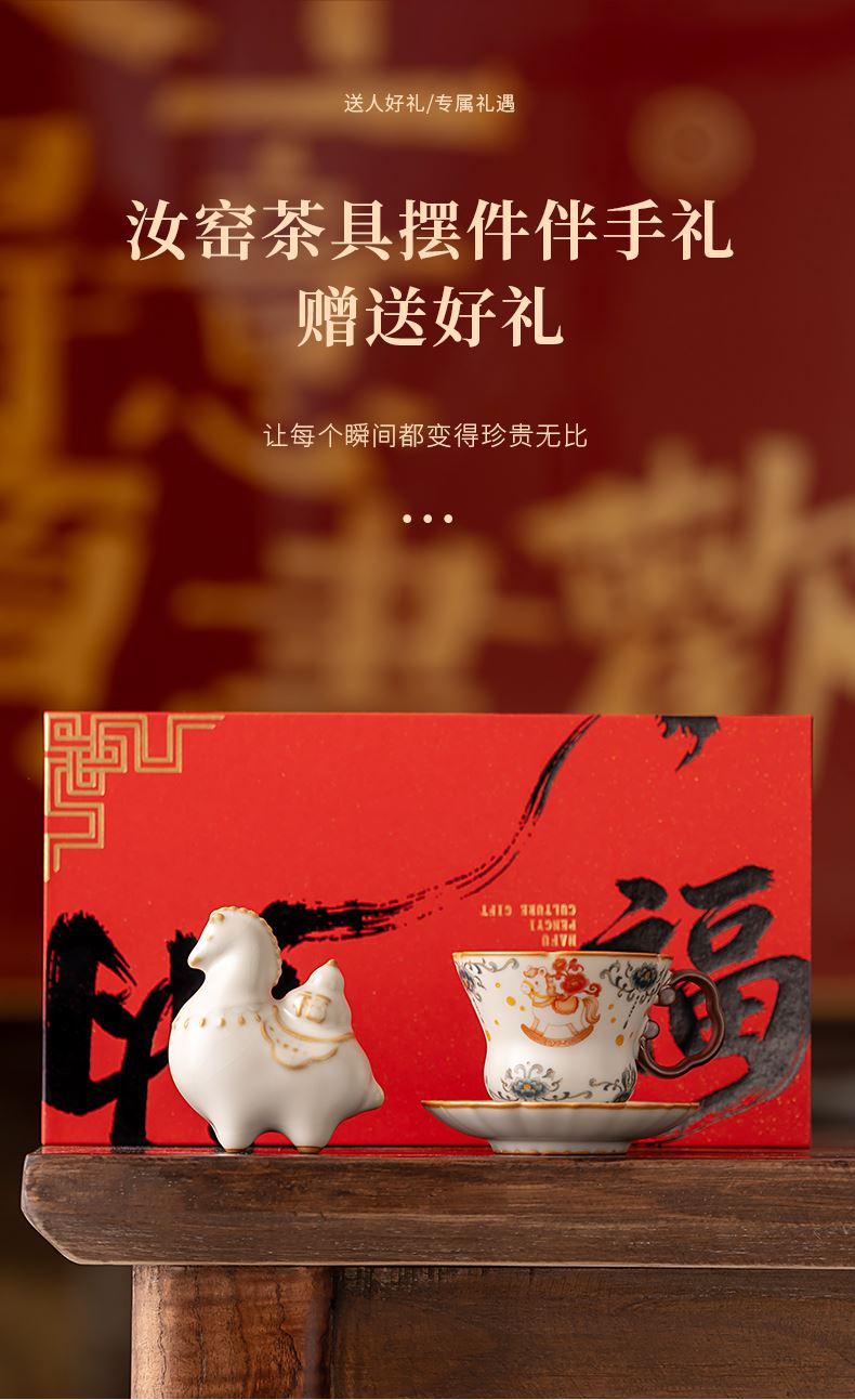 配 制:1杯 1碟 1摆件 1礼盒 手提袋 材质:汝黄瓷 规格:杯子 6*9cm 碟子直径9.3cm高1.8cm 摆件9.3*7cm 容量:70ml 推荐说明:马上有钱,马到成功杯子摆件套装,马背上葫芦造型,寓意福禄。亚黄汝瓷,玛瑙入釉,蝉翼开片,家有千财万贯,不如汝窑一片。技术新品。画面堆料技术,富有立体浮雕质感,真实感强。杯身开片,可养瓷。