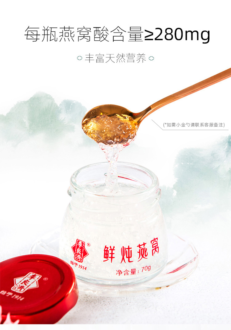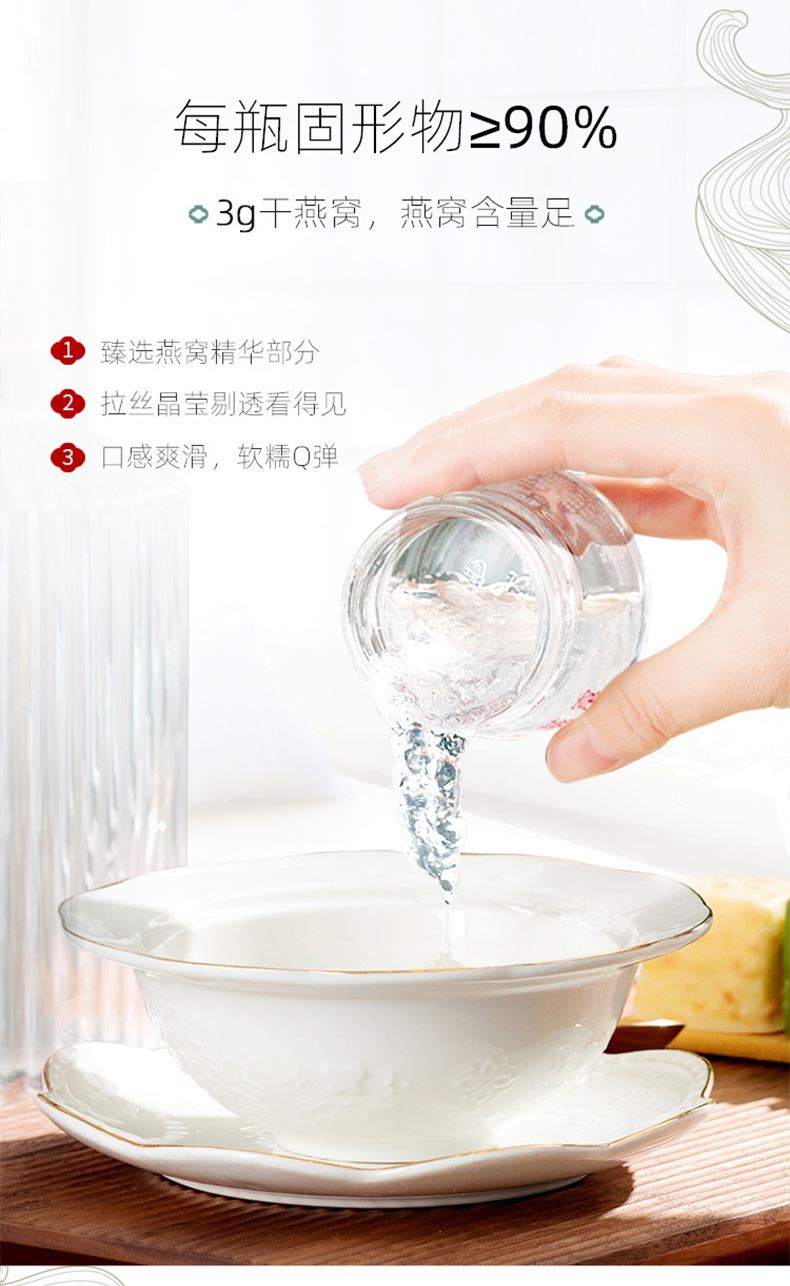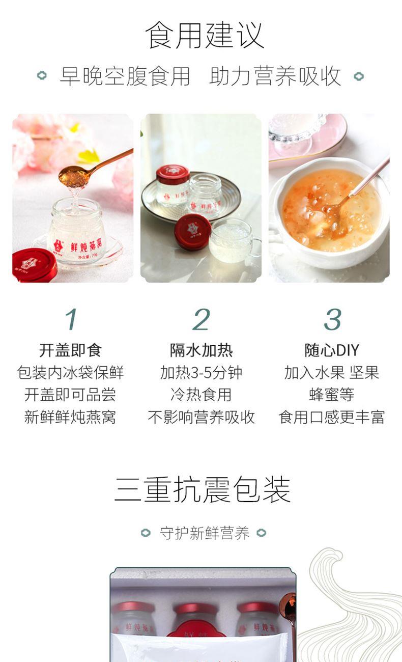 产品:鲜炖燕窝 规格:净含量210克(70g*3瓶) 当天鲜炖,当天发出, 冷鲜配送,顺丰航空。 可以根据持有的卡兑换,干燕窝含量3克每瓶 固体物≥90%,燕窝酸含量≥280MG每瓶